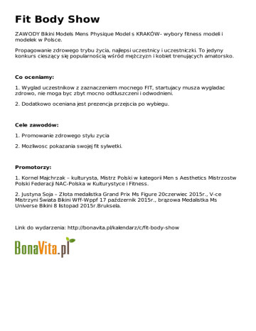 Fit Body Show ZAWODY Bikini Models Mens Physique Model s KRAKÓW- wybory fitness modeli i modelek w Polsce. Propagowanie zdrowego trybu życia, najlepsi uczestnicy i uczestniczki. To jedyny konkurs cieszący się popularnością wśród mężczyzn i kobiet trenujących amatorsko. Co oceniamy: 1. Wyglad uczestnikow z zaznaczeniem mocnego FIT, startujacy musza wygladac zdrowo, nie moga byc zbyt mocno odtluszczeni i odwodnieni. 2. Dodatkowo oceniana jest prezencja przejscia po wybiegu. Cele zawodów: 1. Promowanie zdrowego stylu zycia 2. Mozliwosc pokazania swojej fit sylwetki. Promotorzy: 1. Kornel Majchrzak – kulturysta, Mistrz Polski w kategorii Men s Aesthetics Mistrzostw Polski Federacji NAC-Polska w Kulturystyce i Fitness. 2. Justyna Soja – Złota medalistka Grand Prix Ms Figure 20czerwiec 2015r., V-ce Mistrzyni Świata Bikini Wff-Wppf 17 paźdzernik 2015r., brązowa Medalistka Ms Universe Bikini 8 listopad 2015r.Bruksela. Link do wydarzenia: http://bonavita.pl/kalendarz/c/fit-body-show