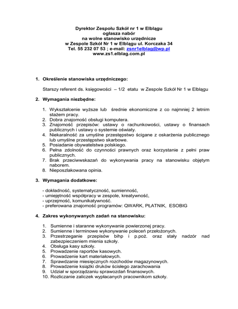 Dyrektor Zespołu Szkół nr 1 w Elblągu ogłasza nabór na wolne stanowisko urzędnicze w Zespole Szkół Nr 1 w Elblągu ul. Korczaka 34 Tel. 55 232 07 53 ; e-mail: [email protected] www.zs1.elblag.com.pl 1. Określenie stanowiska urzędniczego: Starszy referent ds. księgowości – 1/2 etatu w Zespole Szkół Nr 1 w Elblągu 2. Wymagania niezbędne: 1. Wykształcenie wyższe lub średnie ekonomiczne z co najmniej 2 letnim stażem pracy. 2. Dobra znajomość obsługi komputera. 3. Znajomość przepisów: ustawy o rachunkowości, ustawy o finansach publicznych i ustawy o systemie oświaty. 4. Niekaralność za umyślne przestępstwo ścigane z oskarżenia publicznego lub umyślne przestępstwo skarbowe. 5. Posiadanie obywatelstwa polskiego. 6. Pełna zdolność do czynności prawnych oraz korzystanie z pełni praw publicznych. 7. Brak przeciwwskazań do wykonywania pracy na stanowisku objętym naborem. 8. Nieposzlakowana opinia. 3. Wymagania dodatkowe: - dokładność, systematyczność, sumienność, - umiejętność współpracy w zespole, kreatywność, - uprzejmość, komunikatywność. - preferowana znajomość programów: QWARK, PŁATNIK, ESOBIG 4. Zakres wykonywanych zadań na stanowisku: 1. Sumienne i staranne wykonywanie powierzonej pracy. 2. Sumienne i terminowe wykonywanie poleceń przełożonych. 3. Przestrzeganie przepisów bihp i p.poż. oraz stały zabezpieczeniem mienia szkoły. 4. Obsługa kasy szkoły. 5. Prowadzenie raportów kasowych. 6. Prowadzenie kart materiałowych. 7. Sprawdzanie miesięcznych rozchodów magazynowych. 8. Prowadzenie książki druków ścisłego zarachowania 9. Udział w sporządzaniu sprawozdań finansowych. 10. Rozliczanie zaliczek wypłacanych pracownikom szkoły. nadzór nad 11. Rozliczanie inwentaryzacji szkoły. 12. Wykonywanie innych czynności zleconych przez dyrektora szkoły i głównego księgowego. 5. Wymagane dokumenty: - życiorys (CV), - list motywacyjny, - oświadczenie kandydata o niekaralności za umyślne przestępstwo ścigane z oskarżenia publicznego lub umyślne przestępstwo skarbowe, - oświadczenie o zdolności do czynności prawnych oraz korzystaniu z pełni praw publicznych, - kserokopie dyplomów potwierdzających wykształcenie, - oryginał kwestionariusza osobowego, - kserokopie świadectw pracy, - inne dodatkowe dokumenty o posiadanych kwalifikacjach i umiejętnościach, opinie, referencje Wymagane dokumenty należy: przesyłać pocztą na adres: Zespół Szkół Nr 1 w Elblągu ul. Korczaka 34 82-300 Elbląg lub składać osobiście w sekretariacie szkoły, w terminie od 10.05.2010r. do 21 .05.2010r. w zamkniętych kopertach z następującą adnotacją: „Nabór na stanowisko urzędnicze – starszy referent ds. księgowości– 1/2 etatu w Zespole Szkół Nr 1 w Elblągu” w terminie do 21 maja 2010r. Oferty, które wpłyną do szkoły po wyżej określonym terminie nie będą rozpatrywane. Informacja o wyniku naboru będzie umieszczona w: Biuletynie Informacji Publicznej Zespołu Szkół nr 1 na stronie internetowej / www.zs1.elblag.com.pl /, na tablicy ogłoszeń w Zespole Szkół nr 1oraz w Biuletynie Informacji Publicznej (BIP) na stronie internetowej Urzędu Miejskiego w Elblągu / www.umelblag.pl / ............................................................................................................... Wymagane dokumenty: list motywacyjny, szczegółowe CV (z uwzględnieniem dokładnego przebiegu kariery zawodowej), powinny być opatrzone klauzulą: ”Wyrażam zgodę na przetwarzanie moich danych osobowych zawartych w ofercie pracy dla potrzeb niezbędnych do realizacji procesu rekrutacji zgodnie z ustawą z dnia 29.08.1997r. o ochronie danych osobowych (Dz. U. z 2002r. Nr 101, poz. 926 ze zmianami) oraz ustawą z dnia 21.XI.2008r. o pracownikach samorządowych (Dz. U. z 2008r. Nr 223, poz. 1458)”.