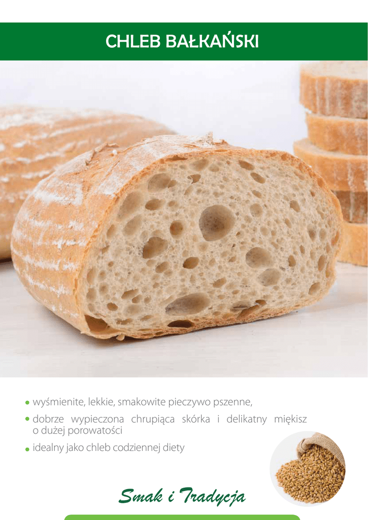 , CHLEB BAŁKANSKI wyśmienite, lekkie, smakowite pieczywo pszenne, dobrze wypieczona chrupiąca skórka i delikatny miękisz o dużej porowatości idealny jako chleb codziennej diety , CHLEB BAŁKANSKI 10 % MIESZANKA MACZNA Opis produktu: Mieszanka CHLEB BAŁKAŃSKI ma zastosowanie do wypieku lekkiego chleba o dobrze wypieczonej skórce i zwiększonej porowatości miękiszu. Jest to pieczywo pszenne, delikatne o dużej objętości. Zawiera dodatek prażonego jęczmienia i żyta. Wyśmienity w codziennej diecie. Receptura podstawowa: Cena/kg Składnik Mieszanka„Chleb Bałkański” Mąka pszenna TYP 750 Mąka żytnia TYP 720 Drożdże Sól Woda RAZEM ,, Wartosc 1 kg 8 kg 2 kg 0,4 kg 0,18 kg ok. 7-8 litrów 19,58 kg Cena 1 kg 1 szt. Sposób przygotowania: Wszystkie składniki wsypać do dzieży i sporządzić ciasto. Pozostawić do fermentacji wstępnej. Podzielić na kęsy. Pozostawić do fermentacji końcowej. Wypiekać. Parametry procesu Mieszanie wolne / szybkie Fermentacja wstępna / końcowa Wypiek 4/7 minut 30/40-60 minut 30-35 minut 26-30°C 240-210°C . Wazne: Uzyskać maksymalny rozrost w fermentacji końcowej. Parametry procesu dotyczą kęsów o naważce 500 g. www.facebook.com/Ecotrade.gliwice PRODUCENT DODATKÓW DLA PIEKARNI I CUKIERNI ET Sp. z o.o. 44-100 Gliwice, ul. Okrężna 8 tel. (32) 231 20 87-88 faks (32) 231 20 88 wew. 102 [email protected], www.ecotrade.pl 50419703