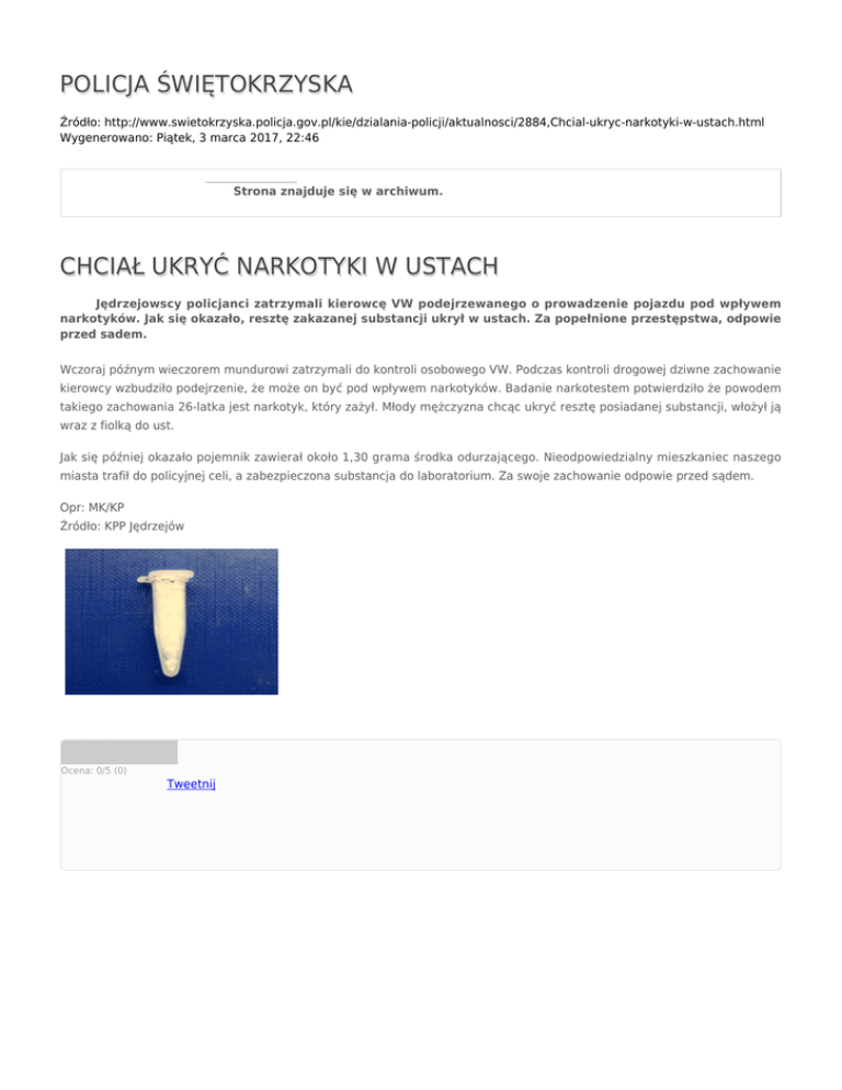 POLICJA ŚWIĘTOKRZYSKA Źródło: http://www.swietokrzyska.policja.gov.pl/kie/dzialania-policji/aktualnosci/2884,Chcial-ukryc-narkotyki-w-ustach.html Wygenerowano: Piątek, 3 marca 2017, 22:46 Strona znajduje się w archiwum. CHCIAŁ UKRYĆ NARKOTYKI W USTACH Jędrzejowscy policjanci zatrzymali kierowcę VW podejrzewanego o prowadzenie pojazdu pod wpływem narkotyków. Jak się okazało, resztę zakazanej substancji ukrył w ustach. Za popełnione przestępstwa, odpowie przed sadem. Wczoraj późnym wieczorem mundurowi zatrzymali do kontroli osobowego VW. Podczas kontroli drogowej dziwne zachowanie kierowcy wzbudziło podejrzenie, że może on być pod wpływem narkotyków. Badanie narkotestem potwierdziło że powodem takiego zachowania 26-latka jest narkotyk, który zażył. Młody mężczyzna chcąc ukryć resztę posiadanej substancji, włożył ją wraz z fiolką do ust. Jak się później okazało pojemnik zawierał około 1,30 grama środka odurzającego. Nieodpowiedzialny mieszkaniec naszego miasta trafił do policyjnej celi, a zabezpieczona substancja do laboratorium. Za swoje zachowanie odpowie przed sądem. Opr: MK/KP Źródło: KPP Jędrzejów Ocena: 0/5 (0) Tweetnij