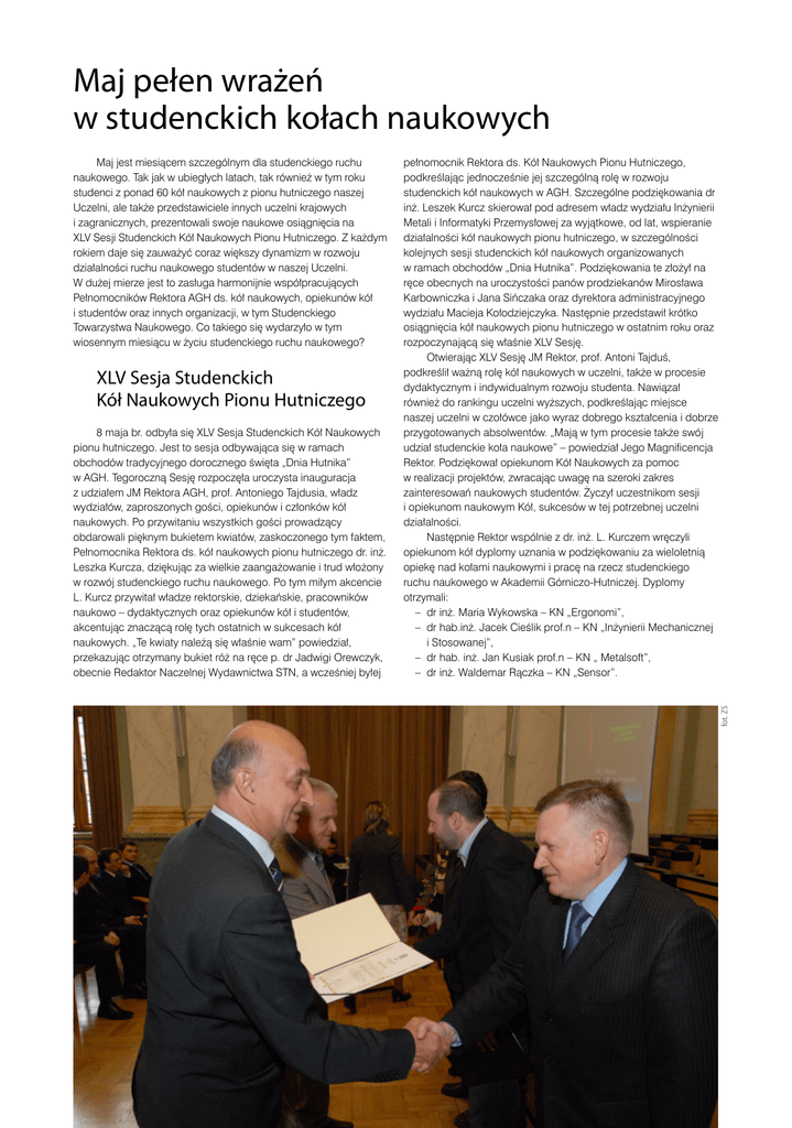 Maj pełen wrażeń w studenckich kołach naukowych XLV Sesja Studenckich Kół Naukowych Pionu Hutniczego 8 maja br. odbyła się XLV Sesja Studenckich Kół Naukowych pionu hutniczego. Jest to sesja odbywająca się w ramach obchodów tradycyjnego dorocznego święta „Dnia Hutnika” w AGH. Tegoroczną Sesję rozpoczęła uroczysta inauguracja z udziałem JM Rektora AGH, prof. Antoniego Tajdusia, władz wydziałów, zaproszonych gości, opiekunów i członków kół naukowych. Po przywitaniu wszystkich gości prowadzący obdarowali pięknym bukietem kwiatów, zaskoczonego tym faktem, Pełnomocnika Rektora ds. kół naukowych pionu hutniczego dr. inż. Leszka Kurcza, dziękując za wielkie zaangażowanie i trud włożony w rozwój studenckiego ruchu naukowego. Po tym miłym akcencie L. Kurcz przywitał władze rektorskie, dziekańskie, pracowników naukowo – dydaktycznych oraz opiekunów kół i studentów, akcentując znaczącą rolę tych ostatnich w sukcesach kół naukowych. „Te kwiaty należą się właśnie wam” powiedział, przekazując otrzymany bukiet róż na ręce p. dr Jadwigi Orewczyk, obecnie Redaktor Naczelnej Wydawnictwa STN, a wcześniej byłej pełnomocnik Rektora ds. Kół Naukowych Pionu Hutniczego, podkreślając jednocześnie jej szczególną rolę w rozwoju studenckich kół naukowych w AGH. Szczególne podziękowania dr inż. Leszek Kurcz skierował pod adresem władz wydziału Inżynierii Metali i Informatyki Przemysłowej za wyjątkowe, od lat, wspieranie działalności kół naukowych pionu hutniczego, w szczególności kolejnych sesji studenckich kół naukowych organizowanych w ramach obchodów „Dnia Hutnika”. Podziękowania te złożył na ręce obecnych na uroczystości panów prodziekanów Mirosława Karbowniczka i Jana Sińczaka oraz dyrektora administracyjnego wydziału Macieja Kołodziejczyka. Następnie przedstawił krótko osiągnięcia kół naukowych pionu hutniczego w ostatnim roku oraz rozpoczynającą się właśnie XLV Sesję. Otwierając XLV Sesję JM Rektor, prof. Antoni Tajduś, podkreślił ważną rolę kół naukowych w uczelni, także w procesie dydaktycznym i indywidualnym rozwoju studenta. Nawiązał również do rankingu uczelni wyższych, podkreślając miejsce naszej uczelni w czołówce jako wyraz dobrego kształcenia i dobrze przygotowanych absolwentów. „Mają w tym procesie także swój udział studenckie koła naukowe” – powiedział Jego Magnificencja Rektor. Podziękował opiekunom Kół Naukowych za pomoc w realizacji projektów, zwracając uwagę na szeroki zakres zainteresowań naukowych studentów. Życzył uczestnikom sesji i opiekunom naukowym Kół, sukcesów w tej potrzebnej uczelni działalności. Następnie Rektor wspólnie z dr. inż. L. Kurczem wręczyli opiekunom kół dyplomy uznania w podziękowaniu za wieloletnią opiekę nad kołami naukowymi i pracę na rzecz studenckiego ruchu naukowego w Akademii Górniczo-Hutniczej. Dyplomy otrzymali: – dr inż. Maria Wykowska – KN „Ergonomi”, – dr hab.inż. Jacek Cieślik prof.n – KN „Inżynierii Mechanicznej i Stosowanej”, – dr hab. inż. Jan Kusiak prof.n – KN „ Metalsoft”, – dr inż. Waldemar Rączka – KN „Sensor”. fot. ZS Maj jest miesiącem szczególnym dla studenckiego ruchu naukowego. Tak jak w ubiegłych latach, tak również w tym roku studenci z ponad 60 kół naukowych z pionu hutniczego naszej Uczelni, ale także przedstawiciele innych uczelni krajowych i zagranicznych, prezentowali swoje naukowe osiągnięcia na XLV Sesji Studenckich Kół Naukowych Pionu Hutniczego. Z każdym rokiem daje się zauważyć coraz większy dynamizm w rozwoju działalności ruchu naukowego studentów w naszej Uczelni. W dużej mierze jest to zasługa harmonijnie współpracujących Pełnomocników Rektora AGH ds. kół naukowych, opiekunów kół i studentów oraz innych organizacji, w tym Studenckiego Towarzystwa Naukowego. Co takiego się wydarzyło w tym wiosennym miesiącu w życiu studenckiego ruchu naukowego? fot. ZS Pełnomocnik podziękował także opiekunom i jednocześnie wieloletnim koordynatorom poszczególnych sekcji tematycznych za pomoc i współpracę przy realizacji dużego przedsięwzięcia jakim są doroczne sesje studenckich kół naukowych. Także i im JM Rektor przyznał dyplomy uznania za zaangażowanie i pracę na rzecz studenckich kół naukowych. Dyplomy Rektora otrzymali: – prof. dr hab. inż. Barbara Florkowska – KN Elektroenergetyków „Piorun”, – dr inż. Barbara Kawecka-Magiera – KN Informatyków „Kernel”, – dr hab. inż. Barbara Małecka – KN „Nucleus”, – dr inż. Barbara Olszowska-Sobieraj – KN „Zgarek”, – dr hab. inż. Andrzej Bień – KN „Ecart”, – dr inż. Wojciech Ciesielka – KN „MechaBajt”, – dr inż. Zbigniew Damijan – KN Inżynierii Biomedycznej i Bioniki, – dr inż. Mariusz Gibiec – KN Robotyków „Cyborg”, – dr inż.Andrzej Gołdasz – KN Energetyków „Caloria”, – dr inż. Marek Iwaniec – KN Akustyki Strukturalnej, – dr hab.inż. Mirosław Karbowniczek prof.n – KN Metalurgii Surówki i Stali, – dr inż. Stanisław Krawczyk – KN Mechaników, – dr inż. Mirosław Kwiatkowski – KN ”Green Energy”, – dr inż. Grzegorz Michta – KN Metaloznawców, – prof. dr hab. inż. Borys Mikułowski – KN “Tytan”, – dr inż. Adam Penczek – KN Elektroniki Przemysłowej, – dr inż. Waldemar Pichór – KN Ceramików „Ceramit”, – dr inż. Stanisław Pietrzyk – KN Metalurgów „De Re Metallica”, – dr hab. inż. Andrzej Skulimowski – KN Modelowania w Finansach, – dr hab. inż. Andrzej Świątoniowski prof. n – KN Urządzeń Technologicznych i Ochrony Środowiska, – dr hab.inż. Stanisław Turczyn prof.n – KN Przeróbki Plastycznej Metali „Hefajstos”, – dr inż. Zbigniew Waradzyn – KN Elektrotermii – „Elterma”, – dr inż. Marek Woch – KN Fizyków „Bozon”, – dr inż. Mare