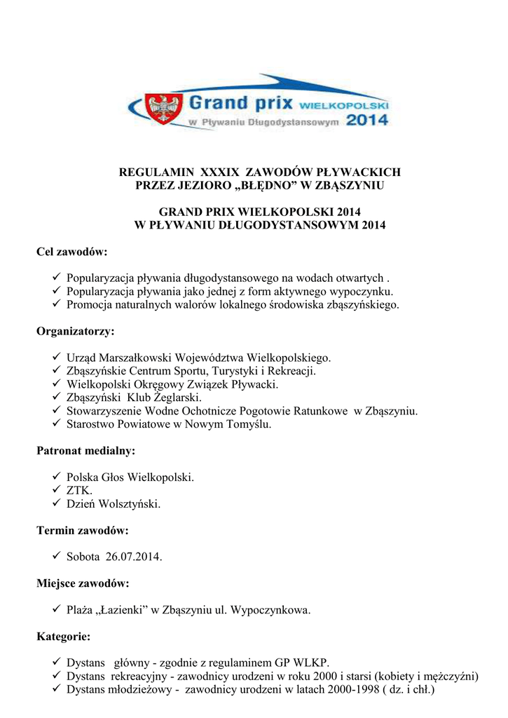 REGULAMIN XXXIX ZAWODÓW PŁYWACKICH PRZEZ JEZIORO „BŁĘDNO” W ZBĄSZYNIU GRAND PRIX WIELKOPOLSKI 2014 W PŁYWANIU DŁUGODYSTANSOWYM 2014 Cel zawodów: Popularyzacja pływania długodystansowego na wodach otwartych . Popularyzacja pływania jako jednej z form aktywnego wypoczynku. Promocja naturalnych walorów lokalnego środowiska zbąszyńskiego. Organizatorzy: Urząd Marszałkowski Województwa Wielkopolskiego. Zbąszyńskie Centrum Sportu, Turystyki i Rekreacji. Wielkopolski Okręgowy Związek Pływacki. Zbąszyński Klub Żeglarski. Stowarzyszenie Wodne Ochotnicze Pogotowie Ratunkowe w Zbąszyniu. Starostwo Powiatowe w Nowym Tomyślu. Patronat medialny: Polska Głos Wielkopolski. ZTK. Dzień Wolsztyński. Termin zawodów: Sobota 26.07.2014. Miejsce zawodów: Plaża „Łazienki” w Zbąszyniu ul. Wypoczynkowa. Kategorie: Dystans główny - zgodnie z regulaminem GP WLKP. Dystans rekreacyjny - zawodnicy urodzeni w roku 2000 i starsi (kobiety i mężczyźni) Dystans młodzieżowy - zawodnicy urodzeni w latach 2000-1998 ( dz. i chł.) Dystans dziecięcy – zawodnicy urodzeni w latach 2001 i młodsi ( dz. i chł.) Dystanse: Trasa główna 3000 m oznaczona wyraźnymi bojami. Trasa rekreacyjna ok.1800 m oznaczona bojami. Trasa dla młodzieży ok. 400 m oznaczona bojami. Trasy dla dzieci ok. 100 m oznaczona bojami. Trasa dla początkujących ok.25 m. Meta wszystkich kategorii na wysokości pomostu plaży „Łazienki” w Zbąszyniu. Uczestnictwo: W zawodach na dystansie głównym mogą uczestniczyć osoby, które ukończyły 13 lat. Warunkiem uczestnictwa jest dokonanie pisemnego zgłoszenia na kartach przygotowanych przez organizatora. Każdy uczestnik startuje na własną odpowiedzialność. W przypadku zawodników niepełnoletnich obowiązkowa jest pisemna zgoda rodziców (prawnych opiekunów) na udział w zawodach. Przepisy Techniczne: Zawody zostaną przeprowadzone zgodnie z przepisami PZP, dozwolone są tylko stroje tekstylne. Zawodnicy uczestniczący w Grand Prix mają prawo: - pokryć ciało warstwą substancji zabezpieczających przed obniżeniem jego temperatury w wodzie; - użyć okularków wodoszczelnych, klipsów na nos i zatyczek do uszu; - wycofać się z zawodów na własną prośbę. Zawodnicy biorący udział w Grand Prix Wielkopolski nie mogą: - korzystać w czasie wyścigu ze sprzętu ułatwiającego pływanie; - używać pianek; - korzystać z pomocy osób niezwiązanych z wyścigiem w czasie jego trwania. Zawodnicy biorący udział w Grand Prix Wielkopolski zobowiązani są do: - okazania dowodu tożsamości przy rejestracji; - podporządkowania się decyzjom komisji sędziowskiej; - przestrzegania regulaminu zawodów; - wpisania na widocznym miejscu numeru startowego. - podpisania własnoręcznie oświadczenia przygotowanego przez organizatora, w którym stwierdzają swoją zdolność do udziału w zawodach Grand Prix, oraz że startują na własną odpowiedzialność i nie będą wnosić żadnych pretensji do organizatorów w razie ewentualnego uszczerbku na zdrowiu w wyniku startu w zawodach – dotyczy zawodników pełnoletnich; - zawodnicy niepełnoletni zobowiązani są do dostarczenia pisemnej zgody rodziców lub opiekunów prawnych na udział w zawodach oraz oświadczenia jak dla zawodników pełnoletnich, podpisanego przez rodziców lub opiekunów prawnych. Komisja sędziowska: Zawody sędziują, sędziowie wyznaczeni przez wielkopolskie kolegium Sędziów. Nagrody: Każdy zawodnik, który ukończy wyścig otrzymuje pamiątkowy medal. Dla zwycięzców we wszystkich kategoriach wiekowych (zgodnych z regulaminem Grand Prix Wielkopolski w Pływaniu Długodystansowym 2014) z podziałem na mężczyzn i kobiety medale, dyplomy i statuetki. Prowadzona będzie osobna klasyfikacja dla uczestników z gminy Zbąszyń. Puchar Starosty Nowotomyskiego dla najlepszego zawodnika z powiatu. Przewidziano wyróżnienie dla najstarszego uczestnika zawodów. Postanowienia końcowe: Wszelkie sprawy sporne rozstrzyga komisja sędziowska. Organizator nie ubezpiecza zawodników od następstw nieszczęśliwych wypadków. Organizator zapewnia opiekę medyczną. Za bezpieczeństwo uczestników odpowiadają ratownicy WOPR. Uczestników wyścigu głównego obowiązuje regulamin ogólny Grand Prix Wielkopolski w Pływaniu Długodystansowym 2014 Ostateczna interpretacja regulaminu należy do organizatora. Dane kontaktowe organizatora: Zbąszyńskie Centrum Sportu, Turystyki i Rekreacji ul. Mostowa 10 A 64-360 Zbąszyń tel./faks (68) 38 68 050 [email protected] www.centrumsportu-zbaszyn.pl Program minutowy zawodów: Godzina 10,00 - 11,45 zgłoszenia zawodników do wyścigu na dystansie głównym i rekreacyjnym Godzina 10,00 - 11,00 zgłoszenia zawodników do startu na pozostałych dystansach Godzina 11,30 – start wyścigu dla początkujących Godzina 11,40 – start wyścigu dziecięcego Godzina 11,50 – start wyścigu młodzieżowego Godzina 12,15 - otwarcie zawodów Godzina 12,20 - transport zawodników na miejsce startu Godzina 12,40 - start wyścigu głównego i rekreacyjnego Ok. godziny 14.30 – dekoracje i zakończenie zawodów URZĄD MARSZAŁKOWSKI POWIAT NOWOTOMYSKI ZBĄSZYŃ