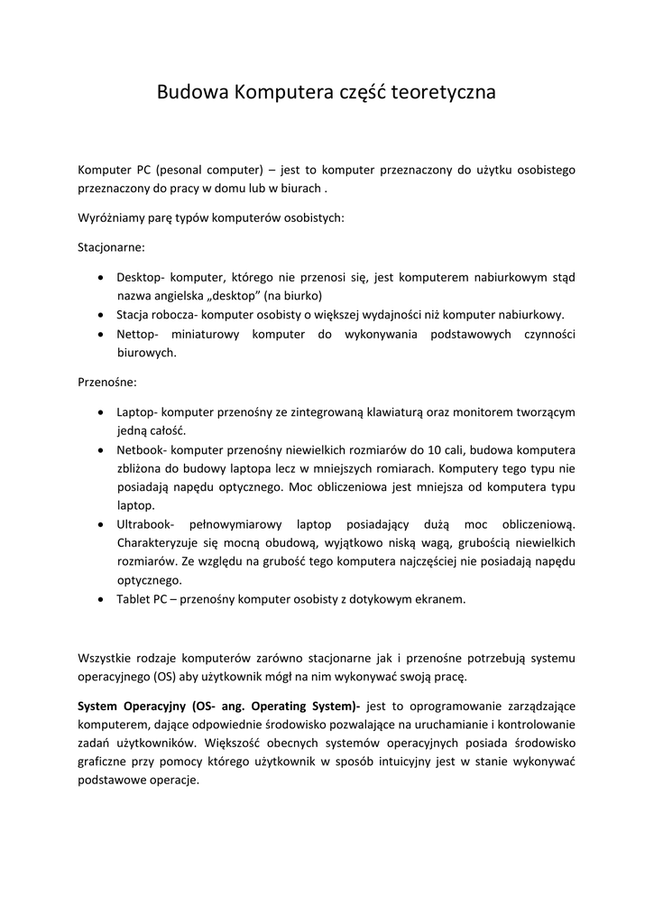 Budowa Komputera część teoretyczna Komputer PC (pesonal computer) – jest to komputer przeznaczony do użytku osobistego przeznaczony do pracy w domu lub w biurach . Wyróżniamy parę typów komputerów osobistych: Stacjonarne: Desktop- komputer, którego nie przenosi się, jest komputerem nabiurkowym stąd nazwa angielska „desktop” (na biurko) Stacja robocza- komputer osobisty o większej wydajności niż komputer nabiurkowy. Nettop- miniaturowy komputer do wykonywania podstawowych czynności biurowych. Przenośne: Laptop- komputer przenośny ze zintegrowaną klawiaturą oraz monitorem tworzącym jedną całość. Netbook- komputer przenośny niewielkich rozmiarów do 10 cali, budowa komputera zbliżona do budowy laptopa lecz w mniejszych romiarach. Komputery tego typu nie posiadają napędu optycznego. Moc obliczeniowa jest mniejsza od komputera typu laptop. Ultrabook- pełnowymiarowy laptop posiadający dużą moc obliczeniową. Charakteryzuje się mocną obudową, wyjątkowo niską wagą, grubością niewielkich rozmiarów. Ze względu na grubość tego komputera najczęściej nie posiadają napędu optycznego. Tablet PC – przenośny komputer osobisty z dotykowym ekranem. Wszystkie rodzaje komputerów zarówno stacjonarne jak i przenośne potrzebują systemu operacyjnego (OS) aby użytkownik mógł na nim wykonywać swoją pracę. System Operacyjny (OS- ang. Operating System)- jest to oprogramowanie zarządzające komputerem, dające odpowiednie środowisko pozwalające na uruchamianie i kontrolowanie zadań użytkowników. Większość obecnych systemów operacyjnych posiada środowisko graficzne przy pomocy którego użytkownik w sposób intuicyjny jest w stanie wykonywać podstawowe operacje. Obecnie najbardziej znane systemy operacyjne to: Windows 7 , Windows XP, Linux ( używane na komputerach osobistych); symbian, android (używane na urządzeniach mobilnych-tablet, smartfon) Aby użytkownik mógł wykonywać pracę na komputerze stacjonarnym potrzebne są dodatkowe elementy opisane ogólnie jako zestaw komputerowy Zestaw komputerowy PC składa się z: 1. 2. 3. 4. Jednostka centralna Klawiatura Myszka Monitor Są to cztery niezbędne elementy do pracy zestawu komputerowego. Dodatkowo do takiego zestawu mogą zostać podłączone dodatkowe urządzenia wejścia/wyjścia: Urządzenia wejścia: Myszka Klawiatura Mikrofon Skaner Kamera internetowa Urządzenia wyjścia: Drukarka Monitor Głośniki Ploter Słuchawki Projektor Skróty najczęściej używanych wejść komputerowych: USB- uniwersalna magistrala szeregowa, port komunikacyjny ( umożliwia podłączenie wiele różnych urządzeń do komputera takich jak pendrive, dysk zewnętrzny, kamera internetowa, myszka czy klawiatura) COM- port komunikacyjny PS/2-port komunikacyjny odpowiedzialny za komunikację między myszą lub klawiaturą a komputerem LPT1-port szeregowy do podłączenia drukarki W komputerze wyróżniamy dwa rodzaje pamięci: ROM i RAM Pamięć ROM- jest to rodzaj pamięci stałej, nieulotnej, która po wyłączeniu komputera nadal przechowuje informacje. Rysunek 1 Pamięć ROM Przykładem pamięci ROM jest pokazany na rysunku układ scalony BIOS. Bios- jest to układ scalony, na który zostały wgrane najważniejsze programy sterujące pracą wszystkich podzespołów. Jest to pierwszy program otwierający się przy włączaniu komputera. Pamięć RAM- jest to rodzaj pamięci ulotnej, operacyjnej. Po wyłączeniu komputera wszystkie informacje znajdujące się na takich pamięciach są wykasowane, jest to pamięć nietrwała. Do komputera dokładana w postaci kości pamięci (DDR, DDR2, DDR3) Rysunek 2 Pamięć RAM z wbudowanym radiatorem. Rysunek 3 Kość Pamięć RAM. Pod pojęciem „Pamięci” będziemy też rozumieli wszelkiego typu nośniki danych, które przechowują informacje (piki) w sposób trwały. Pendrive, płyty CD-ROM oraz DVD-ROM, dysk twardy są to pamięci masowe, trwałe i nieulotne. Dane na nich są przechowywane do czasu uszkodzenia danego nośnika lub wykasowania z niego danych przez użytkownika. Rysunek 4 Pendrive Rysunek 5 Dysk twardy. Rysunek 6 wnętrze dysku twardego. Widoczne talerze oraz pracująca głowica. Sposób wysyłania i odbierania informacji przez komputer. Wysyłanie oraz odbieranie informacji odbywa się poprzez specjalne karty umieszczone wewnątrz komputera (czasami poprzez zewnętrzne jeżeli jest to np. karta dźwiękowa zewnętrzna, wtedy informacje docierają do takiej karty a następnie poprzez odpowiednie wejście fireWire dociera do komputera gdzie jest dalej przetwarzana). Rysunek 7 Wejścia płyty głównej (PS/2, USB,VGA, AUDIO) Przykładowo do wyświetlenia grafiki potrzebna jest karta graficzna ,która może być zintegrowana z płytą główną lub dołożona w postaci karty montowanej na płycie głównej. Rysunek 8 karta grafiki z chłodzeniem pasywnym (radiator) Rysunek 9 Karta grafiki z chłodzeniem aktywnym ( wentylator) Nowoczesne karty grafiki posiadają możliwość łączenia się ze sobą w celu zwiększenia mocy obliczeniowej procesorów graficznych. Połączenie takie następuje poprzez odpowiednie taśmy. Do zamontowania takich kart graficznych jest wymagana odpowiednia ilość wejść na płycie głównej oraz odpowiednio mocny zasilacz. Rysunek 10 Przykład łączenia kart graficznych. Dźwięk zarówno wchodzący (mikrofon) jak i wychodzący(głośniki) przechodzi przez kartę dźwiękową. Podobnie jak wyżej karta taka może być zintegrowana lub dostawiona w postaci dodatkowej karty montowanej na płycie głównej. Rysunek 11 Karta dźwiękowa. Połączenie internetowe odbywa się przy pomocy kart sieciowych, w zależności od rodzaju karty sieciowej można uzyskać odpowiednie prędkości 10, 100, 1000 Mbit/s Rysunek 12 Karta sieciowa.