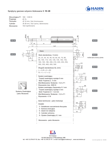 Sprężyny gazowe sztywno blokowane S GASFEDERN . . . . . . . . . . . . . . . . . . . . . . . . . . . . . . . . . . . . . . . . . . . . . . . . . . . . . . . . . . . . . . . . . . . . . . . . . . . . . . . . . . . . . . . . . . . . . . . . . . . . . . . . . . . . . . . . . . . . . . . . . . . . . . . . . . . . . . . . . . . . . . . . . . . . . . Siła pchająca F1 180 - 1200 N Progresja 45 % Tłoczysko Ø 10 mm, Stal chromowana Cylinder Ø 28 mm, Stal czarna, lakierowana Stal ocynkowana Mocowania Ø28 M8 Ø10 Ø4 M10x1 . . . . . . . . . . . . . . . . . . . . . . . . . . . . . . . . . . . . . . . . . . . . . . . . . . . . . . . . . . . . . . . . . . . . . . . . . . . . . . . . . . . . . . . . . . . . . . . . . . . . . . . . . . . . . . . . . . . . . . . . . . . . . . . . . . . . . . . . . . . . . . . . . . . . . . GZ 18 18 5 H L1 GZ 10 10 L±2 L2 8.1 Ø8 Dane 16 32 20, 25, 30, 35, 40, 50, 60, 65, 70, 80, 90, 100, 110, 120, 130, 135, 140, 150, 160, 165, 180, 200, 210, 220, 230, 250, 300, 350, 400, 450, 500 t=10 możliwe tylko od strony cylindra 16 8.1 . . . . . . . . . . . . . . . . . . . . . . . . . . . . . . . . . . . . . . . . . . . . . . . . . . . . Długość standardowa GL (mm) L = 2,45 x H + 80 GL = L + L1 + L2 AB 16 Ø14 8 Skok standardowy H (mm) Ø20 16 t=10 AU 19 19 8.1 t=5 AS 30 30 Ø8 16 8 Systemy Zwalniające - patrz Akcesoria System zwalniający Trzpień zwalniajacy wystaje 5 mm Skok Trzpienia 2 - 4 mm Siła Blokowania: Ściskanie ~ 5,5 x F1 Wysuwanie max. 3000 N System zwalniający Opcjonalny 0,1 mm Trzpień zwalniajacy wystaje 3 mm Skok Trzpienia 0,1 - 0,2 mm Siła Blokowania: Ściskanie ~ 5,5 x F1 Wysuwanie = 0 N Ø18 . . . . . . . . . . . . . . . . . . . . . . . . . . . . . . . . . . . . . . . . . . . . . . . . . . . . GA 32 16 32 M8 Dodatki 16 Dane techniczne - patrz Instrukcje . . . . . . . . . . . . . . . . . . . . . . . . . . . . . . . . . . . . . . . . . . . . . . . . . . . . SW13 3 - Dodatkowe uszczelnienie tłoczyska 4 - Komora smarująca 5 - Zawór do nabijania 6 - Cylinder ochronny 9 - System Zwalniający 0,1 mm 13 GX 32 WG 30 30 . . . . . . . . . . . . . . . . . . . . . . . . . . . . . . . . . . . . . . . . . . . . . . . . . . . . Mocowania - patrz Akcesoria . . . . . . . . . . . . . . . . . . . . . . . . . . . . . . . . . . . . . . . . . . . . . . . . . . . . EA Kraków 32-050 Skawina ul.Piłsudskiego 39B tel: +48 12 276-07-70, fax: +48 12 276-37-74 e-mail: [email protected] , www.ea.krakow.pl www.hahn-gasfedern.de 04/2008