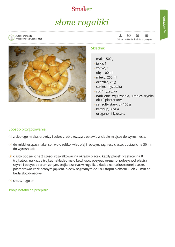 słone rogaliki Autor: anetaa26 Przepisów: 168 Ocena: 3188 5-6 os. > 60 min średnie przystępne Składniki: maka, 500g jajka, 1 zoltko, 1 olej, 100 ml mleko, 250 ml drozdze, 25 g cukier, 1 lyzeczka sol, 1 lyzeczka nadzienie, wg uznania, u mnie:, szynka, ok 12 plasterkow ser zolty stary, ok 100 g ketchup, 3 lyzki oregano, 1 lyzeczka Sposób przygotowania: 1 z cieplego mleka, drozdzy i cukru zrobic rozczyn, ostawic w cieple miejsce do wyrosniecia. 2 do miski wsypac make, sol, wbic zoltko, wlac olej i rozczyn, zagniesc ciasto. odstawic na 30 min do wyrosniecia. 3 ciasto podzielic na 2 czesci, rozwalkowac na okragly placek. kazdy placek przekroic na 8 trojkatow. na kazdy trojkat nakladac malo ketchupu. posypac oregano, polozyc pol plastra szynki i posypac serem zoltym. trojkat zwinac w rogalik. ukladac na natluszczonej blasze, posmarowac rozkloconym jajkiem, piec w nagrzanym do 180 stopni piekarniku ok 20 min az beda zlotobrazowe. 4 smacznego :)) Twoje notatki do przepisu: