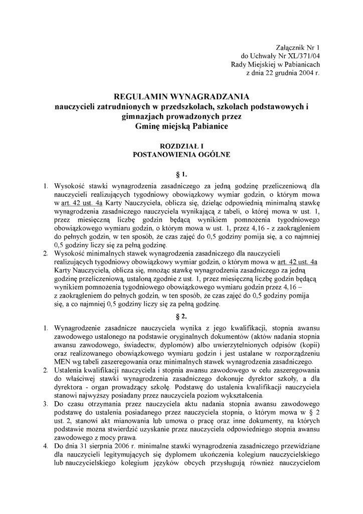 Załącznik Nr 1 do Uchwały Nr XL/371/04 Rady Miejskiej w Pabianicach z dnia 22 grudnia 2004 r. REGULAMIN WYNAGRADZANIA nauczycieli zatrudnionych w przedszkolach, szkołach podstawowych i gimnazjach prowadzonych przez Gminę miejską Pabianice ROZDZIAŁ I POSTANOWIENIA OGÓLNE § 1. 1. Wysokość stawki wynagrodzenia zasadniczego za jedną godzinę przeliczeniową dla nauczycieli realizujących tygodniowy obowiązkowy wymiar godzin, o którym mowa w art. 42 ust. 4a Karty Nauczyciela, oblicza się, dzieląc odpowiednią minimalną stawkę wynagrodzenia zasadniczego nauczyciela wynikającą z tabeli, o której mowa w ust. 1, przez miesięczną liczbę godzin będącą wynikiem pomnoŜenia tygodniowego obowiązkowego wymiaru godzin, o którym mowa w ust. 1, przez 4,16 - z zaokrągleniem do pełnych godzin, w ten sposób, Ŝe czas zajęć do 0,5 godziny pomija się, a co najmniej 0,5 godziny liczy się za pełną godzinę. 2. Wysokość minimalnych stawek wynagrodzenia zasadniczego dla nauczycieli realizujących tygodniowy obowiązkowy wymiar godzin, o którym mowa w art. 42 ust. 4a Karty Nauczyciela, oblicza się, mnoŜąc stawkę wynagrodzenia zasadniczego za jedną godzinę przeliczeniową, ustaloną zgodnie z ust. 1, przez miesięczną liczbę godzin będącą wynikiem pomnoŜenia tygodniowego obowiązkowego wymiaru godzin przez 4,16 – z zaokrągleniem do pełnych godzin, w ten sposób, Ŝe czas zajęć do 0,5 godziny pomija się, a co najmniej 0,5 godziny liczy się za pełną godzinę. § 2. 1. Wynagrodzenie zasadnicze nauczyciela wynika z jego kwalifikacji, stopnia awansu zawodowego ustalonego na podstawie oryginalnych dokumentów (aktów nadania stopnia awansu zawodowego, świadectw, dyplomów) albo uwierzytelnionych odpisów (kopii) oraz realizowanego obowiązkowego wymiaru godzin i jest ustalane w rozporządzeniu MEN wg tabeli zaszeregowania oraz minimalnych stawek wynagrodzenia zasadniczego. 2. Ustalenia kwalifikacji nauczyciela i stopnia awansu zawodowego w celu zaszeregowania do właściwej stawki wynagrodzenia zasadniczego dokonuje dyrektor szkoły, a dla dyrektora - organ prowadzący szkołę. Podstawę do ustalenia kwalifikacji nauczyciela stanowi najwyŜszy posiadany przez nauczyciela poziom wykształcenia. 3. Do czasu otrzymania przez nauczyciela aktu nadania stopnia awansu zawodowego podstawę do ustalenia posiadanego przez nauczyciela stopnia, o którym mowa w § 2 ust. 2, stanowi akt mianowania lub umowa o pracę oraz inne dokumenty, na których podstawie moŜna stwierdzić uzyskanie przez nauczyciela odpowiedniego stopnia awansu zawodowego z mocy prawa. 4. Do dnia 31 sierpnia 2006 r. minimalne stawki wynagrodzenia zasadniczego przewidziane dla nauczycieli legitymujących się dyplomem ukończenia kolegium nauczycielskiego lub nauczycielskiego kolegium języków obcych przysługują równieŜ nauczycielom posiadającym dyplom ukończenia studium nauczycielskiego lub pedagogicznego studium technicznego oraz nauczycielom, którzy do dnia wejścia w Ŝycie rozporządzenia uzyskali zaliczenie wszystkich przedmiotów i praktyk przewidzianych w programie wyŜszych studiów magisterskich lub - po dniu 1 stycznia 1990 r. - wyŜszego seminarium duchownego. 5. Nauczycielom legitymującym się dyplomem ukończenia studiów zawodowych w wyŜszych szkołach nauczycielskich lub dyplomem uzyskania kwalifikacji w trybie określonym w przepisach dotyczących egzaminu kwalifikacyjnego równowaŜnego wyŜszym studiom zawodowym przysługują minimalne stawki wynagrodzenia zasadniczego przewidziane dla nauczycieli legitymujących się tytułem zawodowym licencjata z przygotowaniem pedagogicznym. 6. Nauczycielom, którzy ukończyli do dnia 31 grudnia 1989 r. wyŜsze seminarium duchowne, przysługują minimalne stawki wynagrodzenia zasadniczego przewidziane dla nauczycieli legitymujących się tytułem zawodowym magistra. 7. Nauczycielom, którzy ukończyli kolegium teologiczne, przysługują minimalne stawki wynagrodzenia zasadniczego przewidziane dla nauczycieli legitymujących się dyplomem ukończenia kolegium nauczycielskiego lub nauczycielskiego kolegium języków obcych. ROZDZIAŁ II DODATEK ZA WYSŁUGĘ LAT § 3. 1. Nauczycielom przysługuje dodatek za wysługę lat w wysokości 1% wynagrodzenia zasadniczego za kaŜdy rok pracy, wypłacany w okresach miesięcznych, poczynając od 4 roku pracy, z tym Ŝe dodatek ten nie moŜe przekroczyć 20% wynagrodzenia zasadniczego. 2. Do okresów pracy uprawniających do dodatku za wysługę lat wlicza się okresy poprzedniego zatrudnienia we wszystkich zakładach pracy, bez względu na sposób ustania stosunku pracy. 3. Nauczycielowi pozostającemu jednocześnie w więcej niŜ jednym stosunku pracy okresy uprawniające do dodatku za wysługę lat ustala się odrębnie dla kaŜdego stosunku pracy, z zastrzeŜeniem ust. 4 i 5. Do okresu zatrudnienia uprawniającego do dodatku za wysługę lat nie wlicza się okresu pracy w innym zakładzie, w którym pracownik jest lub był jednocześnie zatrudniony. Do okresu dodatkowego zatrudnienia nie podlegają zaliczeniu okresy podstawowego zatrudnienia. 4. Nauczycielowi pozostającemu w stosunku pracy jednocześnie w kilku szkołach w wymiarze łącznie nie przekraczającym obowiązującego nauczyciela wymiaru zajęć, do okresów uprawniających do dodatku za wysługę lat w kaŜdej ze szkół zalicza się okresy zatrudnienia, o których mowa w ust. 2. 5. Dodatek za wysługę lat przysługuje: - - począwszy od pierwszego dnia miesiąca kalendarzowego następującego po miesiącu, w którym nauczyciel nabył prawo do dodatku lub wyŜszej stawki dodatku, jeŜeli nabycie prawa nastąpiło w ciągu miesiąca, za dany miesiąc, jeŜeli nabycie prawa do dodatku lub wyŜszej jego stawki nastąpiło od pierwszego dnia miesiąca. 6. Dodatek za wysługę lat przysługuje nauczycielowi za okres urlopu dla poratowania zdrowia oraz za dni, za które otrzymuje wynagrodzenie, chyba Ŝe przepis szczególny stanowi inacz