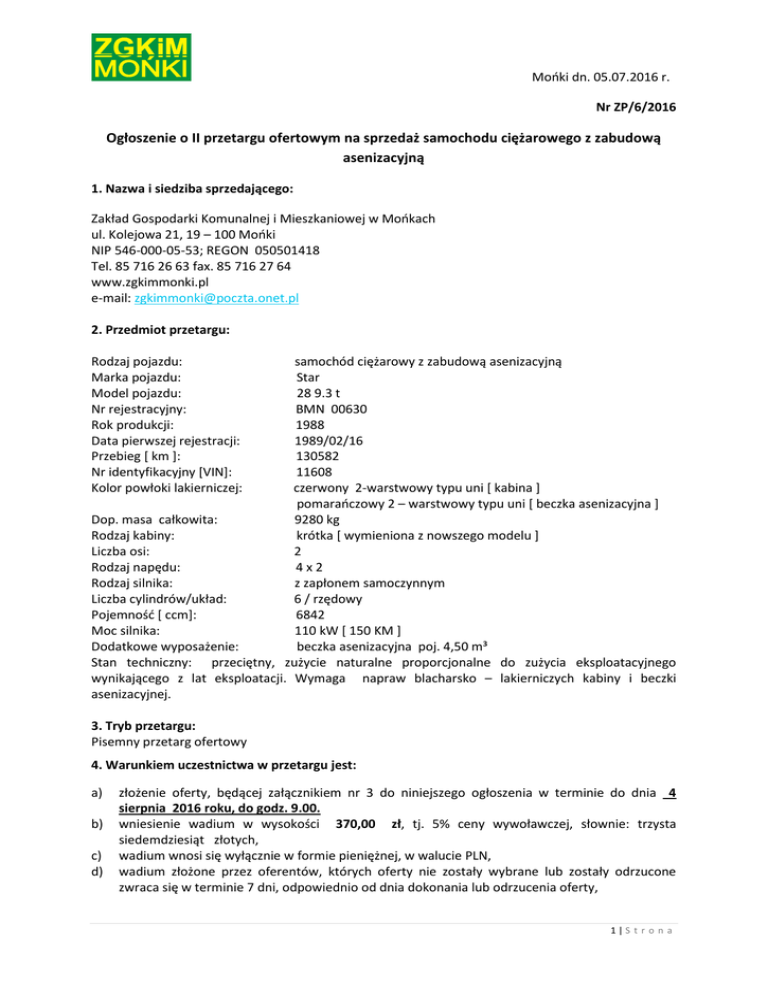 Mońki dn. 05.07.2016 r. Nr ZP/6/2016 Ogłoszenie o II przetargu ofertowym na sprzedaż samochodu ciężarowego z zabudową asenizacyjną 1. Nazwa i siedziba sprzedającego: Zakład Gospodarki Komunalnej i Mieszkaniowej w Mońkach ul. Kolejowa 21, 19 – 100 Mońki NIP 546-000-05-53; REGON 050501418 Tel. 85 716 26 63 fax. 85 716 27 64 www.zgkimmonki.pl e-mail: [email protected] 2. Przedmiot przetargu: Rodzaj pojazdu: Marka pojazdu: Model pojazdu: Nr rejestracyjny: Rok produkcji: Data pierwszej rejestracji: Przebieg [ km ]: Nr identyfikacyjny [VIN]: Kolor powłoki lakierniczej: samochód ciężarowy z zabudową asenizacyjną Star 28 9.3 t BMN 00630 1988 1989/02/16 130582 11608 czerwony 2-warstwowy typu uni [ kabina ] pomarańczowy 2 – warstwowy typu uni [ beczka asenizacyjna ] Dop. masa całkowita: 9280 kg Rodzaj kabiny: krótka [ wymieniona z nowszego modelu ] Liczba osi: 2 Rodzaj napędu: 4x2 Rodzaj silnika: z zapłonem samoczynnym Liczba cylindrów/układ: 6 / rzędowy Pojemność [ ccm]: 6842 Moc silnika: 110 kW [ 150 KM ] Dodatkowe wyposażenie: beczka asenizacyjna poj. 4,50 m³ Stan techniczny: przeciętny, zużycie naturalne proporcjonalne do zużycia eksploatacyjnego wynikającego z lat eksploatacji. Wymaga napraw blacharsko – lakierniczych kabiny i beczki asenizacyjnej. 3. Tryb przetargu: Pisemny przetarg ofertowy 4. Warunkiem uczestnictwa w przetargu jest: a) b) c) d) złożenie oferty, będącej załącznikiem nr 3 do niniejszego ogłoszenia w terminie do dnia 4 sierpnia 2016 roku, do godz. 9.00. wniesienie wadium w wysokości 370,00 zł, tj. 5% ceny wywoławczej, słownie: trzysta siedemdziesiąt złotych, wadium wnosi się wyłącznie w formie pieniężnej, w walucie PLN, wadium złożone przez oferentów, których oferty nie zostały wybrane lub zostały odrzucone zwraca się w terminie 7 dni, odpowiednio od dnia dokonania lub odrzucenia oferty, 1|S t r o n a e) f) wadium złożone przez kupującego zalicza się w poczet ceny sprzedaży, wadium nie podlega zwrotowi w przypadku gdy oferent. Którego oferta została wybrana uchyli się od zawarcia umowy, Formularz ofertowy wraz z załącznikami można pobrać w siedzibie Sprzedającego: Zakład Gospodarki Komunalnej i Mieszkaniowej w Mońkach, ul. Kolejowa 21, 19 – 100 Mońki – sekretariat pokój nr 106 [ I piętro budynku ] lub ze strony internetowej www.zgkimmonki.pl 5. Wymagania jakim powinna odpowiadać oferta w prowadzonym przetargu Oferta pod rygorem nieważności powinna być sporządzona w formie pisemnej i musi zawierać: a) imię i nazwisko lub nazwę [ firmę ] oferenta b) adres siedziby [ firmy ] oferenta c) telefon kontaktowy d) numer PESEL i NIP oferenta a w przypadku firm nr REGON e) datę sporządzenia oferty f) cenę ofertową i warunki jej zapłaty g) oświadczenie oferenta że zapoznał się ze stanem technicznym pojazdu lub że ponosi odpowiedzialność za skutki wynikające z rezygnacji oględzin sprzedawanego pojazdu Każdy oferent może złożyć tylko jedną ofertę. Sprzedający nie dopuszcza składania ofert wariantowych. 6. Cena wywoławcza. Cenę wywoławczą ustalono na 7.380,00 zł [ brutto ]. Przystępujący do przetargu powinni wykazać się dowodem wpłaty wadium w wysokości 370,00 zł. Wadium należy wpłacić w kasie Zakładu Gospodarki Komunalnej i Mieszkaniowej w Mońkach, ul. Kolejowa 21, pokój nr 8 – parter budynku, lub na konto Zakładu: Bank Spółdzielczy w Mońkach nr 16 8085 0005 0007 3033 2000 0010; najpóźniej w dniu otwarcia ofert, tj. 4 sierpnia 2016 roku, przed godz. 9.00. 7. Termin, miejsce i sposób złożenia oferty Ofertę wraz z wymaganymi dokumentami [ oświadczenie, potwierdzenie wpłaty wadium ] należy złożyć w dni robocze [ poniedziałek – piątek ] w godzinach 7.00 – 15.00 nie później niż jednak do dnia 4 sierpnia 2016 roku, do godz. 9.00, w sekretariacie Zakładu Gospodarki Komunalnej i Mieszkaniowej w Mońkach, ul. Kolejowa 21, pokój 106 [ I piętro budynku ] w zamkniętej kopercie z napisem: „Oferta na zakup samochodu ciężarowego – II przetarg” Oferty złożone po tej dacie nie będą rozpatrywane. W przypadku złożenia dwóch ofert o jednakowej najwyższej cenie, komisja przetargowa zorganizuje dodatkowy przetarg ustny dla oferentów, którzy podali jednakowe ceny. Kwota postąpienia nie może być niższa od 100,00 zł. Komisja zawiadomi oferentów o dodatkowym terminie. 8. Miejsce otwarcia ofert. Otwarcie ofert nastąpi w dniu 4 sierpnia 2016 roku, o godz. 9.15, w pokoju nr 10 [ parter budynku ], siedziba Zakładu Gospodarki Komunalnej i Mieszkaniowej w Mońkach, ul. Kolejowa 21, 19 – 100 Mońki. Termin związania ofertą zakupu wynosi 14 dni. 9. Komisja przetargowa odrzuca ofertę jeżeli: 9.1 Została złożona po wyznaczonym terminie, w niewłaściwym miejscu lub przez oferenta, który nie wniósł wadium, 9.2 Nie zawiera danych i dokumentów takich jak: a) dowód wpłaty wadium, b) informacji o których mowa w pkt. 5 O odrzuceniu oferty komisja powiadomi oferenta niezwłocznie. 2|S t r o n a 10. Miejsce i termin, w którym można obejrzeć sprzedawany składnik majątku ruchomego. Przedmiot przetargu można oglądać w siedzibie Sprzedającego: Zakład Gospodarki Komunalnej i Mieszkaniowej w Mońkach, ul. Kolejowa 21, 19 – 100 Mońki, w dni robocze 8.00 – 14.00. Szczegółowe informacje można uzyskać pod numerem 85 716 24 14 – Wydział Transportu i Sprzętu, Osoba do kontaktu: Bogdan Miękisz – Kierownik Wydziału i Sprzętu. 11. Zakład Gospodarki Komunalnej i Mieszkaniowej w Mońkach zastrzega sobie prawo do zamknięcia przetargu bez wybrania oferty, bez podania przyczyn. 12. Inne informacje: a) komisja przetargowa wybierze ofertę z najwyższą ceną, b) data podpisania umowy zostanie określona niezwłocznie po wyborze najkorzystniejszej oferty, c) oferent – kupujący w terminie podpisania umowy powinien uzupełnić całą należność za pojazd, d) wydanie pojazdu nastąpi nie zwłocznie po zapłaceniu prze