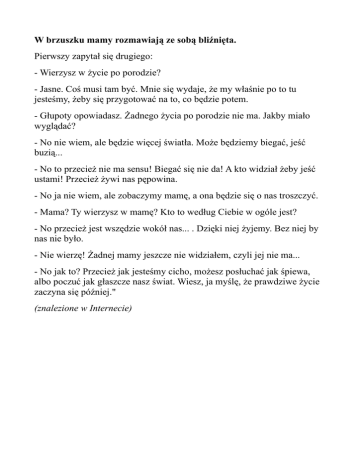 W brzuszku mamy rozmawiają ze sobą bliźnięta. Pierwszy zapytał się drugiego: - Wierzysz w życie po porodzie? - Jasne. Coś musi tam być. Mnie się wydaje, że my właśnie po to tu jesteśmy, żeby się przygotować na to, co będzie potem. - Głupoty opowiadasz. Żadnego życia po porodzie nie ma. Jakby miało wyglądać? - No nie wiem, ale będzie więcej światła. Może będziemy biegać, jeść buzią... - No to przecież nie ma sensu! Biegać się nie da! A kto widział żeby jeść ustami! Przecież żywi nas pępowina. - No ja nie wiem, ale zobaczymy mamę, a ona będzie się o nas troszczyć. - Mama? Ty wierzysz w mamę? Kto to według Ciebie w ogóle jest? - No przecież jest wszędzie wokół nas... . Dzięki niej żyjemy. Bez niej by nas nie było. - Nie wierzę! Żadnej mamy jeszcze nie widziałem, czyli jej nie ma... - No jak to? Przecież jak jesteśmy cicho, możesz posłuchać jak śpiewa, albo poczuć jak głaszcze nasz świat. Wiesz, ja myślę, że prawdziwe życie zaczyna się później." (znalezione w Internecie)