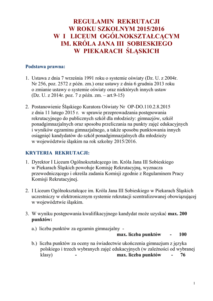 REGULAMIN REKRUTACJI W ROKU SZKOLNYM 2015/2016 W I LICEUM OGÓLNOKSZTAŁCĄCYM IM. KRÓLA JANA III SOBIESKIEGO W PIEKARACH ŚLĄSKICH Podstawa prawna: 1. Ustawa z dnia 7 września 1991 roku o systemie oświaty (Dz. U. z 2004r. Nr 256, poz. 2572 z późn. zm.) oraz ustawy z dnia 6 grudnia 2013 roku o zmianie ustawy o systemie oświaty oraz niektórych innych ustaw (Dz. U. z 2014r. poz. 7 z późn. zm. – art.9-15) 2. Postanowienie Śląskiego Kuratora Oświaty Nr OP-DO.110.2.8.2015 z dnia 11 lutego 2015 r. w sprawie przeprowadzania postępowania rekrutacyjnego do publicznych szkół dla młodzieży: gimnazjów, szkół ponadgimnazjalnych oraz sposobu przeliczania na punkty zajęć edukacyjnych i wyników egzaminu gimnazjalnego, a także sposobu punktowania innych osiągnięć kandydatów do szkół ponadgimnazjalnych dla młodzieży w województwie śląskim na rok szkolny 2015/2016. KRYTERIA REKRUTACJI: 1. Dyrektor I Liceum Ogólnokształcącego im. Króla Jana III Sobieskiego w Piekarach Śląskich powołuje Komisję Rekrutacyjną, wyznacza przewodniczącego i określa zadania Komisji zgodnie z Regulaminem Pracy Komisji Rekrutacyjnej. 2. I Liceum Ogólnokształcące im. Króla Jana III Sobieskiego w Piekarach Śląskich uczestniczy w elektronicznym systemie rekrutacji scentralizowanej obowiązującej w województwie śląskim. 3. W wyniku postępowania kwalifikacyjnego kandydat może uzyskać max. 200 punktów: a.) liczba punktów za egzamin gimnazjalny max. liczba punktów - 100 b.) liczba punktów za oceny na świadectwie ukończenia gimnazjum z języka polskiego i trzech wybranych zajęć edukacyjnych (w zależności od wybranej klasy) max. liczba punktów - 76 1 c.) liczba punktów za szczególne osiągnięcia: świadectwo z wyróżnieniem, uzyskanie tytułu finalisty w wojewódzkich konkursach przedmiotowych organizowanych przez Śląskiego Kuratora Oświaty, inne osiągnięcia w zawodach wiedzy, artystycznych i sportowych, wolontariat, wymienione na świadectwie ukończenia gimnazjum max. liczba punktów - 24. 4. W roku szkolnym 2015/2016 przewiduje się utworzenie 7 ODDZIAŁÓW KLAS PIERWSZYCH. Limit miejsc w każdym oddziale wynosi - 30, a w klasach sportowych - 24. 5. Oferta szkoły obejmuje utworzenie klas o następującym ukierunkowaniu przedmiotowym: • klasa I A - LINGWISTYCZNA z rozszerzonym programem nauczania języka angielskiego, języka hiszpańskiego i geografii. Przedmioty punktowane podczas rekrutacji: język polski, język angielski matematyka i geografia. • klasa I B - HUMANISTYCZNO - DZIENNIKARSKA z rozszerzonym programem nauczania języka angielskiego, języka polskiego i historii. Przedmioty punktowane podczas rekrutacji: język polski, język obcy, matematyka i historia. • klasa I C - BIOLOGICZNO - CHEMICZNA z rozszerzonym programem nauczania języka angielskiego, biologii i chemii. Przedmioty punktowane podczas rekrutacji: język polski, język obcy, matematyka i biologia. • klasa I D - MEDYCZNO - POLITECHNICZNA - z rozszerzonym programem nauczania języka angielskiego, biologii i matematyki. Przedmioty punktowane podczas rekrutacji: język polski, język obcy, matematyka i biologia. • klasa I E - POLITECHNICZNO - EKONOMICZNA – z rozszerzonym programem nauczania języka angielskiego, matematyki i geografii. Przedmioty punktowane podczas rekrutacji: język polski, język obcy, matematyka i geografia. 2 • klasa I F - SPORTOWA – PIŁKA RĘCZNA CHŁOPCÓW z rozszerzonym programem nauczania języka angielskiego, biologii i informatyki. Przedmioty punktowane podczas rekrutacji: język polski, język obcy, matematyka i biologia. • klasa I G - SPORTOWA – PIŁKA NOŻNA CHŁOPCÓW z rozszerzonym programem nauczania języka angielskiego, biologii i informatyki. Przedmioty punktowane podczas rekrutacji: język polski, język obcy, matematyka i biologia. 6. Zasady przyznawania punktów za oceny uzyskane w gimnazjum i szczególne osiągnięcia uczniów. Zagadnienie Punktacja szczegółowa dopuszczający dostateczny dobry język polski bardzo dobry celujący dopuszczający dostateczny dobry język obcy bardzo dobry celujący dopuszczający dostateczny dobry matematyka bardzo dobry celujący trzecie wybrane dopuszczający zajęcia edukacyjne dostateczny w zależności dobry od wybranego bardzo dobry oddziału celujący Świadectwo ukończenia gimnazjum z wyróżnieniem – 0 punktów – 9 punktów – 13 punktów – 16 punktów – 19 punktów – 0 punktów – 9 punktów – 13 punktów – 16 punktów – 19 punktów – 0 punktów – 9 punktów – 13 punktów – 16 punktów – 19 punktów – 0 punktów – 9 punktów – 13 punktów – 16 punktów – 19 punktów Punktacja maksymalna 19 punktów 19 punktów 19 punktów 19 punktów 5 punktów 3 Uzyskanie tytułu finalisty w wojewódzkim lub ponadwojewódzkim konkursie przedmiotowym organizowanym przez kuratora oświaty oraz tytułu finalisty w Olimpiadzie Matematycznej Gimnazjalistów, Olimpiadzie Informatycznej Gimnazjalistów i Olimpiadzie Języka Angielskiego dla Gimnazjalistów, (o których mowa w rozporządzeniu Ministra Edukacji Narodowej i Sportu z dnia 29 stycznia 2002 r. w sprawie organizacji oraz sposobu przeprowadzania konkursów, turniejów i olimpiad – Dz.U. z 2002 r. nr 13, poz. 125 z późn. zm.): - za jeden tytuł - 10 punktów - za dwa i więcej tytułów - dodatkowo - 2 punkty 12 punktów Inne szczególne osiągnięcia – w zawodach wiedzy, 5 punktów artystycznych i sportowych (indywidualne lub zespołowe), co najmniej na szczeblu powiatowym I miejsce lub tytuł laureata wymienione na świadectwie ukończenia gimnazjum- – 5 pkt kandydat może uzyskać maksymalnie 5 pkt. II miejsce lub tytuł finalisty Uwaga: W przyznawaniu punktów za szczególne osiągnięcia ucznia – 4 pkt sportowe, artystyczne (indywidualne lub zespołowe) lub konkursy inne, co najmniej na szczeblu powiatowym wymienione na świadectwie III miejsce lub wyróżnienie ukończenia gimnazjum, przyjmuje s