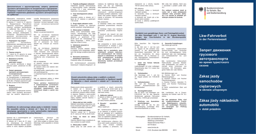 Дополнительно к круглогодичному запрету движения грузового автотранспорта по воскресеньям и праздникам: В период с 1 июля по 31 августа в Федеративной Республике Германия ограничено движение грузового автотранспорта по субботам! Обращайте, пожалуйста, внимание на следующее указание: В период с 1 июля по 31 августа в Федеративной Республике Германия ограничено движение тяжелых грузовых автомобилей по субботам. Мы просим отнестись с пониманием к этим мерам, которые необходимы в интересах беспрепятственного движения автотранспорта во время туристических сезонов. 1. Подпадают под запрет: Грузовые автомобили, разрешенная максимальная масса которых превышает 7,5 тонн, а также грузовые автомобили с прицепом. 2. Период запрета: С 1 июля по 31 августа по всем субботам с 7.00 по 20.00 часов. 3. Дорожные участки, на которых действует запрет: Все участки автобанов и федеральных дорог, указанные на обо роте. 4. Запрет движения грузового автотранспорта по воскресеньям: Запрет грузового автотранспорта по воскресеньям и праздникам с 0.00 по 22.00 часов на всех дорогах (§ 30 абз. 3 Правил дорожного дви жения) остается без изменений. 5. Выдача исключительных разршений: С просьбой о разрешении исполь зовать свой грузовой автотранспорт вы можете обратиться к службе безопасности дорожного движения, компетенции которой подлежит соответствующий погра ничный контрольно-пропускной пункт. 6. Отсутствие ограничения: Запрет не распространяется 6.1. на составные перевозки грузов “железная дорога – шоссе” от отправителя до погрузки на ближайшей ж/д стан-ции или от разгрузки на ближайшей ж/д станции до получателя; 6.2. на составные перевозки грузов “порт – шоссе” между пунктами погрузки или разгрузки и портом, расположенным макси мум в радиусе 150 километров (прибытие или отправление гру зов); 6.3. на перевозки а) свежего молока или свежих молочных продуктов, б) свежего мяса или свежих мясных продуктов, в) свежей рыбы, живой рыбы и све жих рыбопродуктов, г) скоропортящихся фруктов и ово щей; 6.4. на порожние рейсы в связи с перевозками по пункту 6.3. Грузы должны перевозиться в сопровождении установленных документов, которые не обходимо предъявлять компетентным лицам в целях кон троля. Dodatkowo do całorocznego zakazu jazdy w niedziele i święta: We wszystkie soboty w okresie od 1 lipca do 31 sierpnia obowiązują ograniczenia w ruchu samochodów ciężarowych na obszarze Republiki Federalnej Niemiec! Uprasza się o przestrzeganie po niższych wskazówek: W okresie od 1 lipca do 31 sierpnia obowiązują na obszarze Republiki Federalnej Niemiec ograniczenia w ruchu ciężkich po-jazdów ciężarowych. Uprasza się o zrozumienie dla tych ograniczeń, które podjęto w interesie nieza kłóconego ruchu pojazdów w okresie urlopowym. 1. Pojazdy podlegające zakazowi: Ciężarowe pojazdy samochodowe o dopuszczalnej masie całkowitej powyżej 7,5 t oraz samochody ciężarowe z przyczepami. 2. Czas obowiązywania zakazu ruchu: Wszystkie soboty w okresie od 1 lipca do 31 sierpnia w godzinach 7.00–20.00. 3. Drogi objęte zakazem ruchu Wszystkie podane na odwrocie odcinki autostrad i dróg federalnych. 4. Zakaz jazdy w niedziele: Zakaz ruchu samochodów ciężarowych, obowiązujący dla całej sieci drogowej w niedziele i dni świąteczne w godzinach 0.00– 22.00 (§ 30 ust. niemieckiego ko deksu drogowego – StVO), pozostaje bez zmian w mocy. 5. Udzielanie zezwoleń w drodze wyjątku: Odnośne wnioski składać należy w urzędzie ruchu drogowego, właści wym dla danego przejścia graniczne go. 6. Generalne zwolnienie z powyższych ograniczeń: Powyższy zakaz nie obowiązuje: 6.1. kombinowanych przewozów towarowych kolejowo-drogowych od nadawcy do najbliższej stacji zała dunku lub też od najbliższej stacji wyładunku do odbiorcy, 6.2. kombinowanych przewozów towarowych portowo-drogowych pomiędzy punktem załadunku i wyła dunku oraz portem leżącym maksymalnie w promieniu 150 kilometrów (dowóz i wywóz), 6.3. przewozów a) świeżego mleka oraz świeżych produktów przetwórstwa mlecznego, b) świeżego mięsa oraz świeżych produktów przetwórstwa mięsnego, c) świeżych ryb, żywych ryb oraz świeżych produktów przetwórstwa rybnego, d) łatwo psujących si