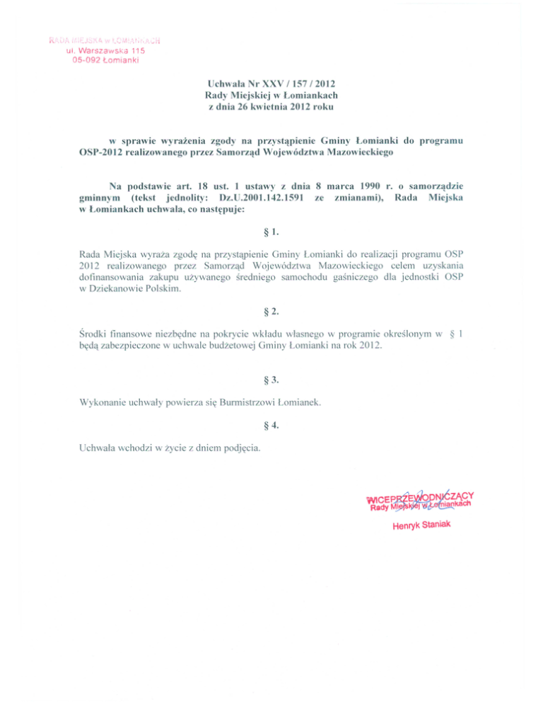 ul. War$zawska 1'15 05-092 tomianki Uchwala Nr XXV /157 / 2012 Rady Miejskiej w Lomiankach z dnia 26 kwietnia 2012 roku w sprawie wyrazenia zgody na przystllpienie Gminy Lomianki do programu OSP-2012 realizowanego przez Samorzlld Wojewodztwa Mazowieckiego Na podstawie art. 18 ust. 1 ustawy z dnia 8 marca 1990 r. 0 samorzlldzie gminnym (tekst jednolity: Dz.U.2001.142.1591 ze zmianami), Rada Miejska w Lomiankach uchwala, co nastfpuje: Rada Miejska wyraza zgodtt na przystqpienie Gminy Lomianki do realizacji programu OSP 2012 realizowanego przez Samorzetd Wojew6dztwa Mazowieckiego celem uzyskania dofinansowania zakupu uzywanego sredniego samochodu gasniczego dla jednostki OSP w Dziekanowie Polskim. Srodki finansowe niezbttdne na pokrycie wkladu wlasnego w programie okrdlonym bttdet zabezpieczone w uchwale budzetowej Gminy Lomianki na rok 2012. w ~CEP~~nN~~CY Rady Mjfs~k8ch Henryk Staniak § I