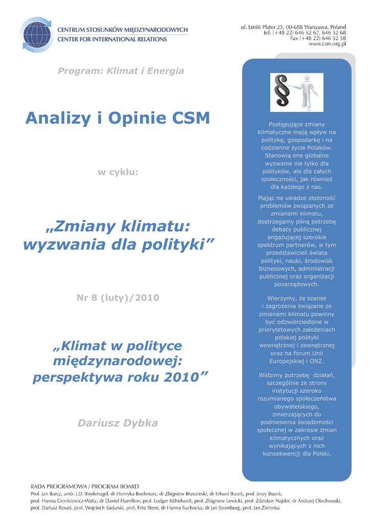 Program: Klimat i Energia Analizy i Opinie CSM w cyklu: „Zmiany klimatu: wyzwania dla polityki” Nr 8 (luty)/2010 „Klimat w polityce międzynarodowej: perspektywa roku 2010” Dariusz Dybka Postępujące zmiany klimatyczne mają wpływ na politykę, gospodarkę i na codzienne życie Polaków. Stanowią one globalne wyzwanie nie tylko dla polityków, ale dla całych społeczności, jak również dla każdego z nas. Mając na uwadze złożoność problemów związanych ze zmianami klimatu, dostrzegamy pilną potrzebę debaty publicznej angażującej szerokie spektrum partnerów, w tym przedstawicieli świata polityki, nauki, środowisk biznesowych, administracji publicznej oraz organizacji pozarządowych. Wierzymy, że szanse i zagrożenia związane ze zmianami klimatu powinny być odzwierciedlone w priorytetowych założeniach polskiej polityki wewnętrznej i zewnętrznej oraz na forum Unii Europejskiej i ONZ. Widzimy potrzebę działań, szczególnie ze strony instytucji szeroko rozumianego społeczeństwa obywatelskiego, zmierzających do podniesienia świadomości społecznej w zakresie zmian klimatycznych oraz wynikających z nich konsekwencji dla Polski. Klimat w polityce międzynarodowej – perspektywa roku 2010 Brak wiążących ustaleń na klimatycznym szczycie w Kopenhadze (grudzień 2009), można określić fiaskiem wielkiego spotkania. Uwidoczniło ono słabą pozycję krajów Unii Europejskiej, które nie odegrały dostatecznej roli wobec znaczenia USA i wpływów Chin. Przypomnijmy w skrócie, że po konferencji w Poznaniu (grudzień 2008), rozpoczął się rok intensywnych negocjacji. Negocjatorzy spotykali się kilkakrotnie w Bonn w siedzibie UNFCCC, w Bangkoku, Barcelonie i finalnie w Kopenhadze. Ministrowie i przywódcy państw rozmawiali o klimacie na większości spotkań międzynarodowych: otwarciu sesji ONZ, szczytach G8 i G20, poszczególnych szczytach regionalnych. Dodatkowo, przygotowująca się do swojej prezydencji, Dania organizowała spotkania nieformalne, a wszystkiemu towarzyszyły niezliczone konferencje naukowe i warsztaty przygotowane przez organizacje pozarządowe. Widoczna była szczególna rola USA i Chin. Prace w Kongresie USA, Departamencie Stanu, listopadowa wizyta prezydenta Obamy w Pekinie, były śledzone z uwagą i nadzieją na przełom. Chiny, reprezentowane w ramach grupy państw rozwijających się G77, stawiały państwom rozwiniętym postulaty niemożliwe do spełnienia. Nie ustępowały w swoim stanowisku, żądając przede wszystkim korzyści finansowych i technologicznych. W tym wszystkim Unia Europejska prowadziła bardzo aktywną politykę informacyjną i ideową na rzecz klimatu i ograniczenia emisji. Jak się okazało na koniec szczytu w Kopenhadze, rola przywódców europejskich została zredukowana do zatwierdzenia wyniku, który ustaliły między sobą Barack Obama i przedstawiciel premiera Chin Wen Jiabao. W wyniku nie rozstrzygnięcia podstawowych problemów, jedynie UE pozostała z restrykcyjnym systemem ograniczenia emisji. Pakiet ustaleń klimatyczno – energetycznych z grudnia 2008 jest już w mocy, podczas gdy USA i inne kraje rozwinięte dopiero określają swoje zobowiązania. Nowością natomiast jest, iż również kraje rozwijające się określą swoje działania w zwalczaniu zmian klimatu. Jest to bardzo oczekiwany rezultat, gdyż główni emitenci pochodzą również z tej grupy krajów. Dopiero działania, które przyjmą Chiny, Indie, czy Brazylia, będą stanowiły o globalnym powodzeniu przedsięwzięcia. Najbardziej trzeźwo oceniającym każdy problem gospodarczy, polityczny czy organizacyjny są światowe giełdy. Tak też oceniły i zareagowały na wyniki konferencji w Kopenhadze. Na wszystkich z nich, gdzie handluje się 1 prawami do emisji dwutlenku węgla, ceny uprawnień spadły - a np.: ogólna kwota wartości tych uprawnień dotycząca Polski jest niebagatelna, wynosi bowiem około 40 mln euro. Wynik szczytu klimatycznego w Kopenhadze nie stanowił zbyt wielkiego zaskoczenia dla giełd, gdyż już w połowie obrad było czytelne, iż uczestniczące w nich państwa nie są w stanie wypracować wiążącego prawnie porozumienia. Konferencja kopenhaska zastopowała plan Komisji Europejskiej, który zakładał szybkie i sprawne działania mające na celu zwiększyć redukcję emisji CO 2 z 20% do 30%. W praktyce okazuje się, że tylko UE i Komisji Europejskiej zależy na walce z ocieplaniem klimatu, i że podchodzi do tego poważnie. KE chciała to wiążąco zatwierdzić do wykonania, pod warunkiem, że inne państwa zobowiążą się do podobnych konkretnych cięć w swoich krajowych emisjach. Rynek i giełdy czekają też na wynik legislacji w USA – ustawy o limitach emisji – gdyż zgodnie z planami, emisje CO2 w USA mają do 2020 roku zostać ograniczone o 17 %, w porównaniu z rokiem 2005. Polska obok Wielkiej Brytanii, Włoch i Niemiec jest czwartym w Unii Europejskiej rynkiem handlu uprawnieniami do emisji CO2. Według wstępnych obliczeń, w obrocie może się znaleźć w sumie 33,4 miliona uprawnień, a nadwyżka naszych uprawnień wynosi około 4,4 miliona ton. Obok spadku cen uprawnień, wynik Kopenhagi ma też wpływ na brak motywacji do inwestycji w czyste zielone technologie. Globalni gracze tacy jak Chiny i USA nie doszli do porozumienia, gdyż okazało się, że mają jawnie sprzeczne interesy. Natomiast rola UE okazała się dalece niedostateczna. Pomimo chlubienia się rolą faktycznego lidera klimatycznego na świecie, w ostatnich uzgodnieniach, przywódcy UE zostali odsunięci w cień przez Prezydenta Baraka Obamę i delegację chińską, w dodatku „wielka trójka” UE: kanclerz Merkel, prezydent Sarkozy i premier Brown nie mieli mandatu całej UE do rozmów z USA i Chinami. Pytanie jest ważkie – gdzie należy dopatrywać się następującej między nimi rywalizacji, uniemożliwiającej im przemawianie jednym głosem? Czy wynika to ze spornych interesów wewnątrz UE? 