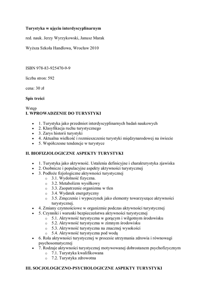 Turystyka w ujęciu interdyscyplinarnym red. nauk. Jerzy Wyrzykowski, Janusz Marak Wyższa Szkoła Handlowa, Wrocław 2010 ISBN 978-83-925470-9-9 liczba stron: 592 cena: 30 zł Spis treści Wstęp I. WPROWADZENIE DO TURYSTYKI 1. Turystyka jako przedmiot interdyscyplinarnych badań naukowych 2. Klasyfikacja ruchu turystycznego 3. Zarys historii turystyki 4. Aktualna wielkość i rozmieszczenie turystyki międzynarodowej na świecie 5. Współczesne tendencje w turystyce II. BIOFIZJOLOGICZNE ASPEKTY TURYSTYKI 1. Turystyka jako aktywność. Ustalenia definicyjne i charakterystyka zjawiska 2. Osobnicze i populacyjne aspekty aktywności turystycznej 3. Podłoże fizjologiczne aktywności turystycznej o 3.1. Wydolność fizyczna. o 3.2. Metabolizm wysiłkowy o 3.3. Zaopatrzenie organizmu w tlen o 3.4. Wydatek energetyczny o 3.5. Zmęczenie i wypoczynek jako elementy towarzyszące aktywności turystycznej. 4. Zmiany czynnościowe w organizmie podczas aktywności turystycznej 5. Czynniki i warunki bezpieczeństwa aktywności turystycznej o 5.1. Aktywność turystyczna w gorącym i wilgotnym środowisku o 5.2. Aktywność turystyczna w zimnym środowisku o 5.3. Aktywność turystyczna na znacznej wysokości o 5.4. Aktywność turystyczna pod wodą 6. Rola aktywności turystycznej w procesie utrzymania zdrowia i równowagi psychosomatycznej 7. Rodzaje aktywności turystycznej motywowanej dobrostanem psychofizycznym o 7.1. Turystyka kwalifikowana o 7.2. Turystyka zdrowotna III. SOCJOLOGICZNO-PSYCHOLOGICZNE ASPEKTY TURYSTYKI 1. Socjologiczne aspekty turystyki 2. Psychologiczne aspekty turystyki 3. Perspektywy rozwoju psychologii turystyki IV. TURYSTYKA JAKO ZJAWISKO GOSPODARCZE 1. Gospodarka turystyczna o 1.1. Pojęcie, klasyfikacja i badanie gospodarki turystycznej o 1.2. Rynek turystyczny i jego mechanizm o 1.3. Metody badań rynku turystycznego o 1.4. Obsługa ruchu turystycznego o 1.5. Marketing w turystyce 2. Gospodarka turystyczna w skali ponadnarodowej i krajowej o 2.1. Gospodarka turystyczna w Unii Europejskiej o 2.2. Zakres oddziaływania organizacji międzynarodowych na gospodarkę turystyczną o 2.3. Oddziaływanie na rozwój gospodarki turystycznej w skali kraju 3. Regionalna i lokalna gospodarka turystyczna o 3.1. Oddziaływanie na rozwój gospodarki turystycznej w regionie o 3.2. Oddziaływanie na rozwój gospodarki turystycznej w gminie o 3.3. Regionalne i lokalne organizacje państwowe i samorządowe działające na rzecz rozwoju gospodarki turystycznej o 3.4. Przykłady strategii rozwoju turystyki w gminie i regionie 4. Przedsiębiorstwo jako podmiot gospodarki turystycznej o 4.1. Pojęcie, cechy i klasyfikacja przedsiębiorstw turystycznych o 4.2. Zarządzanie personelem o 4.3. Finanse przedsiębiorstwa turystycznego o 4.4. Strategie przedsiębiorstw turystycznych V. TURYSTYKA JAKO ZJAWISKO PRZESTRZENNE 1. Podstawowe pojęcia związane z gospodarką przestrzenną w turystyce 2. Metody oceny atrakcyjności turystycznej środowiska geograficznego 3. Metody badania ruchu turystycznego i wskaźniki rozwoju turystyki 4. Zagospodarowanie turystyczne o 4.1. Baza noclegowa o 4.2. Baza gastronomiczna o 4.3. Baza komunikacyjna o 4.4. Baza towarzysząca 5. Wykorzystanie i zagospodarowanie turystyczne różnych typów środowiska geograficznego o 5.1. Obszary nadmorskie o 5.2. Obszary górskie o 5.3. Środowisko wód śródlądowych o 5.4. Obszary chronione 6. Podstawowe rodzaje miejscowości turystycznych 7. Przystosowanie walorów krajoznawczych na potrzeby turystyki o 7.1. Formy i model przystosowania walorów krajoznawczych środowiska przyrodniczego o 7.2. Formy przystosowania walorów krajoznawczych dóbr kultury VI. PRAWNE ASPEKTY TURYSTYKI 1. Pojęcie prawa turystycznego 2. Źródła prawa turystycznego. Pojęcie i rodzaje źródeł prawa o 2.1. Ustawodawstwo krajowe o 2.2. Regulacje wspólnotowe o 2.3. Ratyfikowane umowy międzynarodowe 3. Biura podróży o 3.1. Podejmowanie i prowadzenie działalności gospodarczej w zakresie organizacji imprez turystycznych i pośrednictwa o 3.2. Umowa o imprezę turystyczną o 3.3. Umowa o pojedyncze świadczenie (pojedynczą usługę turystyczną) o 3.4. Przewodnicy turystyczni i piloci wycieczek oraz zasady ich współpracy z biurami podróży 4. Usługi hotelarskie o 4.1. Podejmowanie i prowadzenie działalności gospodarczej w hotelarstwie o 4.2. Umowa hotelowa o 4.3. Ustalenia terminologiczne dotyczące hotelarstwa o 4.4. Odpowiedzialność odszkodowawcza w hotelarstwie Bibliografia Akty prawne Strony www Spis tabel Spis rysunków Spis fotografii Załączniki Indeks rzeczowy