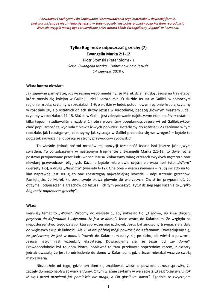 Pozwalamy i zachęcamy do kopiowania i rozprowadzania tego materiału w dowolnej formie, pod warunkiem, że nie zmienia się tekstu w żaden sposób i nie pobiera opłaty poza kosztem reprodukcji. Wszelkie wyjątki muszą być zatwierdzone przez autora i Zbór Ewangeliczny „Agape” w Poznaniu. Tylko Bóg może odpuszczać grzechy (7) Ewangelia Marka 2:1-12 Piotr Słomski (Peter Slomski) Seria: Ewangelia Marka – Dobra nowina o Jezusie 14 czerwca, 2015 r. Wiara kontra niewiara Jak zapewne pamiętacie, już wcześniej wspomnieliśmy, że Marek dzieli służbę Jezusa na trzy etapy, które toczyły się kolejno w Galilei, Judei i Jerozolimie. O służbie Jezusa w Galilei, w północnym regionie Izraela, czytamy w rozdziałach 1-9; o służbie w Judei, południowym regionie Izraela, czytamy w rozdziale 10, a o ostatnich dniach służby Jezusa w Jerozolimie, będącej głównym miastem Judei, czytamy w rozdziałach 11-15. Służba w Galilei jest zdecydowanie najdłuższym etapem. Przez ostatnie kilka tygodni studiowaliśmy rozdział 1 i obserwowaliśmy popularność Jezusa wśród Galilejczyków, choć popularność ta wynikała z niewłaściwych pobudek. Dotarliśmy do rozdziału 2 i zarówno w tym rozdziale, jak i następnym, zobaczymy jak sytuacja w Galilei przeradza się we wrogość – będzie to początek zauważalnej opozycji ze strony przywódców żydowskich. To właśnie jednak pośród mroków tej opozycji tożsamość Jezusa lśni jeszcze jaśniejszym światłem. To co zobaczymy w następnym fragmencie z Ewangelii Marka 2:1-12, to dwie różne postawy przyjmowane przez ludzi wobec Jezusa. Zobaczymy wiarę czterech zwykłych mężczyzn oraz niewiarę przywódców religijnych. Kazanie będzie miało dwie części: pierwsza nosi tytuł „Wiara” (wersety 1-5), a druga „Niewiara” (wersety 6-12). One obie – wiara i niewiara – rzucą światło na to, kim naprawdę jest Jezus; to one rozstrzygną najważniejszą kwestię – odpuszczenie grzechów. Pamiętajcie, że Marek kierował swoje słowa głównie do wierzących. Chciał im przypomnieć, że otrzymali odpuszczenie grzechów od Jezusa i ich tym pocieszyć. Tytuł dzisiejszego kazania to „Tylko Bóg może odpuszczać grzechy”. Wiara Pierwszy temat to „Wiara”. Wróćmy do wersetu 1, aby nakreślić tło: „I znowu, po kilku dniach, przyszedł do Kafarnaum i usłyszano, że jest w domu”. Jezus wraca do Kafarnaum. Ze względu na nieposłuszeństwo trędowatego, którego wcześniej uzdrowił, Jezus był zmuszony trzymać się z dala od większych skupisk ludności. Ale kilka dni później mógł powrócić do Kafarnaum. Dowiadujemy się, że „usłyszano, że jest w domu”. Powrót do Kafarnaum odbył się po cichu, ale wieści o powrocie Jezusa natychmiast wzbudziły ekscytację. Dowiadujemy się, że Jezus był „w domu”. Prawdopodobnie był to dom Piotra, ponieważ to tam przebywał poprzednim razem; niektórzy jednak uważają, że jest to odniesienie do domu w Kafarnaum, gdzie Jezus mieszkał wraz ze swoją matką Marią. Niezależnie od tego, gdzie ten dom się znajdował, wieści o powrocie Jezusa sprawiły, że zaczęły do niego napływać wielkie tłumy. O tym właśnie czytamy w wersecie 2: „I zeszło się wielu, tak iż się i przed drzwiami już pomieścić nie mogli, a On głosił im słowo”. Zgodnie ze zwyczajem 1 panującym wtedy w tamtej części świata, ludzie przychodzili do czyjegoś domu bez zaproszenia. Przyszło tak wielu, że wkrótce zabrakło miejsca dla kolejnych nadchodzących. Ludzie wciąż jednak napływali i wydaje się, że część z nich była zgromadzona na zewnątrz, co wskazywałoby to na to, że dom ten nie był tak duży jak inne i miał drzwi wychodzące na ulicę; to z kolei oznacza, że był pozbawiony wewnętrznego dziedzińca. Czytamy, że Jezus „głosił im słowo”. Jezus troszczył się o to, by ludzie usłyszeli dobrą nowinę i by mogli być zbawieni od swojego grzechu. Nie próbował wywrzeć wrażenia na zgromadzonym tłumie poprzez dokonywanie cudów. Nie dostarczał im rozrywki. Po prostu nauczał. Jezus mówił słowa Boga o nadchodzącym królestwie i konieczności upamiętania się i wiary – „bo po to przyszedłem” stwierdził w Ewangelii Marka 1:38. Podczas gdy Jezus nauczał, coś się wydarzyło. Werset 3 mówi: „I przyszli do niego, niosąc paralityka, a dźwigało go czterech”. Pojawia się pewien paralityk. Wiemy, że musiał być poważnie sparaliżowany, ponieważ niosło go aż czterech mężczyzn. Nie mogli się przedostać do Jezusa, bo było tam wielu ludzi. Czy się poddali? Nie. Ta czwórka była bardzo zdeterminowana by dostać się do Jezusa. Co zrobili? Marek informuje nas o tym. Spójrz co mówi werset 4: „A gdy z powodu tłumu nie mogli do niego się zbliżyć, zdjęli dach nad miejscem, gdzie był, i przez otwór spuścili łoże, na którym leżał paralityk”. Zniszczyli dom, aby ich przyjaciel mógł dostać się do Jezusa! Musiało im naprawdę zależeć na tym przyjacielu i musieli wierzyć, że Jezus może mu pomóc. Włamali się przez dach. Musimy pamiętać, że tamte domy nie wyglądały tak jak nasze. Niektóre dzieci zapewne się zastanawiają: Jak udało im się przebić przez dach? Jak udało im się w ogóle dostać na ten dach? Prawdopodobnie dom nie był zbyt wysoki, może miał tylko jeden poziom. Dach tego domu był płaski i można było na nim stać lub siedzieć w czasie ciepłych wieczorów. Byłem w Izraelu i widziałem, że wiele domów do tej pory tak właśnie wygląda. Zwykle od zewnątrz, na dach prowadziły kamienne schody. To tłumaczy, jak się tam dostali, ale jak udało im się przebić przez dach? W zwykłym domu, dach składał się z drewnianych belek, które przebiegały od ściany do ściany. Belki te następnie przykrywano gałęziami drzew i ciernistych krzewów, kamiennymi płytami bądź płytkami z wypalanej gliny. Pokrywano to wszystko warstwą gliny i uklepywano, a
