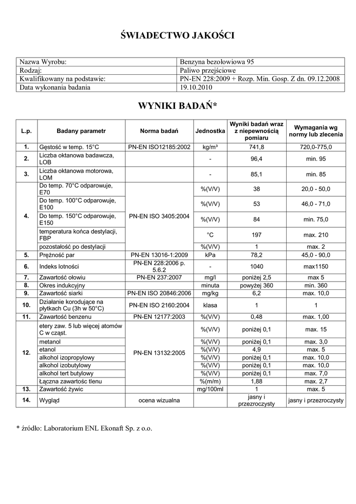 ŚWIADECTWO JAKOŚCI Nazwa Wyrobu: Rodzaj: Kwalifikowany na podstawie: Data wykonania badania Benzyna bezołowiowa 95 Paliwo przejściowe PN-EN 228:2009 + Rozp. Min. Gosp. Z dn. 09.12.2008 19.10.2010 WYNIKI BADAŃ* L.p. 1. Badany parametr Norma badań Jednostka PN-EN ISO12185:2002 kg/m³ 5. Gęstość w temp. 15°C Liczba oktanowa badawcza, LOB Liczba oktanowa motorowa, LOM Do temp. 70°C odparowuje, E70 Do temp. 100°C odparowuje, E100 Do temp. 150°C odparowuje, E150 temperatura końca destylacji, FBP pozostałość po destylacji Prężność par 6. Indeks lotności 7. 8. 9. 13. Zawartość ołowiu mg/l Okres indukcyjny minuta Zawartość siarki PN-EN ISO 20846:2006 mg/kg Działanie korodujące na PN-EN ISO 2160:2004 klasa płytkach Cu (3h w 50°C) Zawartość benzenu PN-EN 12177:2003 %(V/V) etery zaw. 5 lub więcej atomów %(V/V) C w cząst. metanol %(V/V) etanol %(V/V) PN-EN 13132:2005 alkohol izopropylowy %(V/V) alkohol izobutylowy %(V/V) alkohol tert butylowy %(V/V) Łączna zawartośc tlenu %(m/m) Zawartość żywic mg/100ml 14. Wygląd 2. 3. 4. 10. 11. 12. PN-EN ISO 3405:2004 PN-EN 13016-1:2009 PN-EN 228:2006 p. 5.6.2 PN-EN 237:2007 ocena wizualna * źródło: Laboratorium ENL Ekonaft Sp. z o.o. Wyniki badań wraz Wymagania wg z niepewnością normy lub zlecenia pomiaru 741,8 720,0-775,0 - 96,4 min. 95 - 85,1 min. 85 %(V/V) 38 20,0 - 50,0 %(V/V) 53 46,0 - 71,0 %(V/V) 84 min. 75,0 °C 197 max. 210 %(V/V) kPa 1 78,2 max. 2 45,0 - 90,0 - 1040 max1150 poniżej 2,5 powyżej 360 6,2 max 5 min. 360 max. 10,0 1 1 0,48 max. 1,00 poniżej 0,1 max. 15 poniżej 0,1 4,9 poniżej 0,1 poniżej 0,1 poniżej 0,1 1,88 1 jasny i przezroczysty max. 3,0 max. 5 max. 10,0 max. 10,0 max. 7,0 max. 2,7 max. 5 jasny i przezroczysty