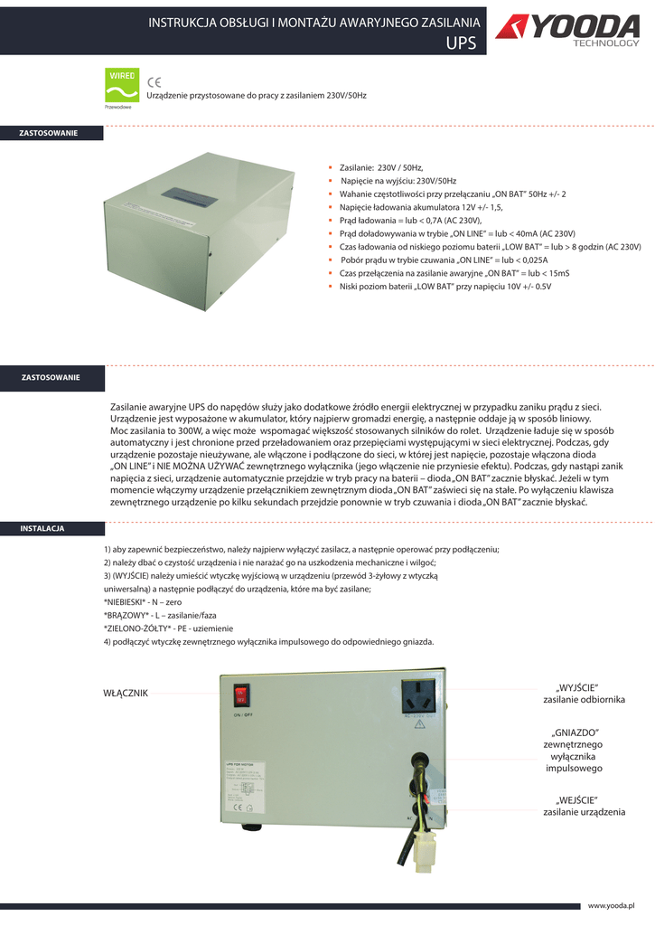 INSTRUKCJA OBSŁUGI I MONTAŻU AWARYJNEGO ZASILANIA UPS Urządzenie przystosowane do pracy z zasilaniem 230V/50Hz ZASTOSOWANIE Zasilanie: 230V / 50Hz, Napięcie na wyjściu: 230V/50Hz Wahanie częstotliwości przy przełączaniu „ON BAT” 50Hz +/- 2 Napięcie ładowania akumulatora 12V +/- 1,5, Prąd ładowania = lub < 0,7A (AC 230V), Prąd doładowywania w trybie „ON LINE” = lub < 40mA (AC 230V) Czas ładowania od niskiego poziomu baterii „LOW BAT” = lub > 8 godzin (AC 230V) Pobór prądu w trybie czuwania „ON LINE” = lub < 0,025A Czas przełączenia na zasilanie awaryjne „ON BAT” = lub < 15mS Niski poziom baterii „LOW BAT” przy napięciu 10V +/- 0.5V ZASTOSOWANIE Zasilanie awaryjne UPS do napędów służy jako dodatkowe źródło energii elektrycznej w przypadku zaniku prądu z sieci. Urządzenie jest wyposażone w akumulator, który najpierw gromadzi energię, a następnie oddaje ją w sposób liniowy. Moc zasilania to 300W, a więc może wspomagać większość stosowanych silników do rolet. Urządzenie ładuje się w sposób automatyczny i jest chronione przed przeładowaniem oraz przepięciami występującymi w sieci elektrycznej. Podczas, gdy urządzenie pozostaje nieużywane, ale włączone i podłączone do sieci, w której jest napięcie, pozostaje włączona dioda „ON LINE” i NIE MOŻNA UŻYWAĆ zewnętrznego wyłącznika (jego włączenie nie przyniesie efektu). Podczas, gdy nastąpi zanik napięcia z sieci, urządzenie automatycznie przejdzie w tryb pracy na baterii – dioda „ON BAT” zacznie błyskać. Jeżeli w tym momencie włączymy urządzenie przełącznikiem zewnętrznym dioda „ON BAT” zaświeci się na stałe. Po wyłączeniu klawisza zewnętrznego urządzenie po kilku sekundach przejdzie ponownie w tryb czuwania i dioda „ON BAT” zacznie błyskać. INSTALACJA 1) aby zapewnić bezpieczeństwo, należy najpierw wyłączyć zasilacz, a następnie operować przy podłączeniu; 2) należy dbać o czystość urządzenia i nie narażać go na uszkodzenia mechaniczne i wilgoć; 3) (WYJŚCIE) należy umieścić wtyczkę wyjściową w urządzeniu (przewód 3-żyłowy z wtyczką uniwersalną) a następnie podłączyć do urządzenia, które ma być zasilane; *NIEBIESKI* - N – zero *BRĄZOWY* - L – zasilanie/faza *ZIELONO-ŻÓŁTY* - PE - uziemienie 4) podłączyć wtyczkę zewnętrznego wyłącznika impulsowego do odpowiedniego gniazda. WŁĄCZNIK „WYJŚCIE” zasilanie odbiornika „GNIAZDO” zewnętrznego wyłącznika impulsowego „WEJŚCIE” zasilanie urządzenia www.yooda.pl INSTRUKCJA OBSŁUGI I MONTAŻU AWARYJNEGO ZASILANIA UPS Urządzenie przystosowane do pracy z zasilaniem 230V/50Hz ŚRODKI OSTROŻNOŚCI 1. Osoby nieprzeszkolone nie powinny zajmować się obsługą i podłączeniem urządzenia, aby uniknąć w ten sposób przypadkowego porażenia prądem. 2. Zabrania się podłączania prądu sieciowego lub innego napięcia do gniazda WYJŚCIA z urządzenia. W przeciwnym wypadku może to spowodować poważne uszkodzenie zasilania awaryjnego. Montaż powinien być przeprowadzony przez osoby do tego uprawnione, czyli posiadające odpowiednie uprawnienia (min. SEP do 1kV). Urządzenie przeznaczone jest do montażu w miejscach, w których nie będzię narażone na bezpośrednie działanie warunków atmosferycznych. Urządzenie powinno być zamontowane zgodnie ze sztuką oraz przepisami i normami obowiązującymi w Polsce i na terenie UE. Przewody łączące odbiornik energii eklektycznej ze źródłem zasilania, powinny być zabezpieczone przed skutkami przeciążenia i zwarcia przez urządzenia zabezpieczające, samoczynnie wyłączające zasilanie w przypadku przeciążenia lub zwarcia. Urządzenie powinno być zasilane za pośrednictwem osobnej linii, zabezpieczonej bezpiecznikiem o zadziałaniu szybkim (np. WTS, S-kl.B) nigdy bezpiecznikiem o zadziałaniu zwłocznym (kl. C lub D), zabezpieczenie układu takim bezpiecznikiem może powodować utratę praw wynikających z gwarancji. Przy podłączeniu urządzenia ze źródłem zasilania należy stosować przewody o odpowiednim przekroju, przy doborze należy kierować się tabelami obciążalność długotrwałej przewodów przy prądzie stałym lub przemiennym. DOŁADOWYWANIE AUTOMATYCZNE 1. W przypadku, gdy dioda „LOW BAT” błyska oznacza to, że poziom baterii jest niski. W takiej sytuacji należy użyć zasilana awaryjnego dopiero w momencie, gdy bateria zostanie w pełni naładowana. 2. Gdy prąd sieciowy jest normalnie dostępny, a dioda „ON LINE” jest włączona, akumulator zasilania awaryjnego będzie automatycznie ładowany, aby utrzymać go w pełnej gotowości. Po osiągnięciu pełnego naładowania, urządzenie samoczynnie odetnie dopływ prądu. Przed pierwszym uruchomieniem, urządzenie należy włączyć do gniazdka na okres 2 – 3 dni, aż do pełnego naładowania baterii. DODATKOWE INFORMACJE UPS może być wykorzystywany tylko z odpowiednim napięciem i natężeniem prądu. Przewód zasilający musi być podłączony do gniazda z trzpieniem uziemiającym. Nie należy wrzucać baterii do ognia, ponieważ może eksplodować. Nie otwieraj ani nie uszkadzaj obudowy baterii. Uwolniony elektrolit może spowodować uszkodzenia ciała i górnych dróg oddechowych oraz jest toksyczny. Przewód zasilający nie powinien być rozłączny z użyciem siły, ani ciągnąc za kabel. Nie można rozłączać urządzenia wilgotnymi lub mokrymi rękoma. Wszelkie urządzenia wymagane do uruchomienia i prawidłowego działania baterii zostały fabrycznie zamontowane przez producenta. Jakiekolwiek manipulacje przy urządzeniu związane z jego uruchomieniem powinno być prowadzone tylko przez wykwalifikowany personel. Wszelkie próby samodzielnej naprawy będą skutkowały utratą gwarancji. Serwis baterii i podzespołów urządzenia może być przeprowadzony tylko przez wykwalifikowaną kadrę. Gdy wymieniasz akumulator, zwróć uwagę, aby wymienić go na taki sam typ 