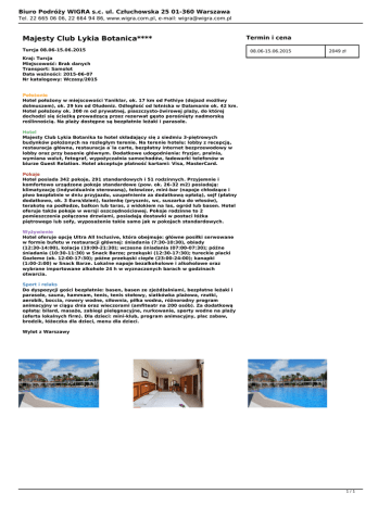 Biuro Podróży WIGRA s.c. ul. Człuchowska 25 01-360 Warszawa Tel. 22 665 06 06, 22 664 94 86, www.wigra.com.pl, e-mail: [email protected] Majesty Club Lykia Botanica**** Turcja 08.06-15.06.2015 Termin i cena 08.06-15.06.2015 2049 zł Kraj: Turcja Miejscowość: Brak danych Transport: Samolot Data ważności: 2015-06-07 Nr katalogowy: Wczasy/2015 Położenie Hotel położony w miejscowości Yaniklar, ok. 17 km od Fethiye (dojazd możliwy dolmuszem), ok. 29 km od Oludeniz. Odległość od lotniska w Dalamanie ok. 42 km. Hotel położony ok. 300 m od prywatnej, piaszczysto-żwirowej plaży, do której dochodzi się ścieżką prowadzącą przez rezerwat gęsto porośnięty nadmorską roślinnością. Na plaży dostępne są bezpłatnie leżaki i parasole. Hotel Majesty Club Lykia Botanika to hotel składający się z siedmiu 3-piętrowych budynków położonych na rozległym terenie. Na terenie hotelu: lobby z recepcją, restauracja główna, restauracja a`la carte, bezpłatny internet bezprzewodowy w lobby oraz przy basenie głównym. Dodatkowe udogodnienia: fryzjer, pralnia, wymiana walut, fotograf, wypożyczalnia samochodów, ładowarki telefonów w biurze Guest Relation. Hotel akceptuje płatność kartami: Visa, MasterCard. Pokoje Hotel posiada 342 pokoje, 291 standardowych i 51 rodzinnych. Przyjemnie i komfortowo urządzone pokoje standardowe (pow. ok. 26-32 m2) posiadają: klimatyzację (indywidualnie sterowaną), telewizor, mini-bar (napoje chłodzące i piwo bezpłatnie w dniu przyjazdu, uzupełnienie za dodatkową opłatą), sejf (płatny dodatkowo, ok. 3 Euro/dzień), łazienkę (prysznic, wc, suszarka do włosów), terakotę na podłodze, balkon lub taras, z widokiem na las, ogród lub basen. Hotel oferuje także pokoje w wersji oszczędnościowej. Pokoje rodzinne to 2 pomieszczenia połączone drzwiami, posiadają dostawki w postaci łóżka piętrowego lub sofy, wyposażenie takie samo jak w pokojach standardowych. Wyżywienie Hotel oferuje opcję Ultra All Inclusive, która obejmuje: główne posiłki serwowane w formie bufetu w restauracji głównej: śniadania (7:30-10:30), obiady (12:30-14:00), kolacje (19:00-21:30); wczesne śniadania (07:00-07:30); późne śniadania (10:30-11:30) w Snack Barze; przekąski (12:30-17:30); tureckie placki Gozleme (ok. 12:00-17:30); późne przekąski ciepłe (23:00-24:00); kanapki (1:00-2:00) w Snack Barze. Lokalne napoje bezalkoholowe i alkoholowe oraz wybrane importowane alkohole 24 h w wyznaczonych barach w godzinach otwarcia. Sport i relaks Do dyspozycji gości bezpłatnie: basen, basen ze zjeżdżalniami, bezpłatne leżaki i parasole, sauna, hammam, tenis, tenis stołowy, siatkówka plażowa, rzutki, aerobik, boccia, rowery wodne, siłownia, piłka wodna, różnorodny program animacyjny w ciągu dnia oraz wieczorami (amfiteatr na 200 osób). Za dodatkową opłatą: bilard, masaże, zabiegi pielęgnacyjne, nurkowanie, sporty wodne na plaży (oferta lokalnych firm). Dla dzieci: mini-klub, program animacyjny, plac zabaw, brodzik, łóżeczka dla dzieci, menu dla dzieci. Wylot z Warszawy 1/1 Powered by TCPDF (www.tcpdf.org)