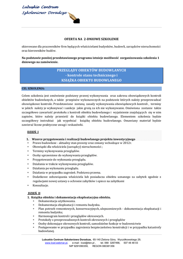 Lubuskie Lubuskie Centrum Szkoleniowo Doradcze OFERTA NA 2-DNIOWE SZKOLENIE skierowane dla pracowników firm będących właścicielami budynków, budowli, zarządców nieruchomości oraz kierowników budów. Na podstawie poniżej przedstawionego programu istnieje możliwość zorganizowania szkolenia 1 dniowego na zamówienie. PRZEGLĄDY OBIEKTÓW BUDOWLANYCH - kontrole stanu technicznego i KSIĄŻKA OBIEKTU BUDOWLANEGO CEL SZKOLENIA: Celem szkolenia jest omówienie podstawy prawej wykonywania oraz zakresu obowiązkowych kontroli obiektów budowlanych, a także przepisów wykonawczych na podstawie których należy przeprowadzać obowiązkowe kontrole. Przedstawione zostaną zasady wykonywania obowiązkowych kontroli , terminy w jakich należy je wykonywać i sankcje jakie grożą za ich nie wykonywanie. Omówiona zostanie także szczegółowo zawartość protokołu z kontroli obiektu budowlanego i wyjaśnienie znajdujących się w nim zapisów, które należy przenieść do książki obiektu budowlanego. Elementem szkolenia będzie szczegółowy instruktaż jak wypełniać książkę obiektu budowlanego. Omawiany materiał będzie zawierać liczne praktyczne uwagi i wskazówki. DZIEŃ I 1. Wzorce przygotowania i realizacji budowlanego projektu inwestycyjnego • Prawo budowlane - aktualny stan prawny oraz zmiany wchodzące w 2012r. • Obowiązki dla właściciela (zarządcy) nieruchomości ; • Terminy wykonywania przeglądów. • Osoby uprawnione do wykonywania przeglądów. • Przygotowanie do wykonania przeglądu. • Działania w trakcie wykonywania przeglądów. • Działania po wykonaniu przeglądu. • Działania w przypadku zagrożeń. Podstawa prawna. • Dodatkowe zobowiązania właściciela lub posiadacza obiektu uznanego za zabytek zgodnie z regulacjami nowej ustawy o ochronie zabytków i opiece na zabytkami • Konsultacje. DZIEŃ II 1. Książka obiektu i dokumentacja eksploatacyjna obiektu. • Dokumentacja użytkowania. • Dokumentacja eksploatacji i remontu budynku. • Plan potrzeb remontowych, konserwacyjnych, ulepszeniowych - dokumentacja eksploatacji i remontu budynku; • Harmonogram kontroli i przeglądów okresowych. • Protokoły z przeprowadzonych kontroli okresowych i przeglądów • Osoby dokonujące okresowych kontroli, samodzielne funkcje w budownictwie • Postępowanie w przypadku zagrożenia bezpieczeństwa konstrukcji i w przypadku katastrofy budowlanej. Lubuskie Centrum Szkoleniowo Doradcze, 65-140 Zielona Góra, Wyczółkowskiego 29, www.lcsd.webmar.pl, e-mail : [email protected] , tel. 068 3267498, 507 48 48 03 NIP 9291090359, REGON 080381356 Lubuskie Lubuskie Centrum Szkoleniowo Doradcze • • • • • Omówienie zasad prowadzenia książki obiektu budowlanego. Zawartość książki obiektu budowlanego. Wpisy do książki obiektu budowlanego- ćwiczenia praktyczne. Uwagi i zalecenia praktyczne Konsultacje WYKŁADOWCA: Emilia Kucharczyk - przedstawiciel Lubuskiej Okręgowej Izby Inżynierów Budownictwa w Gorzowie Wlkp. Wieloletni pracownik organów nadzoru budowlanego pierwszego i drugiego stopnia (Powiatowy Inspektor Nadzoru Budowlanego). Posiada uprawnienia budowlane do projektowania i wykonawstwa. Aktywnie uczestniczy pracach szkoleniowych w Polskiej Izbie Inżynierów Budownictwa oraz Lubuskiej Okręgowej Izbie Inżynierów Budownictwa (sekretarz Okręgowej Komisji Kwalifikacyjnej). Specjalizuje się w szkoleniach z zakresu prawa budowlanego i rozporządzeń wynikających z tego prawa oraz planowania i zagospodarowania przestrzennego , a także tematów pokrewnych kierowanych do kierowników budów, przedsiębiorców, zarządców nieruchomości , osób ubiegających się o uprawnienia budowlane. TERMIN SZKOLENIA: 15-16 kwietnia 2013 r od godziny 8.00 do 15.00 MIEJSCE SZKOLENIA: Urząd Marszałkowski w Zielonej Górze ul. Podgórna 7 (dolna sala szkoleniowa). KOSZT SZKOLENIA: 460 zł od osoby . Podana cena zawiera: • uczestnictwo w zajęciach szkoleniowych • materiały szkoleniowe • materiały piśmiennicze • catering • certyfikat uczestnictwa w szkoleniu Warunkiem uczestnictwa jest zgłoszenie do 08.04.2013 (przesłanie wypełnionej karty zgłoszenia) oraz dokonanie nie później niż na 7 dni przed terminem szkolenia pełnej wpłaty na konto organizatora – Lubuskie Centrum Szkoleniowo Doradcze nr 11 1060 0076 0000 3260 0178 6267 prowadzone w BPH S.A. O/Zielona Góra. W przypadku odwołania zgłoszenia później niż na 5 dni przed rozpoczęciem szkolenia zgłaszający ponosi jego pełne koszty. Nieodwołanie zgłoszenia i niewzięcie udziału w szkoleniu spowoduje obciążenie pełnymi kosztami uczestnictwa. Opóźnienie w zapłacie za szkolenie i jednoczesne odwołanie zgłoszenia w terminie krótszym niż 5 dni przed rozpoczęciem szkolenia, nie zwalnia zgłaszającego/uczestnika z obowiązku zapłaty za nie. Oświadczenie dotyczące odwołania zgłoszenia wymaga formy pisemnej. W każdym czasie możliwe jest wyznaczenie innego uczestnika na szkolenie. Odbycie się szkolenia w podanym terminie zostanie potwierdzone na 3 dni przed jego rozpoczęciem. -serdecznie zapraszamy na szkolenie- Lubuskie Centrum Szkoleniowo Doradcze, 65-140 Zielona Góra, Wyczółkowskiego 29, www.lcsd.webmar.pl, e-mail : [email protected] , tel. 068 3267498, 507 48 48 03 NIP 9291090359, REGON 080381356 Lubuskie Lubuskie Centrum Szkoleniowo Doradcze KARTA ZGŁOSZENIA ZGŁASZAJĄCY: Nazwa firmy: ………………………………………………………………………………………………..…………………………………….. Adres: …………………………………………………………………………………………………….………………………………………….. Telefon: ……………………………................................ Fax: …………………………..................................... Adres e-mail: ............................................. NIP: ..……………..