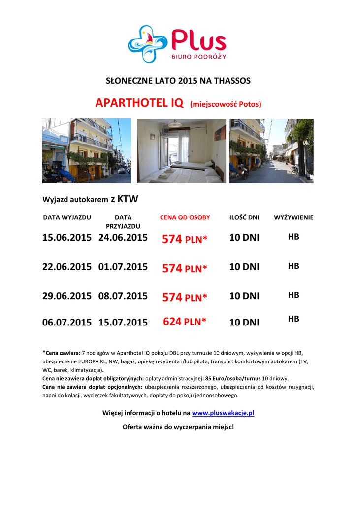 SŁONECZNE LATO 2015 NA THASSOS APARTHOTEL IQ (miejscowość Potos) Wyjazd autokarem z KTW DATA WYJAZDU DATA PRZYJAZDU CENA OD OSOBY ILOŚĆ DNI WYŻYWIENIE 15.06.2015 24.06.2015 574 PLN* 10 DNI HB 22.06.2015 01.07.2015 574 PLN* 10 DNI HB 29.06.2015 08.07.2015 574 PLN* 10 DNI HB 06.07.2015 15.07.2015 624 PLN* 10 DNI HB *Cena zawiera: 7 noclegów w Aparthotel IQ pokoju DBL przy turnusie 10 dniowym, wyżywienie w opcji HB, ubezpieczenie EUROPA KL, NW, bagaż, opiekę rezydenta i/lub pilota, transport komfortowym autokarem (TV, WC, barek, klimatyzacja). Cena nie zawiera dopłat obligatoryjnych: opłaty administracyjnej: 85 Euro/osoba/turnus 10 dniowy. Cena nie zawiera dopłat opcjonalnych: ubezpieczenia rozszerzonego, ubezpieczenia od kosztów rezygnacji, napoi do kolacji, wycieczek fakultatywnych, dopłaty do pokoju jednoosobowego. Więcej informacji o hotelu na www.pluswakacje.pl Oferta ważna do wyczerpania miejsc!