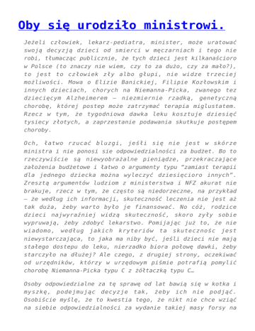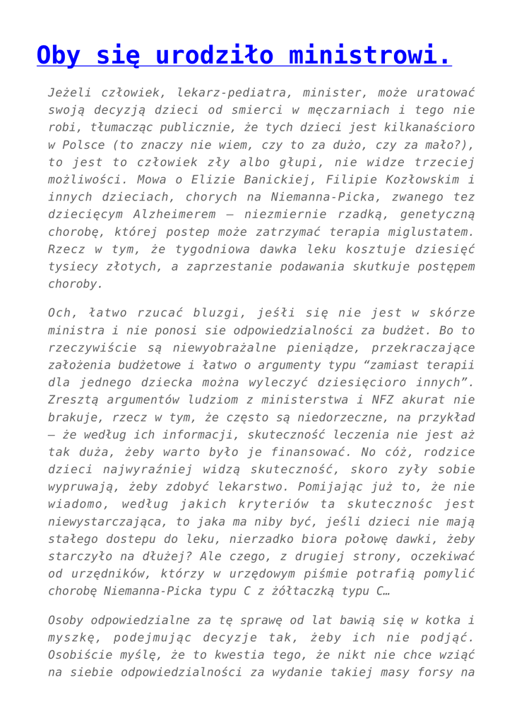 Oby się urodziło ministrowi. Jeżeli człowiek, lekarz-pediatra, minister, może uratować swoją decyzją dzieci od smierci w męczarniach i tego nie robi, tłumacząc publicznie, że tych dzieci jest kilkanaścioro w Polsce (to znaczy nie wiem, czy to za dużo, czy za mało?), to jest to człowiek zły albo głupi, nie widze trzeciej możliwości. Mowa o Elizie Banickiej, Filipie Kozłowskim i innych dzieciach, chorych na Niemanna-Picka, zwanego tez dziecięcym Alzheimerem – niezmiernie rzadką, genetyczną chorobę, której postep może zatrzymać terapia miglustatem. Rzecz w tym, że tygodniowa dawka leku kosztuje dziesięć tysiecy złotych, a zaprzestanie podawania skutkuje postępem choroby. Och, łatwo rzucać bluzgi, jeśłi się nie jest w skórze ministra i nie ponosi sie odpowiedzialności za budżet. Bo to rzeczywiście są niewyobrażalne pieniądze, przekraczające założenia budżetowe i łatwo o argumenty typu “zamiast terapii dla jednego dziecka można wyleczyć dziesięcioro innych”. Zresztą argumentów ludziom z ministerstwa i NFZ akurat nie brakuje, rzecz w tym, że często są niedorzeczne, na przykład – że według ich informacji, skuteczność leczenia nie jest aż tak duża, żeby warto było je finansować. No cóż, rodzice dzieci najwyraźniej widzą skuteczność, skoro zyły sobie wypruwają, żeby zdobyć lekarstwo. Pomijając już to, że nie wiadomo, według jakich kryteriów ta skutecznośc jest niewystarczająca, to jaka ma niby być, jeśli dzieci nie mają stałego dostepu do leku, nierzadko biora połowę dawki, żeby starczyło na dłużej? Ale czego, z drugiej strony, oczekiwać od urzędników, którzy w urzędowym piśmie potrafią pomylić chorobę Niemanna-Picka typu C z żółtaczką typu C… Osoby odpowiedzialne za tę sprawę od lat bawią się w kotka i myszkę, podejmując decyzje tak, żeby ich nie podjąć. Osobiście myślę, że to kwestia tego, że nikt nie chce wziąć na siebie odpowiedzialności za wydanie takiej masy forsy na tak niewielu chorych i narazić się na pretensje cholera wie kogo. Ale przecież chyba lepiej, że tych chorych jest kilkunastu, niż gdyby ich miało być sto tysięcy? Nawet, gdyby ten lek dzięki zwiekszonemu popytowi znacznie staniał i nakłady NFZ na refundację byłyby takie same, to mielibyśmy sto tysiecy ludzi w miarę sprawnych, ale jednak ciężko chorych. Jednym słowem, dobrze by to wyglądało tylko na papierze. Chyba należy się cieszyć, że ta choroba jest tak rzadka, a nie używać idiotycznych wykrętów. Rodzice tych dzieci dokonują niewiarygodnych wysiłków, żeby jednak te pieniądze zdobyć. Oczywiście, niemożliwe jest zdobycie takich kwot własną pracą, zwłaszcza, ze muszą też dzielic swój czas między rehabilitację chorych dzieci i ich zdrowe rodzeństwo. Organizują zatem sponsorów lub walczą o jeden procent podatku. Sponsorzy zreszta tez zapewne odpisują sobie kwoty wydane na te leki od podatków. Zatem tak czy inaczej, te piekielnie drogie leki są w dużej mierze opłacane przez forsę z podatków (tyle, że trafiły bezpośrednio do producenta leków, zamiast zahaczyć o państwowy budżet). Czyli brak refundacji to niekoniecznie oszczędność pieniędzy podatników. Przecież to jest straszna niegospodarność, głupota i marnowanie wysiłku wielu ludzi. Cena leku na pewno wygląda zupełnie inaczej, kiedy przychodzi czlowiek z ulicy i prosi o pudełko, nie wiedząc, czy i kiedy kupi następne, a inaczej, kiedy klient podpisuje umowę na zakup kilkudziesięciu opakowań co miesiąc. Dzieci, mając stały dostęp do terapii, sa w lepszym stanie, mają wiekszą szanse na samodzielność, być może na w miarę normalne życie i pracę zarobkową w przyszłości. Dzięki temu zarówno ich rodzice, jak i masa wolontariuszy może poswięcić wiecej czasu na pracę (opodatkowaną), zamiast użerać się z głupimi i/lub złymi ludźmi w rządzie. A producent ma stały dochód oraz więcej pacjentów, dzięki czemu może prowadzić wiecej badań, ma wiekszą grupę kontrolną, na której może obserwować skuteczność leku, dzięki czemu może pracować albo nad tańszymi odpowiednikami, albo nad preparatami leczącymi kolejne, smiertelne dziś, choroby. Niestety, ludzie odpowiedzialni za decyzje mają najwyraźniej konstytucyjne prawa swoich młodych obywateli, no, nie powiem, ze w dupie, bo byłaby to obraza dla dupy. Prawdopodobnie punkt widzenia ministra zmieniłby sie, gdyby sam miał chore dziecko. Pokazał to ostatnio przykład amerykańskich kongresmanów – konserwatystów, którzy nagle zaczęli popierać małżeństwa gejów, gdy okazało się, że ich własne dzieci są homoseksualne. Nie życzę ministrowi, zeby urodziło mu sie dziecko chore na Niemanna-Picka. Nikomu tego nie życzę. Ale statystyka jest nieubłagana – gdzieś, komuś sie urodzi. I temu dziecku życze, żeby urodziło sie ministrowi zdrowia, dla jego własnego (i innych chorych dzieci) dobra, bo to chyba jego jedyna szansa na leczenie. Póki co, zostaje prośba o jeden procent. Za wiedzą i zgodą Minor.Revisions. Wpis pochodzi z jednego z blogów radia TOK FM W maju bez zmian Ministerstwo Zdrowia przedstawiło właśnie PROJEKT OBWIESZCZENIA MINISTRA ZDROWIA w sprawie wykazu refundowanych leków, środków spożywczych specjalnego przeznaczenia żywieniowego oraz wyrobów medycznych na dzień 1 maja 2013 r. Na liście nie ma leku na chorobę Niemanna-Picka typu C. Dzień Rudych Warkoczy podziękowania!!! – Pierwszy Poznański Dzień Rudych Warkoczy już za nami. Pod ratuszem zebrała się spora grupa osób. W górę poleciały kolorowe balony, wystąpił zespół taneczny. Część z Was miała na sobie rude peruki. Dzień Rudych Warkoczy wymyślono, by zwrócić uwagę na sytuację dzieci chorych na NPC, których rodziny muszą prosić o pomoc ludzi dobrej woli. Chcemy Was zaprosić do obejrzenia galerii zdjęć wydarzenia – znajdziecie ją klikając tutaj lub na 