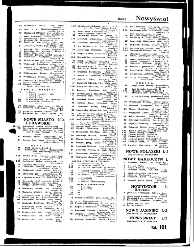 Nowe 88 49 79 73 97 9 .83 87 7 3 39 10 11 14 72 1 54 34 45 32 Sonnenwald Bracia, fabr. mebli, i Zduńska 7 I u. Darlehnskassenvercin, Spar spółdz. z n. o. Stasiewski Bernard, dom polski, re- i stauracja, lurmaństwo Straż Graniczna, komisariat Sylwestrowicz Anna, Targowisko 7 Śliwiński M., Grudziądzka 19 śmigierski Jan, mistrz rzeżn., han del bydła i koni „Vlstula", Polska żegl. Rzecz., przy stań n. Wisią Voss O., fabr. maszyn. Kolejowa 6 Warmbier Jan, auto-taksy, Długa 3 Wedel Oton, skład skór Weitzner Juliusz, handel surowców Wesołowski Władysław, drukarnia, Odańska 19 Wojciechowski Jan, mistrz rzeżnlckowedlfniarski, Kolejowa 9 Wojnowski Stanisław, właśc. maj., Kończyce Woköck H., tartak I fabr. mebli, budownictwo, Gdańskie Przed mieście 3 Wollcnweber Benno, Ogrodnictwo, Kończyce Wróblewski Brunon, mistrz stolar- | skl. Kolejowa 19 Zacharek A., skład kolon., restaur., komis.* sprzedaż nafty, Kościuszki 6 Zarząd gminny — (dod.) sekretarz, m. Z A R Z Ą D M I E J S K I : 6 — biuro — (dod ) burmistrz, gab. — (dod.) m. (dod.) kasa* 20 elektryfikacja, pl. Zamkowy a 85 gazownia. Zduńska 9 39 67 39 47 Zollenkopf, wlaśc. dóbr r y c , Milewo Żurawski Aleksander, fabr. mebli. Przykop 4/6 Żurawski Brunon, Sądowa 10 Żurawski Kurt, mistrz stolar., No wa 3 NOWE MIASTO LUBAWSKIE N/2 n.) . Informacja centrali telefonicznej 38 Przyjmowanie telegramów telefonem (Inne połączenia służbowe — patrz pod Poczta, Telegraf i Telefon) 93 54 48 21 Achelius Erwin, autodorożka, Ko ściuszkowska 18 Apteka Pod Orłem, Maternicki Bo lesław, Rynek 12 B A N K I : Bank Ludowy, Rynek 5 Komunalna Kasa Oszczędności pow. lubawskiego, Rynek 1 Bendix Maks, warsztat reperacyjny, Ląkowska 8 6 Boneck Ernest, Ląkowska 5 Borkowski Alojzy, autodorożka, 19 1 15 Stycznia 9 74 Cegielnia Powiatowa 80 Chelkowskl Bernard, skład tow. ko lonialnych. Rynek 22 94 Chelkowskl Julian, kupiec. Kościusz kowska 17 53 Chylewski Jan, automatyczna la bryka octu, Lipowa 6 1 3 4 Chyliński Ludwik, ks. proboszcz, Mi kołajki 62 Cieszyński Józef, drogeria, Rynek 7 60 Dejczer Wiktor, maj. Gwiździny 14 Dołęga - Lewandowski, mgr, maj.. Ruda 29 Domagała Ludwik, not., Kościusz kowska 18 76 Domeyko Wiktor, obyw. ziemski, Pręgowizna 8 „Drwęca", druk. i księg., Rynek 4 Dulęba Jan, kpt., Kościuszkowska 18 114 żelaza, 66 Ewertowskl Nikodem, skład Rynek 28 75 Gęstwicki Bonifacy, „Bławat", Ry nek 17 Gimnazjum (patrz szkoły) 33 Górski Jan, skład cukierków, Kazi mierza 2 70 Graduszewski Jan, obyw. ziemski, Krzemieniewo 13 Graduszewski Jan, obyw. ziemski, Nawra 78 Graduszewski Jan, rolnik, maj., Tylice 119 110 Orochowski Bolesław, instr., P. I . R, Okr. Zw. Prod. Trzody Chlew., św. Tomasza 1 23 Hotel Bona, Kościuszkowska 17 3 Hotel Centralny. Rynek 10 64 Iwanowski Antoni, em. major. W. P., Tyllczkl 136 Jabłoński Władysław, „Pomorzanka", Sobieskiego 3 40 Jankowski Bronisław, kawiarnia, re stauracja 4 Jaz Kazimierz, dr, lek. pow , Koś ciuszki 3 51 Jentkiewicz Bronisław, tartaki, Lą kowska 22 1 2 4 Kasper Antoni, dzierżawca plebanki, Kurzętnik 1 1 6 Knowski Jan, autodorotka, Sobieskie go 14 22 Kolej, ekspedycja towarowa 67 Kolej, ekspedycja towarowa. Nowe Miasto - Południe 87 Komenda Pow. P. W. I W. F. 90 Kopystecki Alojzy, restauracja, 19 Stycznia 4 10 Krasiński Franciszek, właśc. mle czarni, Mickiewicza 2 7 Kredlt u. Sparbank, Kościuszkow ska 15 97 Kubalski Oskar, hurtownia piwa, środkowa 9 15 Kurowski Edward, pik., wlaśc maj.. Kurzętnik 120 Kurowski Anastazy, ks. prob., Ty lice 37 Lambert Kazimierz, inż., rolnik, Jakubkowo 138 Landzbergowa Stanisława, plebanka 73 Lewalski Eryk, handel zbota, ja giellońska 13 20 Lewalski Julian, handel zboża, Ja giellońska 23 72 Lipińska Anna, restauracja dwor cowa 77 Lubowiecki Feliks, fotograf. Ko ścielna 2 83 Lazarewicz Alfons, lek. wet., Wierz bowa 10 99 Łukaszewski Jan, rolnik, Bratjan 27 Modrow Henryk, dobra r y c , hodo wla zbóż, ziem. o ryg., Gwiździny 1 4 2 Modrzejewski Franciszek, dom roln. handl., Mickiewicza 4 1 1 — maj., Kaczebagno 95 — zbożowiec, m., Mickiewicza 4 71 Morenc Leon, handlarz bydła. Aleje.2 82 Mówka Władysław, autodorożka, Kościuszki 6 42 Nikodcmskl Nikodem, adw.. Ry nek 21 100 Nowaczyk Wacław, handel zboża. Okólna 35 61 Nowak Konrad, mistrz rzeźnicki. Ja giellońska 3 96 Ochocki Jerzy, skład tow. kolon., Rynek 8 18 Olszewski Bolesław, skład bławatów. Sobieskiego 4 34 Ostrowski Henryk, dr, maj., Maria nowo 123 Pienczewskl Wincenty, mistrz rzeź nicki, Sobieskiego 2 17 Piotrowski Bernard, dr med.. Ko ściuszkowska 14 POCZTA, TELEGRAF I TELEFON: 16 — naczelnik urzędu, b. 112 — naczelnik urzędu, m. 113 — zastępca naczelnika — kontro la agencyj 19 — oddział kontrolny I sekretariat 43 — dział nadawczy (okienka) 38 — telegraf, przyjmowanie tele gramów telefonem 111 — dekartacja 122 — monter, m. 126 — Nadzór Teletechniczny 24 44 12 50 121 2 58 56 81 9 49 88 .36 Rost Stanisław, fabr. miodu sztucz nego „Kosta", Rynek 23 Rożnowski Józef, autodorożka, Prze mysłowa 15 Sąd Grodzki (patrz urzędy) 26 Schneider Karol, młyn, Bratjan 5 Schubring A., młyn parowy, tartak, cegielnia, ŁąKowska 1 69 Serożyński Władysław, skład żela za, Rynek 3 46 Skibowskl Konrad, drogeria, Sobie skiego 6 125 Suchocki Jan, budown. pow. 1 44 Szczepański Edmund, nacz. urz. skar bowego Starostwo (patrz urzędy) 98 Szkoła, Gimnazjum Państwowe, Ko ściuszkowska 10 55 Szkoła Powszechna, Lipowa 14 57 Szpital Powiatowy, Mickiewicza 9 59 Szudzińskl Edmund, handl. skór, 19 Stycznia 9 39 Szudzińskl jentkiewicz, skład bła watów, 19 Stycznia 1 91 Truszczyński Władysław, skład że laza. Rynek 9 92 Urbanowska Antonina, skład porce lany, Rynek 20 45 Urząd Parafialny, ks. prob. dr Leon Pryba, Kościelna 16 141 86 47 I 31 1 32 85 79 25 117 . 68 52 84 63 132 1 33 139 28 31 143 65 35 U R Z Ę D Y : Inspektorat Szkolny Nowomiejski, Ląkowska 7 Sąd Grodzki, Ląkowska 