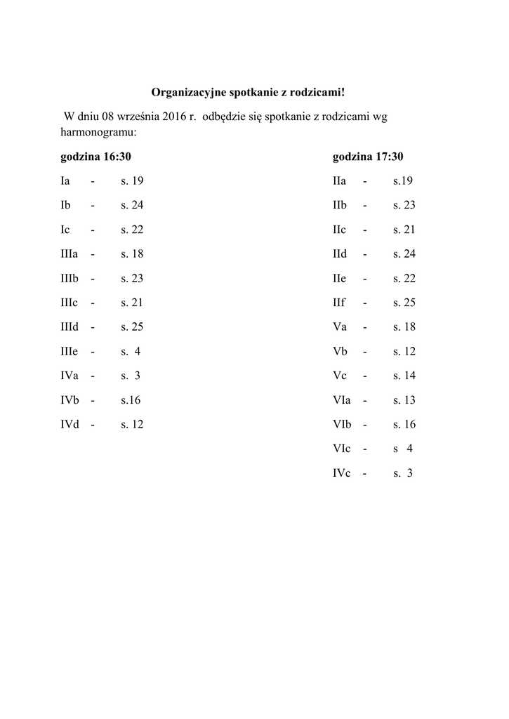 Organizacyjne spotkanie z rodzicami! W dniu 08 września 2016 r. odbędzie się spotkanie z rodzicami wg harmonogramu: godzina 16:30 godzina 17:30 Ia - s. 19 IIa - s.19 Ib - s. 24 IIb - s. 23 Ic - s. 22 IIc - s. 21 IIIa - s. 18 IId - s. 24 IIIb - s. 23 IIe - s. 22 IIIc - s. 21 IIf - s. 25 IIId - s. 25 Va - s. 18 IIIe - s. 4 Vb - s. 12 IVa - s. 3 Vc - s. 14 IVb - s.16 VIa - s. 13 IVd - s. 12 VIb - s. 16 VIc - s 4 IVc - s. 3