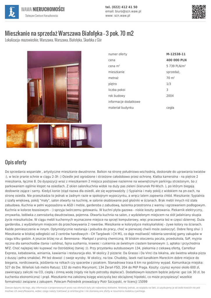 tel. (022) 412 41 50 email: [email protected] www: scn.waw.pl Mieszkanie na sprzedaż Warszawa Białołęka - 3 pok. 70 m2 Lokalizacja: mazowieckie, Warszawa, Warszawa, Białołęka, Skarbka z Gór numer oferty M-12538-11 cena 400 000 PLN cena m 5 739 PLN/m2 mieszkanie sprzedaż, metraż 70 m2 piętro 1/3 liczba pokoi 3 rok budowy 2004 2 informacje dodatkowe materiał budynku cegła Opis oferty Do sprzedania wspaniałe , artystyczne mieszkanie dwustronne. Balkon na stronę południowo-wschodnią, doskonałe do uprawiania kwiatów :), w lecie pranie schnie w ciągu 2-3h :) Osiedle jest ogrodzone i strzeżone całodobowo przez ochronę. Klatka kameralna - na piętrze 2 mieszkania, łącznie 8. Do dyspozycji wraz z mieszkaniem 2 miejsca postojowe naziemne na wewnętrznym parkingu strzeżonym, bo z parkowaniem ogólnie kłopot na osiedlach. Z okien salon/kuchnia widok na duży pas zieleni (kierunek Pd-Wsch. ), po którym biegają dosłownie zające i sarny. Kiedyś konie (stąd nazwa dla osiedli, ale się wyprowadziły :) Sypialnia i mały pokój z widokiem na pn-zach, na stronę osiedla. Nie przeszkadza to jednak w żadnym razie w spokojnym wypoczynku, a wręcz latem zapewnia chłód. Mieszkanie: Sypialnia z szafą wnękową, pokój "mały", salon otwarty na kuchnię, w salonie okablowanie pod głośniki w ścianach. Brak mebli innych niż stała zabudowa. Kuchnia w pełni wyposażona w AGD i meble, garderoba z zabudową, łazienka przestronna z wanną i ogrzewaniem podłogowym. Kuchnia w kolorze łososiowym - :) sprzyja twórczemu gotowaniu. W kuchni płyta gazowa - niskie koszty gotowania. Piekarnik elektryczny, zmywarka, lodówka z zamrażarką dwudrzwiowa, pojemna. Otwarta kuchnia na salon, z wydzielonym miejscem na stół jadalniany skupia życie mieszkańców. W ciągu mebli kuchennych wyznaczone miejsce na sprzęt komputerowy, więc pracowania też w częsci dziennej. Duża garderoba, z wydzielonym miejscem do przechowywania 2 rowerów. Mieszkanie w kolorystyce meksykańskiej - żywe kolory na ścianach. Każde pomieszczenie w innym. Optymistycznie nastaraja i pobudza do pracy, choć w pierwszej chwili może zaskoczyć. Dobre feng shui :) Mieszkanie w bliskiej odległości od 2 centrów handlowych - CH Targówek i CH M1, co daje możliwość robienia szerokiej gamy zakupów w ciagu kilku godzin. A jeszcze bliżej na ul. Berensona - Markpol z pralnią chemiczną. W bliskim otoczeniu poczta, przedszkola, SzP, myjnia ręczna dla samochodów (tania i solidna), fajna susharnia, krawiec i cukiernia ze świetnym ciastem bananowym :), apteka i przychodnia NFZ. Choć najlepiej leki kupować na Ostródzkiej (taniej :)). Przy przystanku autobusowym 134, piekarnia z ciekawą ofertą, Carrefour Express, kebabownia, winiarnia, kawiarnia i restauracja eko. W okolicy 2 pizzerie: Da Grasso i Da Vinci (ta lokalna, ale świetna włoska pizza z duszą i pełna smaków). PH też dowozi :) swoje wyroby. W okolicy, na tzw. Chudoby, lasek nad kanałkiem Mareckim dobre miejsce do biegania, nordicowania, jeżdżenia na rolkach czy spacerów z psiakiem. Stanadrowa trasa 6 km na godzinny wypad. Komunikacja miejska: 527 do Dw. Wileński lub metro Ratusz; 132 do metro Marymont; 134 Żerań FSO, 204 do PKP Praga. Koszty: czynsz wynosi około 600 zł, zawierający zaliczki na CO, ciepłą i zimną wodę (nigdy nie było potrzeby dopłacać). Dodatkowym kosztem będzie jedynie: gaz (ok 30 zł, bo kuchenka ekonomiczna) i prąd. Mieszkanie ma założoną księgę wieczystą bez obciążonej hipoteki, co może przyspieszyć wszelkie formalności związane z zakupem. Polecam Pośrednik prowadzący Piotr Szczypski, nr licencji 15099 Zawsze dążymy do tego, aby informacje o proponowanych przez nas ofertach były jak najbardziej dokładne. Niekiedy jednak, ze względu na fakt, iż uzyskujemy je od osób trzecich nie jest możliwe ich zweryfikowanie, wobec czego należy traktować je orientacyjnie i nie stanowią one oferty w rozumieniu kodeksu cywilnego. tel. (022) 412 41 50 email: [email protected] www: scn.waw.pl Lokalizacja Osoba kontaktowa Krzysztof Zawadzki województwo mazowieckie powiat Warszawa [email protected] miasto Warszawa dzielnica Białołęka ulica Skarbka z Gór Chętnie udzielę dodatkowych informacji związanych z tą ofertą. Zapraszam do kontaktu! tel. 508 56 18 59 Zawsze dążymy do tego, aby informacje o proponowanych przez nas ofertach były jak najbardziej dokładne. Niekiedy jednak, ze względu na fakt, iż uzyskujemy je od osób trzecich nie jest możliwe ich zweryfikowanie, wobec czego należy traktować je orientacyjnie i nie stanowią one oferty w rozumieniu kodeksu cywilnego.