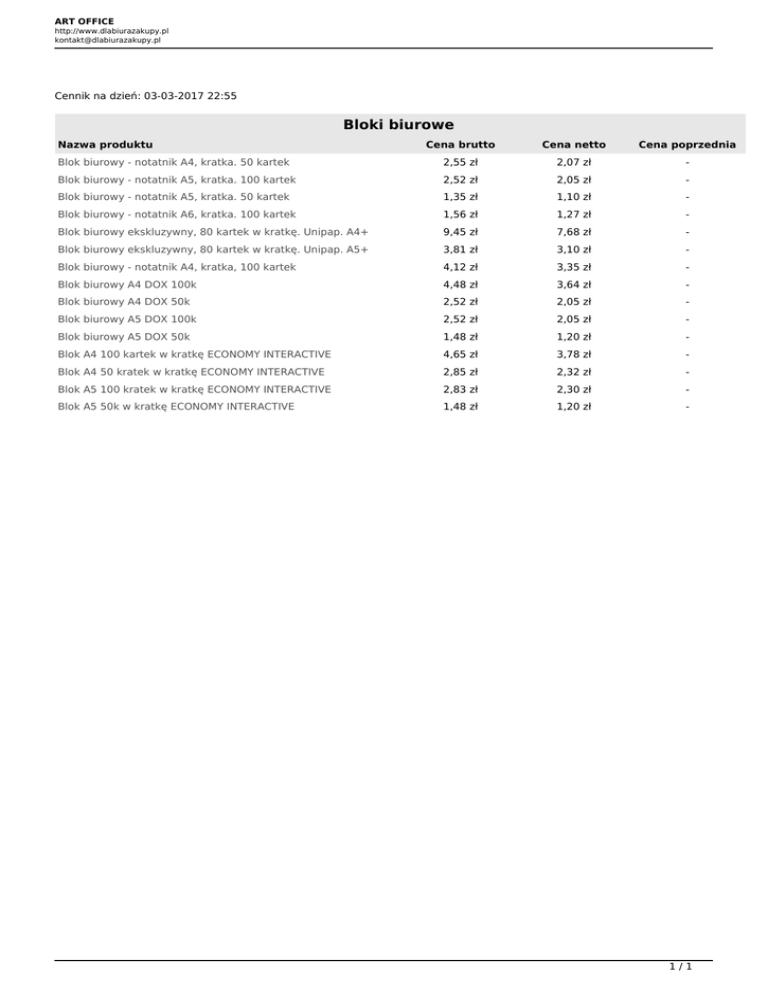 ART OFFICE http://www.dlabiurazakupy.pl [email protected] Cennik na dzień: 03-03-2017 22:55 Bloki biurowe Nazwa produktu Cena brutto Cena netto Cena poprzednia Blok biurowy - notatnik A4, kratka. 50 kartek 2,55 zł 2,07 zł - Blok biurowy - notatnik A5, kratka. 100 kartek 2,52 zł 2,05 zł - Blok biurowy - notatnik A5, kratka. 50 kartek 1,35 zł 1,10 zł - Blok biurowy - notatnik A6, kratka. 100 kartek 1,56 zł 1,27 zł - Blok biurowy ekskluzywny, 80 kartek w kratkę. Unipap. A4+ 9,45 zł 7,68 zł - Blok biurowy ekskluzywny, 80 kartek w kratkę. Unipap. A5+ 3,81 zł 3,10 zł - Blok biurowy - notatnik A4, kratka, 100 kartek 4,12 zł 3,35 zł - Blok biurowy A4 DOX 100k 4,48 zł 3,64 zł - Blok biurowy A4 DOX 50k 2,52 zł 2,05 zł - Blok biurowy A5 DOX 100k 2,52 zł 2,05 zł - Blok biurowy A5 DOX 50k 1,48 zł 1,20 zł - Blok A4 100 kartek w kratkę ECONOMY INTERACTIVE 4,65 zł 3,78 zł - Blok A4 50 kratek w kratkę ECONOMY INTERACTIVE 2,85 zł 2,32 zł - Blok A5 100 kratek w kratkę ECONOMY INTERACTIVE 2,83 zł 2,30 zł - Blok A5 50k w kratkę ECONOMY INTERACTIVE 1,48 zł 1,20 zł - 1/1 Powered by TCPDF (www.tcpdf.org)