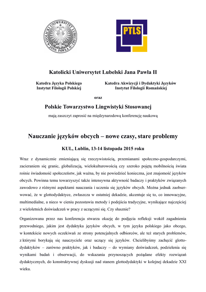 Katolicki Uniwersytet Lubelski Jana Pawła II Katedra Języka Polskiego Instytut Filologii Polskiej Katedra Akwizycji i Dydaktyki Języków Instytut Filologii Romańskiej oraz Polskie Towarzystwo Lingwistyki Stosowanej mają zaszczyt zaprosić na międzynarodową konferencję naukową Nauczanie języków obcych – nowe czasy, stare problemy KUL, Lublin, 13-14 listopada 2015 roku Wraz z dynamicznie zmieniającą się rzeczywistością, przemianami społeczno-gospodarczymi, zacieraniem się granic, globalizacją, wielokulturowością czy szeroko pojętą mobilnością świata rośnie świadomość społeczeństw, jak ważna, by nie powiedzieć konieczna, jest znajomość języków obcych. Powinna temu towarzyszyć także intensywna aktywność badaczy i praktyków związanych zawodowo z różnymi aspektami nauczania i uczenia się języków obcych. Można jednak zaobserwować, że w glottodydaktyce, zwłaszcza w ostatniej dekadzie, akcentuje się to, co innowacyjne, multimedialne, a nieco w cieniu pozostawia metody i podejścia tradycyjne, wynikające najczęściej z wieloletnich doświadczeń w pracy z uczącymi się. Czy słusznie? Organizowana przez nas konferencja stwarza okazję do podjęcia refleksji wokół zagadnienia przewodniego, jakim jest dydaktyka języków obcych, w tym języka polskiego jako obcego, w kontekście nowych oczekiwań ze strony potencjalnych odbiorców, ale też starych problemów, z którymi borykają się nauczyciele oraz uczący się języków. Chcielibyśmy zachęcić glottodydaktyków – zarówno praktyków, jak i badaczy – do wymiany doświadczeń, podzielenia się wynikami badań i obserwacji, do wskazania przynoszących pożądane efekty rozwiązań dydaktycznych, do konstruktywnej dyskusji nad stanem glottodydaktyki w kolejnej dekadzie XXI wieku. W ramach tematu przewodniego proponujemy następujące bloki tematyczne: 1. Efektywna a efektowna dydaktyka języków obcych 2. Sprawności językowe – klasyczne i nowatorskie metody ich rozwijania 3. Rozwój kompetencji językowych a kultura obrazkowa 4. Glottodydaktyka a problemy logopedyczne 5. Glottodydaktyka specjalistyczna 6. E-learning w nauczaniu języków obcych 7. Potrzeby edukacyjne wczoraj i dziś 8. Edukacja międzykulturowa w glottodydaktyce Swój udział w obradach potwierdzili prof. dr hab. Władysław Miodunka (UJ), prof. dr hab. Franciszek Grucza (UW) oraz prof. dr hab. Sambor Grucza (UW). Konferencja odbędzie się w dniach 13-14 listopada 2015 roku na Katolickim Uniwersytecie Lubelskim Jana Pawła II w Lublinie (Wydział Nauk Humanistycznych, Kampus Główny – Aleje Racławickie 14). Językiem roboczym konferencji będzie język polski. Terminarz 1. Nadsyłanie propozycji wystąpień (wraz z abstraktem, min. 1800-3600 znaków z bibliografią) lub zgłoszeń udziału (bez referatu) drogą mailową ([email protected]): do 31 maja 2015 r. 2. Informacja o przyjęciu zgłoszenia: do 15 czerwca 2015 r. 3. Przelew opłaty konferencyjnej: do 30 września 2015 r. (nr konta zostanie podany wraz z informacją o przyjęciu zgłoszenia). Opłata konferencyjna wynosi 300 zł i obejmuje: materiały konferencyjne, napoje oraz przekąski podczas przerw, uroczystą kolację w dniu 13 listopada 2015 r., publikację artykułu (po uzyskaniu pozytywnych recenzji). Informacje o rachunku, na który należy dokonać wpłaty, polecanej bazie miejsc noclegowych w Lublinie oraz szczegółowy program konferencji przedstawione zostaną w kolejnych komunikatach konferencyjnych. 2 Komitet naukowy Prof. dr hab. Franciszek Grucza (UW) Prof. Greta Komur (UHA Mulhouse, Francja) Prof. dr hab. Władysław Makarski (KUL) Prof. KUL, dr hab. Krzysztof Narecki (KUL) Prof KUL, dr hab. Urszula Paprocka-Piotrowska (KUL) Prof. Marzena Watorek (Université Paris 8, Francja) Komitet organizacyjny Prof. KUL, dr hab. Marzena Górecka (IFG, Prodziekan WNH KUL) Dr hab. Henryk Duda (IFP KUL) Dr hab. Magdalena Charzyńska-Wójcik (IFA KUL) Dr hab. Jolanta Klimek-Grądzka (IFP KUL) Dr hab. Maria Mocarz-Kleindienst (IFS KUL) Dr hab. Sebastian Piotrowski (IFR KUL) Dr hab. Magdalena Sowa (IFR KUL) Dr Magdalena Smoleń-Wawrzusiszyn (IFP KUL) Sekretarz konferencji Dr Anna Majewska-Wójcik (IFP KUL) Zgłoszenia na formularzu zgłoszeniowym oraz pytania prosimy kierować na adres: [email protected] 3
