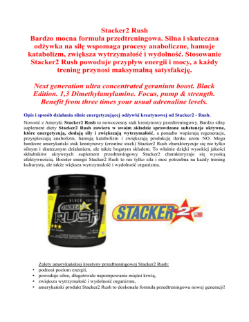 Stacker2 Rush Bardzo mocna formuła przedtreningowa. Silna i skuteczna odżywka na siłę wspomaga procesy anaboliczne, hamuje katabolizm, zwiększa wytrzymałość i wydolność. Stosowanie Stacker2 Rush powoduje przypływ energii i mocy, a każdy trening przynosi maksymalną satysfakcję. Next generation ultra concentrated geranium boost. Black Edition. 1,3 Dimethylamylamine. Focus, pump & strength. Benefit from three times your usual adrenaline levels. Opis i sposób działania silnie energetyzującej odżywki kreatynowej od Stacker2 - Rush. Nowość z Ameryki Stacker2 Rush to nowoczesny stak kreatynowy przedtreningowy. Bardzo silny suplement diety Stacker2 Rush zawiera w swoim składzie sprawdzone substancje aktywne, które energetyzują, dodają siły i zwiększają wytrzymałość, a ponadto wspierają regeneracje, przyspieszają anabolizm, hamują katabolizm i zwiększają produkcję tlenku azotu NO. Mega hardcore amerykański stak kreatynowy (creatine stack) Stacker2 Rush charakteryzuje się nie tylko silnym i skutecznym działaniem, ale także bogatym składem. To właśnie dzięki wysokiej jakości składników aktywnych suplement przedtreningowy Stacker2 charakteryzuje się wysoką efektywnością. Booster energii Stacker2 Rush to nie tylko siła i moc potrzebna na każdy trening kulturysty, ale także większa wytrzymałość i wydolność organizmu. • • • • Zalety amerykańskiej kreatyny przedtreningowej Stacker2 Rush: podnosi poziom energii, powoduje silne, długotrwałe napompowanie mięśni krwią, zwiększa wytrzymałość i wydolność organizmu, amerykański produkt Stacker2 Rush to doskonała formuła przedtreningowa nowej generacji! Sposób działania, zastosowanie oraz charakterystyka oryginalnej odżywki z USA Stacker2 Rush. Z pewnością słyszałeś o ludziach, którzy w ekstremalnych sytuacjach, dopuścili się czynów które wydawały by się niemożliwe. Ta siła pochodzi z nagłego napływu adrenaliny do krwi. Adrenalina nie jest tak po prostu uwalniana, w twoim organizmie, twoje ciało musi wyczuć zagrożenie... Drugim sposobem stymulowanie produkcji adrenaliny jest odpowiednia substancja, a taką właśnie substancję posiada amerykańska odżywka Stacker2 Rush. Adrenalina daje ci kopa większego niż parę kubków kawy. Nagły napływ energii jest dużo bardziej intensywny, pochodzi z głębi twojego organizmu. Poczujesz moc w każdym włóknie swoich mięśni. Zażywając już jedną porcję ultra skoncentrowanej formuły przedtreningowej Stacker2 Rush przed treningiem, podniesiesz poziom adrenaliny trzykrotnie, co z pewnością nie zostanie nie zauważone. Większy! Szybszy! Dzięki Stacker2 Rush osiągniesz lepsze wyniki niż kiedykolwiek wcześniej! Ćwicząc na siłowni wiele razy dochodziłeś do granicy swoich możliwości, Stacker2 Rush dzięki swojej unikalnej formule pozwoli ci na przekroczenie dotychczas nie osiągalnych barier. To jest właśnie adrenalina, która umożliwi ci pracę z większymi ciężarami, wykonanie większej liczby powtórzeń i dłuższych sesji treningowych. Twoje mięśnie będą w stanie wytrzymać cięższe, bardziej intensywne treningi, przez co dostaną odpowiednie bodźce do wzrostu. Stacker2 Rush to niespotykany nigdy dotąd wzrost energii, skupienia i pewności siebie, dzięki czemu każdy twój trening będzie wykorzystany na 100%. W efekcie Rush gwarantuje szybki wzrost mięśni. Bardzo dobry stak kreatynowy przedtreningowy Rush to nie tylko zastrzyk energii. Kreatyna i arginina sprawią że po każdej sesji treningowej twoje mięśnie będą napompowane jak nigdy wcześniej, dzięki czemu po ciężkim treningu zobaczysz w lustrze należyte rezultaty. Z każdym treningiem będziesz dźwigał większe ciężary, a wyniki będą widoczne natychmiast po treningu - i o to w tym wszystkim chodzi. Legalny doping - Stacker2 Rush silnie energetyzuje i wspiera procesy anaboliczne! Stacker2 Rush to pierwszy i jak na razie jedyny produkt firmy Stacker-2 zawierający substancje sklasyfikowane jako legalny doping, nie należy jednak mylić tego z substancjami szkodliwymi, czy też zabronionymi prawem. Stacker-2 Rush to całkowicie legalny i bezpieczny suplement diety. Pomimo tego, że produkt jest niezwykle mocny, to jest dopuszczony do spożycia. Nie mogą go jedynie zażywać osoby poddawane testom antydopingowym. Dawkowanie oraz sposób użycia amerykańskiej formuły przedtreninowej, czyli jak stosować odżywkę kreatynową Stacker2 Rush: Bierz 1 porcję odżywki Stacker2 Rush (9 gram = 3 miarki) ok. 30 min. przed treningiem. 1 porcję (3 miarki) należy rozpuścić w 150ml zimnej wody. Możesz zwiększyć porcję do 15 gram (5 miarek) - wtedy rozmieszaj proszek w 250 ml zimnej wody. Nigdy nie przekraczaj porcji złożonej z 5 miarek. Opis i charakterystyka preparatu sportowego Stacker-2 Rush dedykowanego wyłącznie dla zawodowców: • 1 porcja = 3 miarki (9 gram) amerykańskiej formuły przedtrenignowej • Ilość porcji w opakowaniu: 50 • Zawartość opakowania: 454 gramy kreatyny przedtreningowej z USA Skład rewelacyjnej formuły przedtreningowej o silnym działaniu pobudzającym i energetyzującym - Stacker2 Rush: Zawartość odżywki: jednej porcji 9 gram Vaso PmPac3 complex 5040 mg - Monohydrat kreatyny - AAKG - L-leucyna - L-Izoleucyna - L-walina Geranol Stimulant X - Beta Alanina - Kofeina - 4-Methylhexan-2-amine HCL - 1,3 Dimethylamylamine 3480 mg - Ekstrakt z jagód schizandra - Tauryna • • • • • • Inne składniki amerykańskiego preparatu Stacker-2 Rush: citric acid, calcium silicate, natural and artificial flavors, natural colouring, sucralose, acesulfame-K. www.kulturystyka.sklep.pl