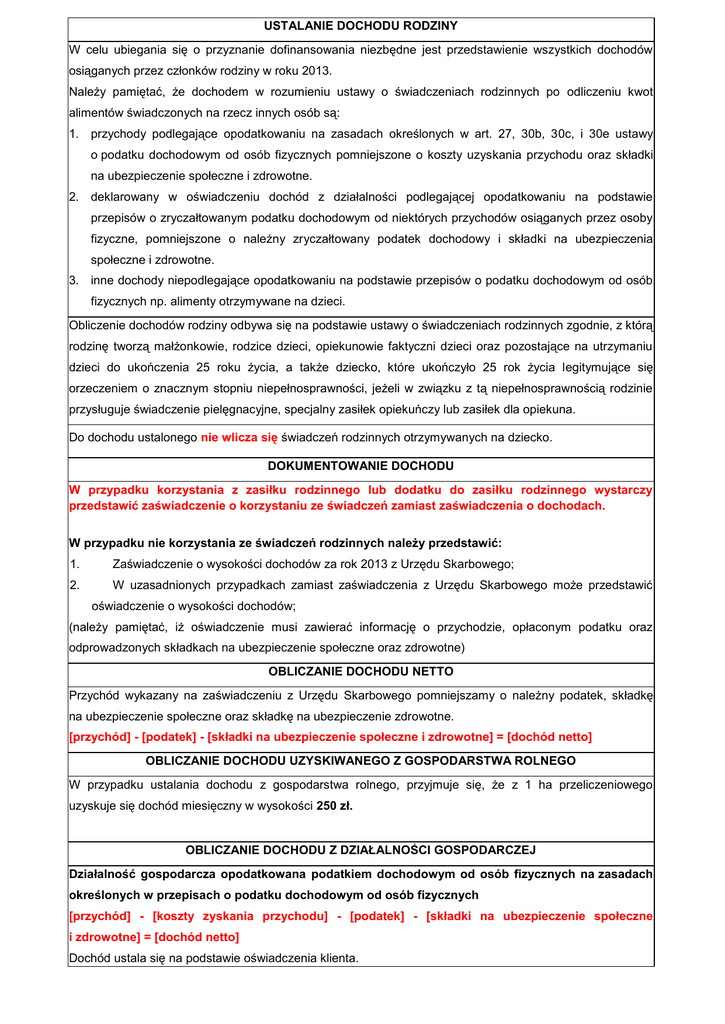 USTALANIE DOCHODU RODZINY W celu ubiegania się o przyznanie dofinansowania niezbędne jest przedstawienie wszystkich dochodów osiąganych przez członków rodziny w roku 2013. Należy pamiętać, że dochodem w rozumieniu ustawy o świadczeniach rodzinnych po odliczeniu kwot alimentów świadczonych na rzecz innych osób są: 1. przychody podlegające opodatkowaniu na zasadach określonych w art. 27, 30b, 30c, i 30e ustawy o podatku dochodowym od osób fizycznych pomniejszone o koszty uzyskania przychodu oraz składki na ubezpieczenie społeczne i zdrowotne. 2. deklarowany w oświadczeniu dochód z działalności podlegającej opodatkowaniu na podstawie przepisów o zryczałtowanym podatku dochodowym od niektórych przychodów osiąganych przez osoby fizyczne, pomniejszone o należny zryczałtowany podatek dochodowy i składki na ubezpieczenia społeczne i zdrowotne. 3. inne dochody niepodlegające opodatkowaniu na podstawie przepisów o podatku dochodowym od osób fizycznych np. alimenty otrzymywane na dzieci. Obliczenie dochodów rodziny odbywa się na podstawie ustawy o świadczeniach rodzinnych zgodnie, z którą rodzinę tworzą małżonkowie, rodzice dzieci, opiekunowie faktyczni dzieci oraz pozostające na utrzymaniu dzieci do ukończenia 25 roku życia, a także dziecko, które ukończyło 25 rok życia legitymujące się orzeczeniem o znacznym stopniu niepełnosprawności, jeżeli w związku z tą niepełnosprawnością rodzinie przysługuje świadczenie pielęgnacyjne, specjalny zasiłek opiekuńczy lub zasiłek dla opiekuna. Do dochodu ustalonego nie wlicza się świadczeń rodzinnych otrzymywanych na dziecko. DOKUMENTOWANIE DOCHODU W przypadku korzystania z zasiłku rodzinnego lub dodatku do zasiłku rodzinnego wystarczy przedstawić zaświadczenie o korzystaniu ze świadczeń zamiast zaświadczenia o dochodach. W przypadku nie korzystania ze świadczeń rodzinnych należy przedstawić: 1. Zaświadczenie o wysokości dochodów za rok 2013 z Urzędu Skarbowego; 2. W uzasadnionych przypadkach zamiast zaświadczenia z Urzędu Skarbowego może przedstawić oświadczenie o wysokości dochodów; (należy pamiętać, iż oświadczenie musi zawierać informację o przychodzie, opłaconym podatku oraz odprowadzonych składkach na ubezpieczenie społeczne oraz zdrowotne) OBLICZANIE DOCHODU NETTO Przychód wykazany na zaświadczeniu z Urzędu Skarbowego pomniejszamy o należny podatek, składkę na ubezpieczenie społeczne oraz składkę na ubezpieczenie zdrowotne. [przychód] - [podatek] - [składki na ubezpieczenie społeczne i zdrowotne] = [dochód netto] OBLICZANIE DOCHODU UZYSKIWANEGO Z GOSPODARSTWA ROLNEGO W przypadku ustalania dochodu z gospodarstwa rolnego, przyjmuje się, że z 1 ha przeliczeniowego uzyskuje się dochód miesięczny w wysokości 250 zł. OBLICZANIE DOCHODU Z DZIAŁALNOŚCI GOSPODARCZEJ Działalność gospodarcza opodatkowana podatkiem dochodowym od osób fizycznych na zasadach określonych w przepisach o podatku dochodowym od osób fizycznych [przychód] - [koszty zyskania przychodu] - [podatek] - [składki na ubezpieczenie społeczne i zdrowotne] = [dochód netto] Dochód ustala się na podstawie oświadczenia klienta.