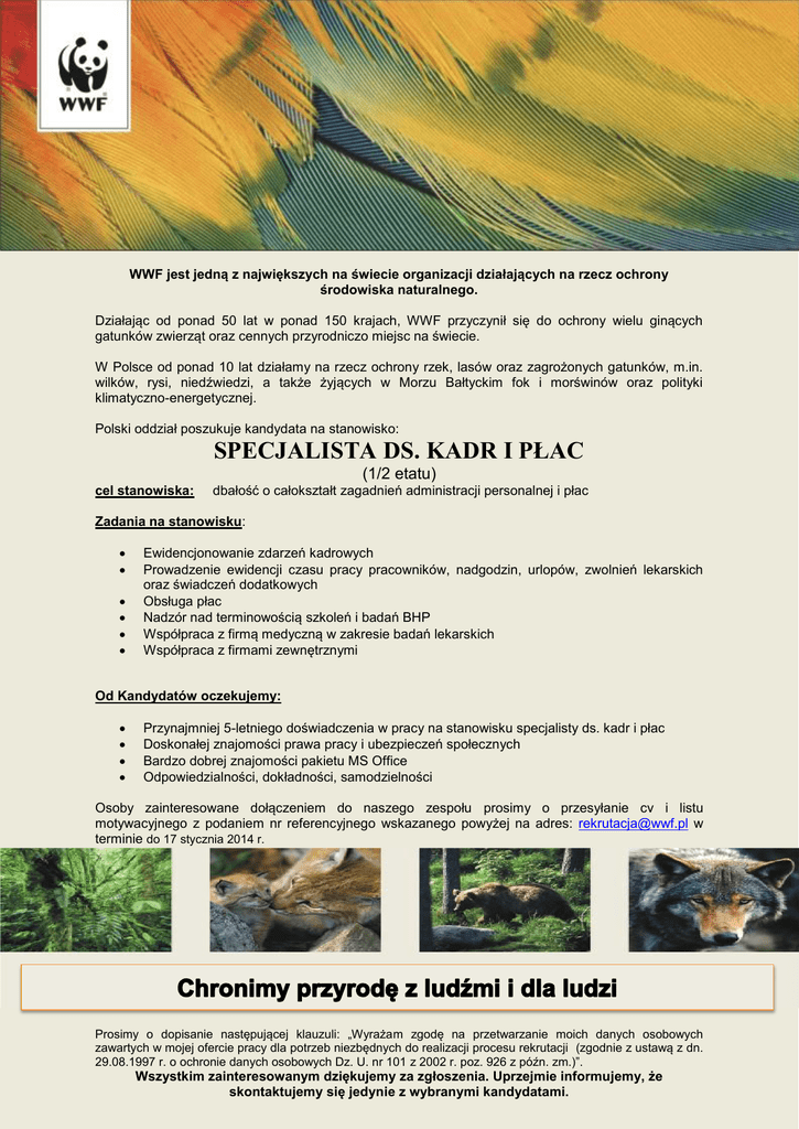 WWF jest jedną z największych na świecie organizacji działających na rzecz ochrony środowiska naturalnego. Działając od ponad 50 lat w ponad 150 krajach, WWF przyczynił się do ochrony wielu ginących gatunków zwierząt oraz cennych przyrodniczo miejsc na świecie. W Polsce od ponad 10 lat działamy na rzecz ochrony rzek, lasów oraz zagrożonych gatunków, m.in. wilków, rysi, niedźwiedzi, a także żyjących w Morzu Bałtyckim fok i morświnów oraz polityki klimatyczno-energetycznej. Polski oddział poszukuje kandydata na stanowisko: SPECJALISTA DS. KADR I PŁAC (1/2 etatu) cel stanowiska: dbałość o całokształt zagadnień administracji personalnej i płac Zadania na stanowisku: Ewidencjonowanie zdarzeń kadrowych Prowadzenie ewidencji czasu pracy pracowników, nadgodzin, urlopów, zwolnień lekarskich oraz świadczeń dodatkowych Obsługa płac Nadzór nad terminowością szkoleń i badań BHP Współpraca z firmą medyczną w zakresie badań lekarskich Współpraca z firmami zewnętrznymi Od Kandydatów oczekujemy: Przynajmniej 5-letniego doświadczenia w pracy na stanowisku specjalisty ds. kadr i płac Doskonałej znajomości prawa pracy i ubezpieczeń społecznych Bardzo dobrej znajomości pakietu MS Office Odpowiedzialności, dokładności, samodzielności Osoby zainteresowane dołączeniem do naszego zespołu prosimy o przesyłanie cv i listu motywacyjnego z podaniem nr referencyjnego wskazanego powyżej na adres: [email protected] w terminie do 17 stycznia 2014 r. Prosimy o dopisanie następującej klauzuli: „Wyrażam zgodę na przetwarzanie moich danych osobowych zawartych w mojej ofercie pracy dla potrzeb niezbędnych do realizacji procesu rekrutacji (zgodnie z ustawą z dn. 29.08.1997 r. o ochronie danych osobowych Dz. U. nr 101 z 2002 r. poz. 926 z późn. zm.)”. Wszystkim zainteresowanym dziękujemy za zgłoszenia. Uprzejmie informujemy, że skontaktujemy się jedynie z wybranymi kandydatami.