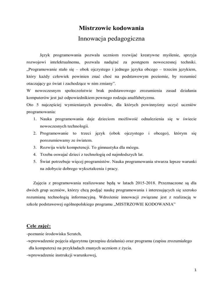Mistrzowie kodowania Innowacja pedagogiczna Język programowania pozwala uczniom rozwijać kreatywne myślenie, sprzyja rozwojowi intelektualnemu, pozwala nadążać za postępem nowoczesnej techniki. „Programowanie stało się – obok ojczystego i jednego języka obcego – trzecim językiem, który każdy człowiek powinien znać choć na podstawowym poziomie, by rozumieć otaczający go świat i zachodzące w nim zmiany”. W nowoczesnym społeczeństwie brak podstawowego zrozumienia zasad działania komputerów jest już odpowiednikiem pewnego rodzaju analfabetyzmu. Oto 5 najczęściej wymienianych powodów, dla których powinnyśmy uczyć uczniów programowania: 1. Nauka programowania daje dzieciom możliwość odnalezienia się w świecie nowoczesnych technologii. 2. Programowanie to trzeci język (obok ojczystego i obcego), którym się porozumiewamy ze światem. 3. Rozwija wiele kompetencji. To gimnastyka dla mózgu. 4. Trzeba oswajać dzieci z technologią od najmłodszych lat. 5. Świat potrzebuje więcej programistów. Nauka programowania stwarza lepsze warunki na zdobycie dobrego wykształcenia i pracy. Zajęcia z programowania realizowane będą w latach 2015-2018. Przeznaczone są dla dwóch grup uczniów, którzy chcą podjąć naukę programowania i interesujących się szeroko rozumianą technologią informacyjną. Wdrożenie innowacji związane jest z realizacją w szkole podstawowej ogólnopolskiego programu „MISTRZOWIE KODOWANIA” Cele zajęć: -poznanie środowiska Scratch, -wprowadzenie pojęcia algorytmu (przepisu działania) oraz programu (zapisu zrozumiałego dla komputera) na przykładach znanych uczniom z życia. -wprowadzenie instrukcji warunkowej, 1 -wprowadzenie pojęcia zmiennej, - wprowadzenie losowości, - wprowadzenie algorytmu przeszukiwania binarnego, -wprowadzenie mechanizmu komunikatów w środowisku Scratch, -opracowanie projektu gry zręcznościowej, logicznej oraz takiej, w której występują procesy wykonywane równolegle, -opracowanie scenariusza multimedialnej kartki świątecznej, -implementacja gry w środowisku Scratch. Metody i formy pracy: pogadanka, dyskusja, praca z tekstem, burza mózgów, zadania praktyczne. Harmonogram działań: Moduł I Pierwsze kroki w Scratch’u Część 1-Wprowadzenie teoretyczne, czyli co będziemy robili na zajęciach Część 2-Poznajemy środowisko pracy i podstawowe polecenia (klocki) Scratch’a Część 3-Modyfikujemy kostium i animujemy duszka Część 4-Rysujemy kwadrat Moduł II Projekt „Kot goni mysz” Część 1-Omówienie rozwiązań zadań dodatkowych z modułu I Część 2-Wprowadzenie do scenariusza gry, zmiana tła sceny oraz dodanie nowego duszka Część 3-Sterowanie duszkiem z użyciem myszy komputerowej Część 4-Programowanie reakcji Myszki na spotkanie z Kotkiem – instrukcja warunkowa Część 5-Wprowadzenie ustawień początkowych Myszki – wprowadzenie współrzędnych Część 6-Planowanie i programowanie zachowania Kotka 2 Moduł III Projekt „Kot w labiryncie” Część 1-Omówienie rozwiązań zadań dodatkowych z modułu I Część 2-Wprowadzenie do scenariusza gry, zmiana tła sceny oraz dodanie nowego duszka Część 3-Sterowanie duszkiem z użyciem myszy komputerowej Część 4-Programowanie reakcji Myszki na spotkanie z Kotkiem – instrukcja warunkowa Część 5-Wprowadzenie ustawień początkowych Myszki – wprowadzenie współrzędnych Część 6-Planowanie i programowanie zachowania Kotka Moduł IV Projekt „Kot zastawia pułapkę na mysz” Część 1-Omówienie rozwiązania zadania dodatkowego z modułu III Cześć 2-Zaprojektowanie i napisanie programu automatycznie sterującego duszkami – Kot czyhający w pułapce na Myszkę Cześć 3-Dodanie losowości w poruszaniu się myszki Moduł V Projekt „Gra zręcznościowa – odbijanie piłeczki” Część 1-Omówienie rozwiązań wybranych zadań dodatkowych z modułu IV Cześć 2-Zaprojektowanie i implementacja gry polegającej na odbijaniu piłeczki paletką sterowaną przez gracza za pomocą myszy komputerowej Cześć 3-Modyfikacje programu – dodanie planszy Koniec gry Część 4-Omówienie zadań dodatkowych oraz do samodzielnego wykonania Moduł VI Projekt „Gra logiczna – zgadywanie liczby” Część 1-Omówienie rozwiązań wybranych zadań dodatkowych z modułu V Cześć 2-Zaprojektowanie gry polegającej na zgadywaniu liczby, którą wylosował komputer Cześć 3-Implementacja gry logicznej „Zgadywanie liczby” Cześć 4-Wprowadzenie drugiego duszka do gry i komunikacji między ich skryptami Cześć 5-Wprowadzenie licznika pytań 3 Moduł VII Projekt „Zawody lekkoatletyczne duszków” Część 1-Omówienie rozwiązania zadania dodatkowego z modułu VI Część 2-Zaprojektowanie programu symulującego wyścigi duszków Część 3-Realizacja programu przez uczniów Moduł VIII Projekt „Multimedialna kartka świąteczna” Część 1-Omówienie rozwiązania zadań dodatkowych z modułu VII Część 2-Wprowadzenie Część 3-Opracowywanie scenariuszy kartek przez uczniów Część 4-Implementacja kartek przez uczniów Część 5-Prezentacja kartek przez zespoły uczniowskie Ewaluacja: 1. Analiza wyników podejmowanych przez uczniów działań praktycznych (realizacja gry). 2. Obserwacja pracy uczniów podczas zajęć. 4