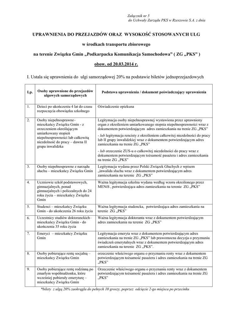 Załącznik nr 5 do Uchwały Zarządu PKS w Rzeszowie S.A. z dnia UPRAWNIENIA DO PRZEJAZDÓW ORAZ WYSOKOŚĆ STOSOWANYCH ULG w środkach transportu zbiorowego na terenie Związku Gmin „Podkarpacka Komunikacja Samochodowa” ( ZG „PKS” ) obow. od 20.03.2014 r. I. Ustala się uprawnienia do ulgi samorządowej 20% na podstawie biletów jednoprzejazdowych Lp. Osoby uprawnione do przejazdów ulgowych samorządowych 1. Dzieci po ukończeniu 4 lat do czasu rozpoczęcia obowiązku szkolnego Oświadczenie opiekuna 2. Osoby niepełnosprawne– mieszkańcy Związku Gmin - z orzeczeniem określającym umiarkowany stopień niepełnosprawności lub całkowitą niezdolność do pracy – dawna II grupa inwalidzka Legitymacja osoby niepełnosprawnej wystawiona przez uprawniony organ z określeniem umiarkowanego stopnia niepełnosprawności wraz z dokumentem potwierdzającym adres zamieszkania na trenie ZG „PKS” Podstawa uprawnienia / dokument poświadczający uprawnienia - lub legitymacja rencisty z określeniem całkowitej niezdolności do pracy lub II grupy inwalidzkiej wraz z dokumentem potwierdzającym adres zamieszkania na trenie ZG „PKS” - lub orzeczenie ZUS-u o całkowitej niezdolności do pracy wraz z dokumentem potwierdzającym tożsamość pasażera i adres zamieszkania na trenie ZG „PKS” 3. Osoby niepełnosprawne z narządu słuchu – mieszkańcy Związku Gmin Legitymacja wydana przez Polski Związek Głuchych z wpisem „inwalida słuchu wraz z dokumentem potwierdzającym adres zamieszkania na terenie ZG „PKS” 4. Uczniowie szkół podstawowych, gimnazjalnych, ponad gimnazjalnych i policealnych do 24 roku życia – mieszkańcy Związku Gmin Ważna legitymacja szkolna wydana według wzoru określonego przez MENiS , potwierdzająca adres zamieszkania na terenie ZG „PKS” 5. Studenci – mieszkańcy Związku Gmin - do ukończenia 26 roku życia Ważna legitymacja studencka, potwierdzająca adres zamieszkania na terenie ZG „PKS” 6. Uczestnicy studiów doktoranckich– mieszkańcy Związku Gmin - do ukończenia 35 roku życia Ważna legitymacja doktoranta wraz z dokumentem potwierdzającym adres zamieszkania na terenie ZG „PKS” 7. Emeryci – mieszkańcy Związku Gmin Legitymacja emeryta wraz z dokumentem potwierdzającym adres zamieszkania na trenie ZG „PKS” lub prawomocna decyzja o przyznaniu świadczeń emerytalnych wraz z dokumentem potwierdzającym adres zamieszkania na terenie ZG „PKS”. 8. Osoby pobierające rentę socjalną – mieszkańcy Związku Gmin orzeczenie właściwego organu o przyznaniu renty wraz z dokumentem potwierdzającym tożsamość pasażera i adres zamieszkania na trenie ZG „PKS” 9. Osoby pobierające rentę rodzinną po zmarłym współmałżonku, które wcześniej pobierały emeryturę – mieszkańcy Związku Gmin Orzeczenie właściwego organu o przyznaniu renty wraz z dokumentem potwierdzającym tożsamość pasażera i adres zamieszkania na trenie ZG „PKS” *bilety z ulgą 20% zaokrągla do pełnych 10 groszy, poprzez odcięcie 2-go miejsca po przecinku II. Ustala się uprawnienia do przejazdów z ulgą 20% na podstawie biletów samorządowych – miesięcznych trasowanych. Lp. Osoby uprawnione do przejazdów ulgowych samorządowych 1. Dzieci po ukończeniu 4 lat do czasu rozpoczęcia obowiązku szkolnego Oświadczenie opiekuna 2. Osoby niepełnosprawne z narządu słuchu – mieszkańcy Związku Gmin Legitymacja wydana przez Polski Związek Głuchych z wpisem „inwalida słuchu” wraz z dokumentem potwierdzający adres zamieszkania na terenie ZG „PKS” Podstawa uprawnienia / dokument poświadczający uprawnienia *bilety z ulgą 20% zaokrągla. do pełnych 10 groszy, poprzez odcięcie 2-go miejsca po przecinku III. Ustala się uprawnienia do przejazdów na podstawie biletów sieciowych ulgowych Lp. Osoby uprawnione do przejazdów ulgowych samorządowych 1. Mieszkańcy Związku Gmin Podstawa uprawnienia / dokument poświadczający uprawnienia -Oświadczenie o wykupieniu biletu miesięcznego trasowanego lub sieciowego ZTM Rzeszów na terenie miasta Rzeszowa wraz z dołączoną kserokopią tego biletu. -Dokument potwierdzający adres zamieszkania na terenie Związku Gmin „PKS” IV. Ustala się uprawnienia do przejazdów na podstawie samorządowych biletów okresowych rodzinnych (31 dniowych) . Lp. Osoby uprawnione do przejazdów ulgowych samorządowych 1. Pracujący mieszkańcy Związku Gmin Podstawa uprawnienia / dokument poświadczający uprawnienia Oświadczenie o zatrudnieniu oraz dokument tożsamości potwierdzający adres zamieszkania na terenie Związku Gmin „PKS” V. Ustala się uprawnienia do przejazdów na podstawie samorządowych biletów socjalnych – okresowych (360 dni ). Lp. 1. Osoby uprawnione do przejazdów ulgowych samorządowych Podstawa uprawnienia / dokument poświadczający uprawnienia Osoby niepełnosprawne - mieszkańcy Związku Gmin - z orzeczeniem określającym znaczny stopień niepełnosprawności lub całkowitą niezdolność do pracy i samodzielnej egzystencji (dawna I grupa inwalidzka) - Legitymacja osoby niepełnosprawnej wystawiona przez uprawniony organ z określeniem znacznego stopnia niepełnosprawności wraz z dokumentem potwierdzającym tożsamość pasażera i adres zamieszkania na terenie Związku Gmin „PKS” ( wraz z opiekunem na podstawie EM-karty osoby uprawnionej do ulgi) - lub legitymacja rencisty z wpisem o całkowitej niezdolności do pracy i samodzielnej egzystencji lub I grupy inwalidzkiej wraz z dokumentem potwierdzającym tożsamość pasażera i adres zamieszkania na terenie Związku Gmin „PKS” - lub orzeczenie wydane przez ZUS z określeniem całkowitej niezdolności do pracy i samodzielnej egzystencji lub niezdolności do samodzielnej egzystencji wraz z dokumentem potwierdzającym tożsamość pasażera i adres zamieszkania na terenie Związku Gmin „PKS” 2. Niewidomi mieszkańcy Związku Gmin wraz z przewodnikiem towarzyszącym im w pojeździe 