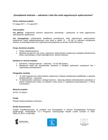 „Zarządzanie kadrami – szkolenie i staż dla osób zagrożonych wykluczeniem” Okres realizacji projektu 01 lutego 2011 – 31 maja 2011 Cele projektu Cel główny: zwiększenie poziomu aktywności zawodowej i społecznej 14 osób zagrożonych wykluczeniem społecznym. Cel szczegółowy: podniesienie kwalifikacji zawodowych osób zagrożonych wykluczeniem społecznym (osób niepełnosprawnych oraz osób w wieku 15 – 25 lat,) w zakresie zarządzania kadrami w przedsiębiorstwie lub organizacji pozarządowej na terenie miasta Warszawy. Grupy docelowe projektu Osoby niepełnosprawne. Młodzież poniżej 25 roku życia, zagrożona wykluczeniem społecznym (pułapką dziedziczenia biedy, pochodzącą z rodzin patologicznych, domów dziecka). Działania w ramach projektu 1. Szkolenie z obsługi kadrowo – płacowej – 15 dni (90 godzin). 2. Miesięczne staże dla absolwentów szkolenia w działach kadrowych prywatnych firm i organizacji pozarządowych. Osiągnięte rezultaty 1. 14 osób zagrożonych wykluczeniem społecznym zdobyło podstawowe kwalifikacje w zakresie obsługi kadrowo – płacowej. 2. 12 absolwentów szkolenia z obsługi kadrowo - płacowej zdobyło doświadczenie zawodowe w trakcie miesięcznych staży na otwartym rynku pracy (7 organizacji pozarządowych i 3 firmy komercyjne). Wartość projektu 44 651,12 złotych Uwagi Projekt został prawidłowo rozliczony. Źródło finansowania: Projekt współfinansowany ze środków Unii Europejskiej w ramach Europejskiego Funduszu Społecznego, Poddziałanie 7.2.1 Programu Operacyjnego Kapitał Ludzki (umowa nr UDAPOKL.07.02.01-14-061/08).