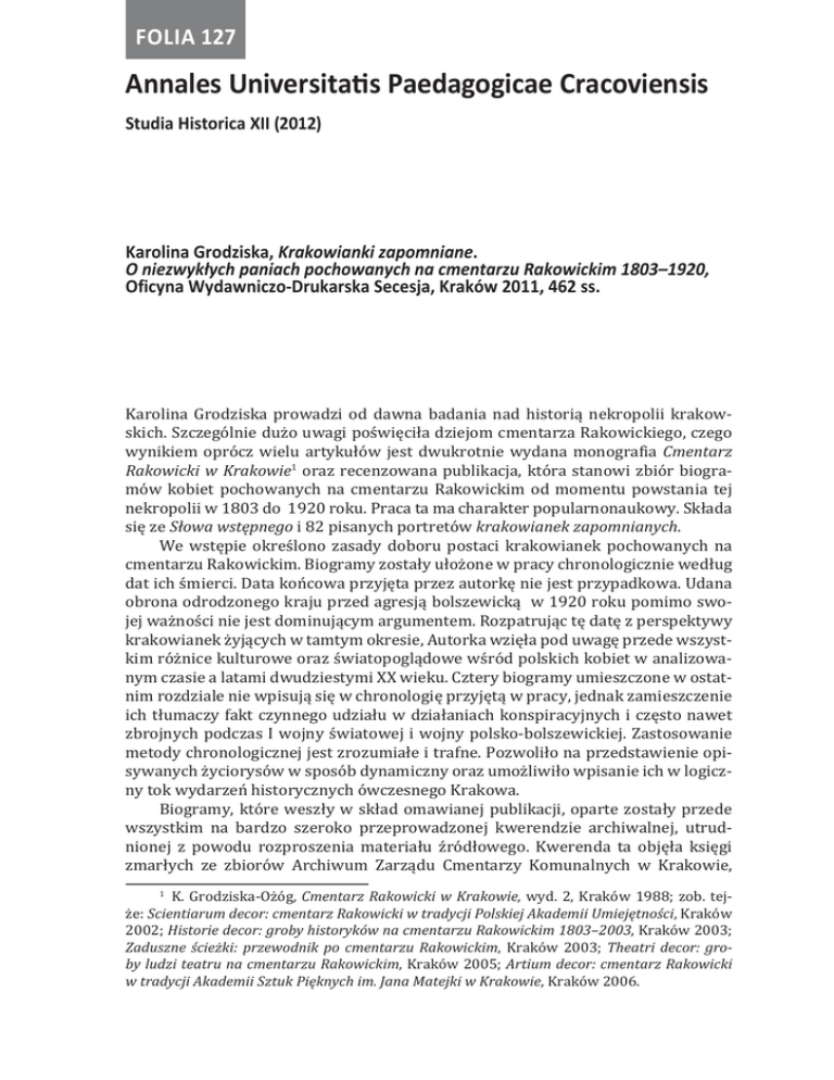 &K>/ϭϮϳ ŶŶĂůĞƐhŶŝǀĞƌƐŝƚĂƟƐWĂĞĚĂŐŽŐŝĐĂĞƌĂĐŽǀŝĞŶƐŝƐ ^ƚƵĚŝĂ,ŝƐƚŽƌŝĐĂy//;ϮϬϭϮͿ Karolina Grodziska, Krakowianki zapomniane.... KŶŝĞnjǁLJŬųLJĐŚƉĂŶŝĂĐŚƉŽĐŚŽǁĂŶLJĐŚŶĂĐŵĞŶƚĂƌnjƵZĂŬŽǁŝĐŬŝŵϭϴϬϯʹϭϵϮϬ͕ KĨŝĐLJŶĂtLJĚĂǁŶŝĐnjŽͲƌƵŬĂƌƐŬĂ^ĞĐĞƐũĂ͕<ƌĂŬſǁϮϬϭϭ͕ϰϲϮƐƐ͘ <ĂƌŽůŝŶĂ^njůħnjĂŬ ¦ Ǥ ×Ăä¸ Ï ǡ × Ï× Cmentarz Rakowicki w Krakowieͳ ǡ × ×× ͳͺͲ͵ͳͻʹͲǤ ǤÏ ¸Ï¸ͺʹ ×krakowianek zapomnianychǤ ¸ ä ǤÏÏĂ Ï ä ǤÑ ¸¸Ǥ ¦ ¦ͳͻʹͲĂä ¦ Ǥ¦ ¸¸ æ ǡ¸Ï¸×Ă ä¦ä× Ǥ ¦¸ ¸¸¦ ǡ Ï ÏÏ ¸ äǦ Ǥ ÏǤÏ Ă ×× ĂÏ Ñ × Ǥ ǡ×ÏÏ ǡÏ ǡ Ï Ā×ÏǤ ¸Ï ¸ Ï × ¦ ǡ Ǥ ǦĂ×ǡCmentarz Rakowicki w Krakowie,Ǥʹǡ×ͳͻͺͺǢǤĂǣ ǣ ¸ä ǡ× ʹͲͲʹǢ ǣ× ͷ;ͶȂͶͶǡ×ʹͲͲ͵Ǣ ä Ăǣ ǡ × ʹͲͲ͵Ǣ ǣ by ludzi teatru na cmentarzu Rakowickimǡ×ʹͲͲͷǢ ǣ ¸ Ǥǡ×ʹͲͲǤ ͳ ϮϳϬ <ĂƌŽůŝŶĂ^njůħnjĂŬ ¸ Ă × Ñ Ǥ Ï ¸× Ñǡ ¸ × Ï © ×ǡ × Ï ¸ Ǥ Ï×ø¦¸¦¦ ¦ÏǡǷdzǡǷ dz Ƿ dzǤ ǡ× ÏÏ ǡ ¦ ǡ Ā×Ï Ǥ ϸǡǡ ¸ ǡ Ï× ×ÏǤ¸ ϸ䩸 ¸ Ï Ǥ Ï Ă © 1803 Córka ǡ Ă ×ǡ × ¸Ï¦ ¸ĂǤĂ ¸ä ¸ ¸×ǡÑ ÑǤ Ϧ ǡ Ă Ï ǡ Ă Ă Ï ¦ ääǤĂÏ×Ă Ï ǡ ǡ ǡ ǡ Ă Ïæ Ă Ǥ ǡ Ă × Ă ǡ Ā×Ï ǡ× ¸ Ï Ǥ Ï ǡ ¦Ǥ ×Ă Ï ×ǡ ǡä Ă Ï ¸ Ǥ ÏϦ ¦ ¦ ¦ Ǥ ǡ¸Ă ǡǡ¸ ǡÏϦ ä©Ǥ ¦ ä© ¦ Ϧ Ï ¸Ăǡ ¸ Ǥ Ă ¦Ă Ï ×ÏǡĂÑ ǡ× Ï Ă ǡ Ă Ñǡ × Ï Ïä Ă Ïǡ ǡ× Ï ¸ĂǤǡ ¸Ƿ dz ĂϸÏä© ¦ǡæ ÏĂ Ñ Ǥ ¦ ¦ ä Ï Ïä© ǡ × ¸ä© ϸ ×Ǥ Ï Ï ä ǡĂ©¸ Ï ¦ ¸ Ǥ Ïä ¦ ¦ǡ ¦ Ñ × Ï <ĂƌŽůŝŶĂ'ƌŽĚnjŝƐŬĂ͕<ƌĂŬŽǁŝĂŶŬŝnjĂƉŽŵŶŝĂŶĞ͘͘͘ [271] ¸ ×ǡ ¸ Ϧ ä ×Ǥ ×Ā Ă¦ ¦ Ïǡ Ă Ï ǡ Ï Ā×Ï Ǥ ©ǡĂ Ă äǡǡ¦Ă¸Ă ¦ Ǥ ǡ×Ï¸Ï ¸©¸ Ǥ ä Ï Ăä© ¸ä ×Ǥ ¸Ï© ¸ ǡÏĂÏä Ǥϸ ǡ Ǥ ¦Ï ǣ ÏÑÏǡ ¸ĂÏ Ƿ Ñdz ÏǤĂ äÏ ä Ǥ ä¦ Ï ǤÏÏĂ© ¸ ǡ× Ï¦ä¦¸ Ïä Ǥ ¦Ă ¦ ǤÏ××zapomnianych artystek sceny krakowskiejǡä¦ ǡĂ × ͳͺͶ͵ǡ ¸ Ăǡ Ï× Ā×Ï Ǥ Ǥä © ǡ ǡ ¸ ǡ× ×Ï× ¸ÏǤ ¦Ă Ă©× ×Ă Ñ ×× Ǥ ¦ Ā×ÏĂ Ǥ ϸ¸¦ ¦ ¸ Ǥ ¦¦×¸ ǦÏ× Ǥ¸¦ǡ¸×Ăǡøà ǡ × Ǥ Ï × Ï¦ × ×Ǥ Ï ¸Ï ¦ǡ Ă × Ă Ï×ǡ Ϧ¸Ǥ ǡ ¸¦ Ï × Ǥ Ă ǡĂä© ÏĂ©Ïä ĂÑĂ Ǥ ¸ (Kraków)