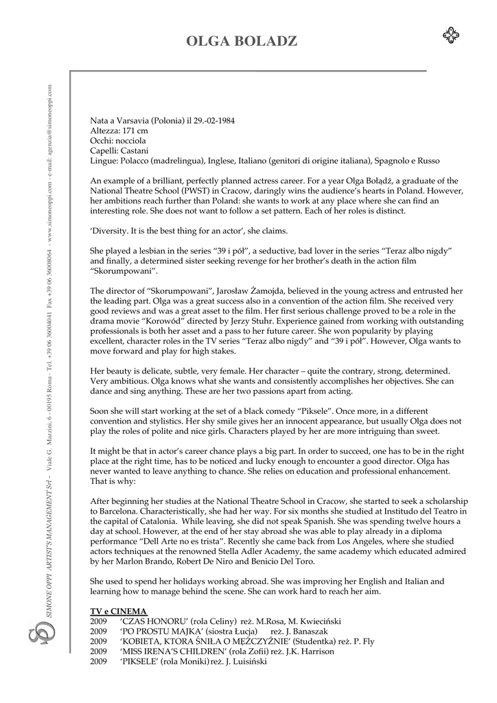 SIMONE OPPI ARTIST'S MANAGEMENT Srl - Viale G. Mazzini, 6 - 00195 Roma - Tel. +39 06 36004041 Fax +39 06 36008064 - www.simoneoppi.com - e-mail: [email protected] OLGA BOLADZ Nata a Varsavia (Polonia) il 29.-02-1984 Altezza: 171 cm Occhi: nocciola Capelli: Castani Lingue: Polacco (madrelingua), Inglese, Italiano (genitori di origine italiana), Spagnolo e Russo An example of a brilliant, perfectly planned actress career. For a year Olga Bołądź, a graduate of the National Theatre School (PWST) in Cracow, daringly wins the audience’s hearts in Poland. However, her ambitions reach further than Poland: she wants to work at any place where she can find an interesting role. She does not want to follow a set pattern. Each of her roles is distinct. ‘Diversity. It is the best thing for an actor’, she claims. She played a lesbian in the series “39 i pół”, a seductive, bad lover in the series “Teraz albo nigdy” and finally, a determined sister seeking revenge for her brother’s death in the action film “Skorumpowani”. The director of “Skorumpowani”, Jarosław Żamojda, believed in the young actress and entrusted her the leading part. Olga was a great success also in a convention of the action film. She received very good reviews and was a great asset to the film. Her first serious challenge proved to be a role in the drama movie “Korowód” directed by Jerzy Stuhr. Experience gained from working with outstanding professionals is both her asset and a pass to her future career. She won popularity by playing excellent, character roles in the TV series “Teraz albo nigdy” and “39 i pół”. However, Olga wants to move forward and play for high stakes. Her beauty is delicate, subtle, very female. Her character – quite the contrary, strong, determined. Very ambitious. Olga knows what she wants and consistently accomplishes her objectives. She can dance and sing anything. These are her two passions apart from acting. Soon she will start working at the set of a black comedy “Piksele”. Once more, in a different convention and stylistics. Her shy smile gives her an innocent appearance, but usually Olga does not play the roles of polite and nice girls. Characters played by her are more intriguing than sweet. It might be that in actor’s career chance plays a big part. In order to succeed, one has to be in the right place at the right time, has to be noticed and lucky enough to encounter a good director. Olga has never wanted to leave anything to chance. She relies on education and professional enhancement. That is why: After beginning her studies at the National Theatre School in Cracow, she started to seek a scholarship to Barcelona. Characteristically, she had her way. For six months she studied at Institudo del Teatro in the capital of Catalonia. While leaving, she did not speak Spanish. She was spending twelve hours a day at school. However, at the end of her stay abroad she was able to play already in a diploma performance “Dell Arte no es trista”. Recently she came back from Los Angeles, where she studied actors techniques at the renowned Stella Adler Academy, the same academy which educated admired by her Marlon Brando, Robert De Niro and Benicio Del Toro. She used to spend her holidays working abroad. She was improving her English and Italian and learning how to manage behind the scene. She can work hard to reach her aim. TV e CINEMA 2009 ‘CZAS HONORU’ (rola Celiny) reż. M.Rosa, M. Kwieciński 2009 ‘PO PROSTU MAJKA’ (siostra Łucja) reż. J. Banaszak 2009 ‘KOBIETA, KTORA ŚNIŁA O MĘŻCZYŹNIE’ (Studentka) reż. P. Fly 2009 ‘MISS IRENA’S CHILDREN’ (rola Zofii) reż. J.K. Harrison 2009 ‘PIKSELE’ (rola Moniki) reż. J. Luisiński 2008 2008 2008 2008 2007 2007 2007 2006 2006 2005 2005 ‘OJCIEC MATEUSZ’ (rola mecenas Janiszewskiej) reż. M.Dejczer ‘TERAZ ALBO NIGDY’ (rola Joli) reż. G.Kuczeriszka ‘ZERO’ (rola barmanki) reż. P. Borowski ‘SKORUMPOWANI’ (główna rola - Patrycja Burzyńska) reż. J. Żamojda ‘39,5’ (rola Miłki) reż. M. Okorn ‘INTRUZ’ (główna rola - Maria) reż. W. Teofilska ‘KOROWÓD’ (rola Doroty) reż. J. Stuhr ‘DZIEŃ, W KTÓRYM PĘKŁO NIEBO’ reż. G. Pacek ‘MIŁOŚĆ W PRZEJŚCIU PODZIEMNYM’ reż. J. Majewski ‘PRÓBA MIKROFONU’ (etiuda studencka) reż. T. Jurkiewicz ‘RAZEM’ (etiuda studencka) reż. J. Matuszyński TEATRO 2009 ‘BOEING BOEING’ (Janet) reż. G.Gietzky 2008 ‘TARTUFFE’ Molier (Marianna) reż. M. Grabowski 2008 ‘OCZYSZCZENIE’ (Ela) rez. P. Zelenka 2007 ‘KOMEDIA DELL ARTE NO ES TRISTA’ reż. H. Daute 2007 ‘NAJZWYKLEJSZY CUD’ (rola Królewny) reż. N. Łapina 2007 ‘NIBY ALASKA’ (dyplom) reż. J. Peszek 2006 ‘NOC’ J. Fosse (Młoda kobieta) reż. A. Dopierała FORMAZIONE 2008 Stella Adler Academy Los Angeles 2007 Państwowa Wyższa Szkoła Teatralna w Krakowie, Wydział Aktorski 2007 Institudo del Teatro w Barcelonie 2003 Szkoła Tańca Współczesnego w Toruniu