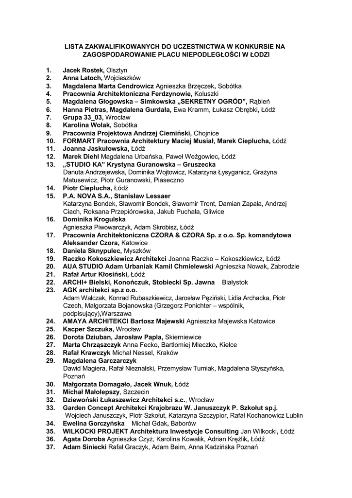 LISTA ZAKWALIFIKOWANYCH DO UCZESTNICTWA W KONKURSIE NA ZAGOSPODAROWANIE PLACU NIEPODLEGŁOŚCI W ŁODZI 1. 2. 3. 4. 5. 6. 7. 8. 9. 10. 11. 12. 13. 14. 15. 16. 17. 18. 19. 20. 21. 22. 23. 24. 25. 26. 27. 28. 29. 30. 31. 32. 33. 34. 35. 36. 37. Jacek Rostek, Olsztyn Anna Latoch, Wojcieszków Magdalena Marta Cendrowicz Agnieszka Brzęczek, Sobótka Pracownia Architektoniczna Ferdzynowie, Koluszki Magdalena Głogowska – Simkowska „SEKRETNY OGRÓD”, Rąbień Hanna Pietras, Magdalena Gurdała, Ewa Kramm, Łukasz Obrębki, Łódź Grupa 33_03, Wrocław Karolina Wolak, Sobótka Pracownia Projektowa Andrzej Ciemiński, Chojnice FORMART Pracownia Architektury Maciej Musiał, Marek Cieplucha, Łódź Joanna Jaskułowska, Łódź Marek Diehl Magdalena Urbańska, Paweł Weżgowiec, Łódź „STUDIO KA” Krystyna Guranowska – Gruszecka Danuta Andrzejewska, Dominika Wojtowicz, Katarzyna Łysyganicz, Grażyna Matusewicz, Piotr Guranowski, Piaseczno Piotr Cieplucha, Łódź P.A. NOVA S.A., Stanisław Lessaer Katarzyna Bondek, Sławomir Bondek, Sławomir Tront, Damian Zapała, Andrzej Ciach, Roksana Przepiórowska, Jakub Puchała, Gliwice Dominika Krogulska Agnieszka Piwowarczyk, Adam Skrobisz, Łódź Pracownia Architektoniczna CZORA & CZORA Sp. z o.o. Sp. komandytowa Aleksander Czora, Katowice Daniela Sknypulec, Myszków Raczko Kokoszkiewicz Architekci Joanna Raczko – Kokoszkiewicz, Łódź AUA STUDIO Adam Urbaniak Kamil Chmielewski Agnieszka Nowak, Zabrodzie Rafał Artur Kłosiński, Łódź ARCHI+ Bielski, Konończuk, Stobiecki Sp. Jawna Białystok AGK architekci sp.z o.o. Adam Walczak, Konrad Rubaszkiewicz, Jarosław Pęziński, Lidia Archacka, Piotr Czech, Małgorzata Bojanowska (Grzegorz Ponichter – wspólnik, podpisujący),Warszawa AMAYA ARCHITEKCI Bartosz Majewski Agnieszka Majewska Katowice Kacper Szczuka, Wrocław Dorota Dziuban, Jarosław Papla, Skierniewice Marta Chrząszczyk Anna Fecko, Bartłomiej Mleczko, Kielce Rafał Krawczyk Michał Nessel, Kraków Magdalena Garczarczyk Dawid Magiera, Rafał Nieznalski, Przemysław Turniak, Magdalena Styszyńska, Poznań Małgorzata Domagało, Jacek Wnuk, Łódź Michał Małolepszy, Szczecin Dziewoński Łukaszewicz Architekci s.c., Wrocław Garden Concept Architekci Krajobrazu W. Januszczyk P. Szkołut sp.j. Wojciech Januszczyk, Piotr Szkołut, Katarzyna Szczypior, Rafał Kochanowicz Lublin Ewelina Gorczyńska Michał Gdak, Baborów WILKOCKI PROJEKT Architektura Inwestycje Consulting Jan Wilkocki, Łódź Agata Doroba Agnieszka Czyż, Karolina Kowalik, Adrian Krężlik, Łódź Adam Siniecki Rafał Graczyk, Adam Beim, Anna Kadzińska Poznań 38. 39. 40. 41. 42. 43. 44. 45. Agata Sakson Łódź D44 sprl Agnieszka Gansiniec Belgia Łukasz Stawski Łódź „Maćków Pracownia Projektowa” Sp. z o.o. Zbigniew Maćków, Wrocław Jan Gorgul Architektura – Urbanistyka Sebastian Bielawski, Piotr Dróżka, Bartosz Chinalski Łódź konsorcjum: Filip Karczemski Eliza Dziewanowska, Maurizio Consanzi Warszawa Barysz Point Line Beata Barysz Andrzej Barysz Tychy +48 Pracownia Projektowa s.c. Szymon Brzezowski, Juliusz Erdman Wrocław