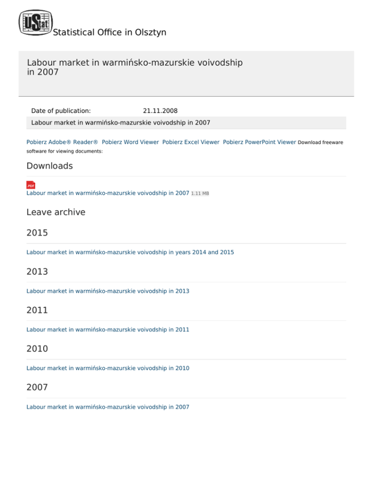 Statistical Office in Olsztyn Labour market in warmińsko-mazurskie voivodship in 2007 Date of publication: 21.11.2008 Labour market in warmińsko-mazurskie voivodship in 2007 Pobierz Adobe® Reader® Pobierz Word Viewer Pobierz Excel Viewer Pobierz PowerPoint Viewer Download freeware software for viewing documents: Downloads Labour market in warmińsko-mazurskie voivodship in 2007 1.11 MB Leave archive 2015 Labour market in warmińsko-mazurskie voivodship in years 2014 and 2015 2013 Labour market in warmińsko-mazurskie voivodship in 2013 2011 Labour market in warmińsko-mazurskie voivodship in 2011 2010 Labour market in warmińsko-mazurskie voivodship in 2010 2007 Labour market in warmińsko-mazurskie voivodship in 2007