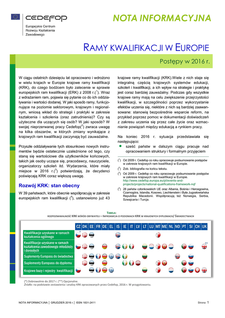 NOTA INFORMACYJNA RAMY KWALIFIKACJI W EUROPIE Postępy w 2016 r. W ciągu ostatnich dziesięciu lat opracowano i wdrożono w wielu krajach w Europie krajowe ramy kwalifikacji (KRK), do czego bodźcem było zalecenie w sprawie 1 europejskich ram kwalifikacji (ERK) z 2008 r.( ). Wraz z wdrażaniem ram, pojawia się pytanie co do ich oddziaływania i wartości dodanej. W jaki sposób ramy, funkcjonujące na poziomie sektorowym, krajowym i regionalnym, wniosą wkład do strategii i praktyki w zakresie kształcenia i szkolenia (oraz zatrudnienia)? Czy są użyteczne dla uczących się osób? W jaki sposób? W 2 swojej nieprzerwanej pracy Cedefop( ) zwraca uwagę na kilka obszarów, w których zmiany wynikające z krajowych ram kwalifikacji zaczynają być zauważalne. Przyszłe oddziaływanie tych stosunkowo nowych instrumentów będzie ostatecznie uzależnione od tego, czy staną się wartościowe dla użytkowników końcowych, takich jak osoby uczące się, pracodawcy, nauczyciele, organizatorzy szkoleń itd. Wydarzenia, które miały 3 miejsce w 2016 r.( ) potwierdzają, że decydenci poświęcają KRK coraz większą uwagę. Rozwój KRK: stan obecny W 39 państwach, które obecnie współpracują w zakresie 4 europejskich ram kwalifikacji ( ), ustanowiono już 43 krajowe ramy kwalifikacji (KRK).Wiele z nich staje się integralną częścią krajowych systemów edukacji, szkoleń i kwalifikacji, a ich wpływ na strategie i praktykę jest coraz bardziej zauważalny. Podczas gdy wszystkie krajowe ramy mają na celu zwiększenie przejrzystości kwalifikacji, w szczególności poprzez wykorzystanie efektów uczenia się, niektóre z nich są bardziej zaawansowane: stanowią bezpośrednie wsparcie reform, na przykład poprzez pomoc w dokumentacji doświadczeń z zakresu uczenia się przez całe życie oraz wzmacnianie powiązań między edukacją a rynkiem pracy. Na koniec 2016 r. sytuacja przedstawiała się następująco: sześć państw w dalszym ciągu pracuje nad opracowaniem struktury i formalnym przyjęciem (1) Od 2009 r. Cedefop co roku opracowuje podsumowanie postępów w zakresie krajowych ram kwalifikacji w Europie. (2) Zob. bibliografia na końcu tekstu. (3) Od 2009 r. Cedefop co roku opracowuje podsumowanie postępów w zakresie krajowych ram kwalifikacji w Europie. http://www.cedefop.europa.eu/pl/events-andprojects/projects/national-qualifications-framework-nqf (4) 28 państw członkowskich UE oraz Albania, Bośnia i Hercegowina, Czarnogóra, Islandia, Kosowo, Liechtenstein i Była Jugosłowiańska Republika Macedonii. Współpracują też Norwegia, Serbia, Szwajcaria i Turcja. TABELA: ROZPOZNAWALNOŚĆ KRK WŚRÓD OBYWATELI – INFROAMCJA O POZIOMACH KRK W KRAJOWYCH DYPLOMACH/ ŚWIADECTWACH (*) Dobrowolnie do 2017 r. (**) Opcjonalne. Źródło: na podstawie zestawienia i analizy KRK opracowanych przez Cedefop, 2016 r. W przygotowaniu. NOTA INFORMACYJNA │ GRUDZIEŃ 2016 r.│ ISSN 1831-2411 Strona 1 swoich KRK. Spośród państw, które w 2008 r. dołączyły do współpracy na rzecz ERK, Finlandia, Hiszpania i Włochy zakończyły już prace lub już przyjęły ramy. Przewiduje się, że Finlandia przyjmie swoje ramy na początku 2017 r.; Włochy ustanowiły już krajowy wykaz kwalifikacji, 5 obejmujący ramy kwalifikacji regionalnych ( ). Hiszpania jest na ukończeniu prac nad ramami dotyczącymi uczenia się przez całe życie. Państwa, które dołączyły do współpracy na rzecz ERK w ciągu ostatnich dwóch lat (takie jak Albania, Bośnia i Hercegowina oraz Serbia), w dalszym ciągu pracują nad strukturą i (częściowo) nad formalnym przyjęciem lub przeglądem ich KRK; 32 państwa formalnie przyjęły swoje ramy. W ostatnim czasie ramy zostały przyjęte w polityce publicznej i ustawodawstwie w Austrii (marzec 2016 r.), w Polsce (styczeń 2016 r.), w Słowenii (grudzień 2015 r.) i w Szwecji (październik 2015 r.); formalne przyjęcie ram pozwoliło państwom na przejście do etapu operacyjnego, na którym ramy zaczynają praktyczne funkcjonowanie. Wiele państw, na przykład Austria, Chorwacja, Cypr, Czarnogóra, Grecja, Islandia, Kosowo, Luksemburg, Była Jugosłowiańska Republika Macedonii, Polska, Szwecja, Węgry i Turcja, nadal jest na wczesnym etapie operacyjnym. Państwa te muszą zwiększyć zdolności zaangażowanych instytucji, ukończyć prace nad niektórymi narzędziami, na przykład nad bazami danych lub procedurami zapewniania jakości, bądź przyjąć regulaminy lub ukończyć przypisywanie kwalifikacji do poziomów ram. Belgia (Walonia) i Bułgaria przyjęły formalnie swoje ramy, ale ich wdrożenie nadal jest na wczesnym etapie. Wiele innych państw, takich jak Belgia (Flandria), Dania, Estonia, Francja, Irlandia, Malta, Niderlandy, Niemcy, Norwegia, Portugalia, Słowenia, Szwajcaria i Zjednoczone Królestwo, osiągnęło bardziej zaawansowany etap operacyjny. Ich ramy uzyskały dosyć dużą rozpoznawalność i są już dobrze zintegrowane z krajowymi systemami kwalifikacji, zapewniając wszechstronną mapę krajowych kwalifikacji opartą o efekty uczenia się i stanowiąc punkt odniesienia dla rozwoju kwalifikacji i ich przeglądów; 6 35 państw ( ) prowadzi prace nad kompleksowymi (5) W dekrecie 13/2013 ustanowiono krajowy wykaz kwalifikacji uzyskiwanych w ramach systemu edukacji i szkolenia oraz kwalifikacji zawodowych, który składa się z sześciu różnych sekcji, w tym z ram kwalifikacji dla szkolnictwa wyższego i krajowych ram kwalifikacji regionalnych. W chwili obecnej dostępne są tylko trzy sekcje. Aby uzyskać więcej informacji, zob. http://nrpitalia.isfol.it/sito_standard/sito_demo/atlante_repertori.php. (6) 4 państwa wprowadziły częściowe KRK obejmujące ograniczony zakres rodzajów i poziomów kwalifikacji lub składające się z NOTA INFORMACYJNA │ GRUDZIEŃ 2016 r.│ ISSN 1977-8007 krajowymi ramami kwalifikacji obejmującymi wszystkie rodzaje i poziomy kwalifikacji (podobnie jak w 2015 r.); 28 państw przedstawiło spra