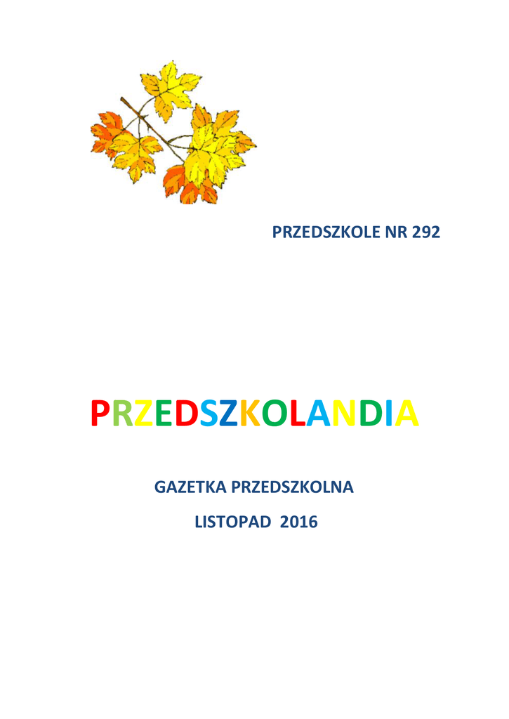 PRZEDSZKOLE NR 292 PRZEDSZKOLANDIA GAZETKA PRZEDSZKOLNA LISTOPAD 2016 KILKA SŁÓW OD PANI DYREKTOR Jesiennie witam w naszym numerze gazetki. Jesień idzie przez park Jesień, liść ostatni już spadł. Jesień, deszcz zmył butów Twych ślad. Jesień idzie ku mnie przez park. Wczoraj, minął miesiąc, jak list Przyniósł mi listonosz, a dziś Tylko nosi liście tu wiatr. Szanowni Rodzice. Wkraczamy w okres chłodów proszę, więc o dostosowanie ubrań do temperatury na dworze. Darowizna Do tej pory z darowizn zostały zakupione 2 huśtawki do ogrodu, zabawki do grup dziecięcych, prezenty na Pasowanie dla maluchów, comiesięczne teatrzyki. Do zakupienia zostały prezenty na Mikołaja, opłacenie imprezy na Mikołaja, domek na podwórko (poprzedni domek już się wysłużył i został zdemontowany). Sukcesywnie, w miarę napływu pieniędzy na konto darowizn, będziemy realizować powyższe plany. Z góry dziękuję za wszystkie wpłaty na darowiznę. Serdecznie pozdrawiam. B. Wyszyńska- Duch 4 listopada 2016r. w naszym Przedszkolu będziemy obchodzić Dzień Postaci z Bajek w związku z tym bardzo prosimy, aby dzieci tego dnia przyniosły zabawkę, przedmiot lub element stroju nawiązujący do ulubionej bajki. GRUPA I (MALUCHY) W tym roku grupa Maluszków liczy 20 dzieci /9 dziewczynek i 11 chłopców/. U większości proces adaptacyjny dobiegł już końca – dotyczy to szczególnie tych dzieci, które od września regularnie uczęszczają do przedszkola. Dzieci przyzwyczaiły się już do warunków panujących w przedszkolu, uczestniczą w zajęciach dydaktycznych, nawiązują kontakty z rówieśnikami, nie obawiają się już innych pracowników placówki, np. pana kucharza, pani logopedy lub wychowawczyni sąsiedniej grupy, nauczyły się harmonogramu dnia i wiedzą kiedy zostaną odebrane. Niestety po każdej dłuższej nieobecności proces adaptacyjny może rozpocząć się od nowa, toteż nie dziwmy się, gdy dziecko, które bez problemu już zostawało w przedszkolu, po chorobie zaczyna rozpaczać podczas porannego rozstania. Co się wydarzyło? 6.09 - odbyło się zebranie informacyjne dla rodziców, mam nadzieję, iż pamiętają Państwo o naszych ustaleniach: uzupełniacie ubranka w szafeczkach, abyśmy mogły przebrać dzieci w razie takiej potrzeby raz w miesiącu przynosicie dużą paczkę chusteczek higienicznych co dwa tygodnie w piątek zabieracie piżamki do prania dbacie o to, aby poinformować nas o każdej zmianie Waszego numeru telefonu. 26.09 - odbyły się zajęcia integracyjne z grupami II, III i IV „Powitanie Jesieni” były tańce, zabawy ruchowe, zagadki i konkursy 29.09 - odbyło się uroczyste Pasowanie na przedszkolaka. Bardzo cieszymy się, że Państwo tak licznie przybyli na uroczystość. Mamy nadzieję, iż kolejne imprezy spotkają się z podobnym zainteresowaniem z Państwa strony. 30.09 - w przedszkolu odbył się teatrzyk „O krokodylu Puszku’’ 4.10 - dzieci obejrzały przedstawienie pt. „Zapasy wiewiórki Basi” W najbliższym czasie: 28.10.2016r. zapraszamy chętnych rodziców na zajęcia otwarte pt. „Jesienne zabawy z duszkami” 4.11.2016r. całe Przedszkole będzie obchodziło Dzień Postaci z Bajek 8.11.2016r. będziemy uczestniczyć w warsztatach mydlanych Zapraszamy Państwa do udziału w akcjach: /szczegóły na plakatach w przedszkolnym korytarzu/ „Pełna miska dla schroniska” – zbieramy karmę dla zwierząt mieszkających w schronisku w Celestynowie „Góra grosza” – zbieramy monety-grosze dla dzieci z domów dziecka Ponadto zachęcam do przyłączenie się do akcji Zakretki.info - pomagamy nie tylko przyrodzie. Akcja polega na zbieraniu plastikowych zakrętek z butelek po wodzie mineralnej, napojach, sokach, butelek z chemii gospodarczej i kosmetyków, które nie zawierają dodatkowych elementów takich jak uszczelki, tekturki, gumki, styropianiki, folijki. Zbieramy tylko i wyłącznie plastikowe zakrętki. Środki uzyskane w ramach zbiórki plastikowych zakrętek przekazane są na zakup sprzętu rehabilitacyjnego dla niepełnosprawnych dzieci podopiecznych Fundacji Bez Tajemnic /kosz do, którego można wrzucać zakrętki stoi w przedszkolnym korytarzu/ Agnieszka Wodzińska GRUPA II (ŚREDNIAKI) Witamy Państwa jesiennie w pierwszym w tym roku szkolnym wydaniu naszej gazetki. Nasza klasa liczy obecnie dwadzieścia pięć osób (czyli mamy komplet ). W grupie są nowe dzieci, które już się zaadaptowały. Oto skrót ostatnich wydarzeń: 06.09. odbyło się zebranie z Rodzicami 20.09. wraz z Mamą Mateusza upiekliśmy ciasto 22.09. zostaliśmy zaproszeni przez Seniorów na piknik. Były zabawy, pieczone ziemniaki i kiełbaski z grilla 26.09 przybyła do nas Pani Jesień. Poszliśmy na pobliski stragan po jesienne warzywno - owocowe zakupy 27.09. wraz z Mamą Mateusza upiekliśmy pizzę z warzywami 28.09. Mama Oli czytała nam książeczki po śniadaniu 30.09. oraz 04.10. przybył do nas teatrzyk 04.10. spacerowaliśmy po okolicy w poszukiwaniu kasztanów 06.10. Mama Maksia czytała nam książeczki 12.10 Helenka M. wzięła udział w konkursie plastycznym o Kubusiu Puchatku Wiewiórka Ruda wiewiórka, ruda wiewiórka skacze wesoło z drzewa na drzewo. Z chwiejnej gałązki w zieleń da nurka, machnie ogonkiem w prawo i w lewo. Zeszła na ziemię, nic się nie boi, wie, że orzeszki mamy w kieszonkach. O, z ręki bierze! O, przy mnie stoi chwiejąc puszystym końcem ogonka. Nikt jej nie skrzywdzi, nikt jej nie spłoszy taka jest śliczna, zręczna i żywa! Zjadła orzeszków za kilka groszy, na pożegnanie ogonkiem kiwa. W. Broniewski Nadal zachęcamy Państwa do wzięcia udziału w akcji Cała Polska Czyta Dzieciom. Przypominamy, że przed szatnią stoi koszyk, do którego można wrzucać niepotrzebne okulary korekcyjne i słoneczne. 27- go października jedziemy do teatru Piwnica na Wójtowskiej na spektakl „Dawno, dawno temu”. W listopadzie natomiast udamy się do Planetarium. Przypominamy o koni