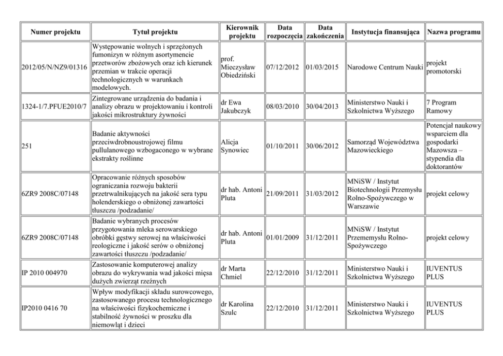 Numer projektu Tytuł projektu Występowanie wolnych i sprzężonych fumonizyn w różnym asortymencie przetworów zbożowych oraz ich kierunek 2012/05/N/NZ9/01316 przemian w trakcie operacji technologicznych w warunkach modelowych. Zintegrowane urządzenia do badania i 1324-1/7.PFUE2010/7 analizy obrazu w projektowaniu i kontroli jakości mikrostruktury żywności 251 6ZR9 2008C/07148 6ZR9 2008C/07148 IP 2010 004970 IP2010 0416 70 Badanie aktywności przeciwdrobnoustrojowej filmu pullulanowego wzbogaconego w wybrane ekstrakty roślinne Opracowanie różnych sposobów ograniczania rozwoju bakterii przetrwalnikujących na jakość sera typu holenderskiego o obniżonej zawartości tłuszczu /podzadanie/ Badanie wybranych procesów przygotowania mleka serowarskiego obróbki gęstwy serowej na właściwości reologiczne i jakość serów o obniżonej zawartości tłuszczu /podzadanie/ Zastosowanie komputerowej analizy obrazu do wykrywania wad jakości mięsa dużych zwierząt rzeźnych Wpływ modyfikacji składu surowcowego, zastosowanego procesu technologicznego na właściwości fizykochemiczne i stabilność żywności w proszku dla niemowląt i dzieci Kierownik projektu Data Data rozpoczęcia zakończenia Instytucja finansująca Nazwa programu prof. Mieczysław Obiedziński 07/12/2012 01/03/2015 Narodowe Centrum Nauki projekt promotorski dr Ewa Jakubczyk 08/03/2010 30/04/2013 Ministerstwo Nauki i Szkolnictwa Wyższego 7 Program Ramowy Samorząd Województwa Mazowieckiego Potencjał naukowy wsparciem dla gospodarki Mazowsza – stypendia dla doktorantów Alicja Synowiec 01/10/2011 30/06/2012 dr hab. Antoni 21/09/2011 31/03/2012 Pluta MNiSW / Instytut Biotechnologii Przemysłu projekt celowy Rolno-Spożywczego w Warszawie dr hab. Antoni 01/01/2009 31/12/2011 Pluta MNiSW / Instytut Przememysłu RolnoSpożywczego projekt celowy dr Marta Chmiel 22/12/2010 31/12/2011 Ministerstwo Nauki i Szkolnictwa Wyższego IUVENTUS PLUS dr Karolina Szulc 22/12/2010 31/12/2011 Ministerstwo Nauki i Szkolnictwa Wyższego IUVENTUS PLUS IP2010042470 IP2011 013371 LIDER/23/109/L2/NCBiR/2011 N N312 068639 N N 209 107693 N N 312 068439 N N311 405239 N N312 068038 N N312 068739 N N312 077238 Wykorzystanie spektroskopii FTIR do oceny zawartości antocyjanów w produktach mleczno-owocowych Wpływ substancji hydrofobowych na właściwości fizyczne filmów z naturalnych polimerów Analiza rynku teksturotwórczych dodatków do żywności w Polsce oraz metod zagospodarowania odpadów przemysłu owocowo-warzywnego /podzadanie/ Wykorzystanie właściwości betalaktoglobuliny do wiązania palmitynianu retinylu i cholekalcyferolu w celu uzyskania dodatków do żywności wzbogacających produkty o obniżonej zawartości tłuszczu w witaminy A i D Badania nad możliwościami wykorzystania drożdży w procesach syntezy estrów organicznych Badania nad otrzymaniem zamienników tłuszczu mleka matki na drodze enzymatycznego przeestryfikowania i ich technologicznym zastosowaniem Wpływ roślinnego kokcydiostatyku na wyniki produkcyjne oraz jakość mięsa kurcząt szybko i wolno rosnących Właściwości przeciwdrobnoustrojowe powłok pullulanowych wzbogaconych ekstraktami z roślin leczniczych i aromatycznych Badania nad zastosowaniem komputerowej analizy obrazu do wykrywania wady PSE mięsa wieprzowego Otrzymywanie, charakterystyka i badanie dr Iwona Ścibisz 22/12/2010 31/03/2012 Ministerstwo Nauki i Szkolnictwa Wyższego IUVENTUS PLUS dr Sabina Galus 09/04/2012 15/02/2015 Ministerstwo Nauki i Szkolnictwa Wyższego IUVENTUS PLUS dr Justyna Cybulska 08/11/2011 31/01/2012 Instytut Agrofizyki PAN LIDER dr Agata Górska 04/11/2010 08/11/2012 Ministerstwo Nauk i Szkolnictwa Wyższego projekt własny prof. dr hab. Ewa Białecka- 03/11/2010 02/11/2013 Florjańczyk Ministerstwo Nauki i Szkolnictwa Wyższego projekt własny dr Joanna Bryś 27/10/2010 26/10/2012 Ministerstwo Nauki i Szkolnictwa Wyższego projekt własny prof. Jan Niemiec 26/10/2010 25/10/2012 Minister Nauki i Szkolnictwa Wyższego projekt własny prof. dr hab. Małgorzata Gniewosz 15/03/2010 14/03/2013 Ministerstwo Nauki i Szkolnictwa Wyższego projekt własny 20/09/2010 19/09/2012 Narodowe Centrum Nauki projekt promotorski 28/04/2010 27/07/2014 Narodowe Centrum Nauki projekt własny prof. dr hab. Mirosław Słowiński dr Anna N N312 082238 N N312 093939 N N312 114238 N N312 117438 N N312 121739 N N312 122539 N N312 123939 N N312 125139 N N312 125339 wpływu wybranych biopolimerów na przebieg procesu rekrystalizacji w układach modelowych i lodach spożywczych Modyfikacja składu i właściwości tłuszczu drobiowego poprzez przeestryfikowanie chemiczne i enzymatyczne Badania nad wykorzystaniem wybranych szczepów bakterii octowych do otrzymania preparatu komórkowego o aktywności katalitycznej dehydrogenazy glicerolowej Wpływ izolacji skrobi z nasion roślin strączkowych i modyfikacji hydrotermicznej na udział skrobi wolno trawionej i skrobi opornej Studia nad wpływem operacji wstępnych przed suszeniem tkanki roślinnej na wybrane właściwości suszu Studia nad zastosowaniem chromatograficznej identyfikacji bakterii fermentacji mlekowej w ocenie funkcjonalności mlecznych napojów probiotycznych Badanie wpływu wyselekcjonowanych szczepów bakterii kwasu mlekowego i drożdży, jako starterów fermentacji ciasta, na jakość chleba żytniego KamińskaDwórznicka Analiza wybranych metod oceny jakości tłuszczów smażalniczych w Polsce Badania nad obecnością polibromowanych eterów bifenylowych oraz polichlorowanych bifenyli w tłuszczu mlecznym Stabilność antocyjanów borówki wysokiej prof. Bolesław 16/03/2010 15/03/2013 Kowalski Narodwe Centrum Badań projekt i Rozwoju promotorski dr hab. Stanisław Błażejak 25/01/2010 24/04/2012 Ministerstwo Nauki i Szkolnictwa Wyższego projekt promotorski dr Małgorzata 07/05/2010 06/08/2012 Piecyk Ministerstwo Nauki i Szkolnictwa Wyższego projekt własny prof. Dorota WitrowaRajchert 09/04/2010 30/09/2013 Narodwe Ce