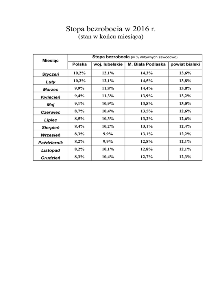 Stopa bezrobocia w 2016 r. (stan w końcu miesiąca) Miesiąc Stopa bezrobocia (w % aktywnych zawodowo) Polska woj. lubelskie M. Biała Podlaska powiat bialski Styczeń 10,2% 12,1% 14,3% 13,6% Luty 10,2% 12,1% 14,5% 13,8% Marzec 9,9% 11,8% 14,4% 13,8% Kwiecień 9,4% 11,3% 13,9% 13,2% Maj 9,1% 10,9% 13,8% 13,0% Czerwiec 8,7% 10,4% 13,5% 12,6% Lipiec 8,5% 10,3% 13,2% 12,6% Sierpień 8,4% 10,2% 13,1% 12,4% Wrzesień 8,3% 9,9% 13,1% 12,2% Październik 8,2% 9,9% 12,8% 12,1% Listopad 8,2% 10,1% 12,8% 12,1% Grudzień 8,3% 10,4% 12,7% 12,3%