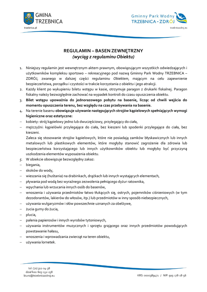 REGULAMIN – BASEN ZEWNĘTRZNY (wyciąg z regulaminu Obiektu) 1. Niniejszy regulamin jest wewnętrznym aktem prawnym, obowiązującym wszystkich odwiedzających i użytkowników kompleksu sportowo – rekreacyjnego pod nazwą Gminny Park Wodny TRZEBNICA – ZDRÓJ, zwanego w dalszej części regulaminu Obiektem, mającym na celu zapewnienie bezpieczeństwa, porządku i czystości w trakcie korzystania z obiektu i jego atrakcji. 2. Każdy klient po wykupieniu biletu wstępu w kasie, otrzymuje paragon z drukarki fiskalnej. Paragon fiskalny należy bezwzględnie zachować na wypadek kontroli do czasu opuszczenia obiektu. 3. Bilet wstępu upoważnia do jednorazowego pobytu na basenie, licząc od chwili wejścia do momentu opuszczenia terenu, bez względu na czas przebywania na basenie. 4. Na terenie basenu obowiązuje używanie następujących strojów kąpielowych spełniających wymogi higieniczne oraz estetyczne:  kobiety: strój kąpielowy jedno lub dwuczęściowy, przylegający do ciała,  mężczyźni: kąpielówki przylegające do ciała, bez kieszeni lub spodenki przylegające do ciała, bez kieszeni. Zaleca się stosowanie strojów kąpielowych, które nie posiadają zamków błyskawicznych lub innych metalowych lub plastikowych elementów, które mogłyby stanowić zagrożenie dla zdrowia lub bezpieczeństwa korzystającego lub innych użytkowników obiektu lub mogłyby być przyczyną uszkodzenia elementów wyposażenia obiektu. 5. W obiekcie obowiązuje bezwzględny zakaz:  biegania,  skoków do wody,  wieszania się (huśtania) na drabinkach, drążkach lub innych wystających elementach,  pływania pod wodą bez wyraźnego zezwolenia pełniącego dyżur ratownika,  wpychania lub wrzucania innych osób do basenów,  wnoszenia i używania przedmiotów łatwo tłukących się, ostrych, pojemników ciśnieniowych (w tym dezodorantów, lakierów do włosów, itp.) lub przedmiotów w inny sposób niebezpiecznych,  używania wulgaryzmów i słów powszechnie uznanych za obelżywe,  żucia gumy do żucia,  plucia,  palenia papierosów i innych wyrobów tytoniowych,  używania instrumentów muzycznych i sprzętu grającego oraz innych przedmiotów powodujących powstawanie hałasu,  wnoszenia i wprowadzania zwierząt na teren obiektu,  używania lornetek. 6. W obiekcie obowiązuje bezwzględny zakaz wnoszenia, posiadania, spożywania lub udostępniania alkoholu oraz wszelkich innych środków odurzających. 7. W przypadku uzasadnionego podejrzenia, że osoba korzystająca /chcąca skorzystać z obiektu znajduje się w stanie wskazującym na spożycie alkoholu, obsługa obiektu może zwrócić się do takiej osoby z prośbą o poddanie się badaniu alkomatem. Odmowa poddania się takiemu badaniu uzasadnia odmowę wstępu na teren obiektu lub wydalenie z obiektu. 8. Dzieci do lat 12 powinny znajdować się pod stałą opieką osób pełnoletnich. 9. Dzieci oraz osoby dorosłe korzystające z pieluch są zobowiązane do posiadania jednorazowych pieluch przeznaczonych specjalnie do kąpieli. Rodzice /opiekunowie prawni ponoszą pełną odpowiedzialność za pozostające pod ich opieką dzieci lub osoby oraz ewentualne szkody przez nie spowodowane. 10. Klient ponosi odpowiedzialność za każdą szkodę na osobie i mieniu powstałą na skutek jego zawinionego działania lub zaniechania, polegającego na nieodpowiednim korzystaniu z obiektu i urządzeń znajdujących się na jego terenie lub też na nieodpowiednim zachowaniu podczas użytkowania urządzeń w basenie i na terenie obiektu. 11. Wypadki i szkody powstałe na terenie obiektu należy niezwłocznie zgłaszać jego obsłudze. 12. Administracja Gminnego Parku Wodnego TRZEBNICA – ZDRÓJ zaleca nie wnoszenie na teren obiektu cennych przedmiotów i większych sum pieniędzy. Przedmioty wartościowe klienci mogą przechowywać w szafkach depozytowych zlokalizowanych przy punkcie kasowym w holu obiektu. 13. Niecki basenowe oraz atrakcje wodne objęte są na terenie obiektu dozorem Ratowników Wodnych. Osoby korzystające z basenu i atrakcji wodnych zobowiązane są do podporządkowania się nakazom Ratowników Wodnych pełniących dyżur oraz personelu obiektu. Sygnałem do natychmiastowego wyjścia z wody jest trzykrotny sygnał gwizdka. Po usłyszeniu sygnału należy opuścić nieckę i oczekiwać na dalsze polecenia Ratowników Wodnych lub personelu. W przypadku złej pogody – wyładowań atmosferycznych i burzy osoby korzystające z basenu i atrakcji wodnych mają obowiązek opuścić niecki basenowe.