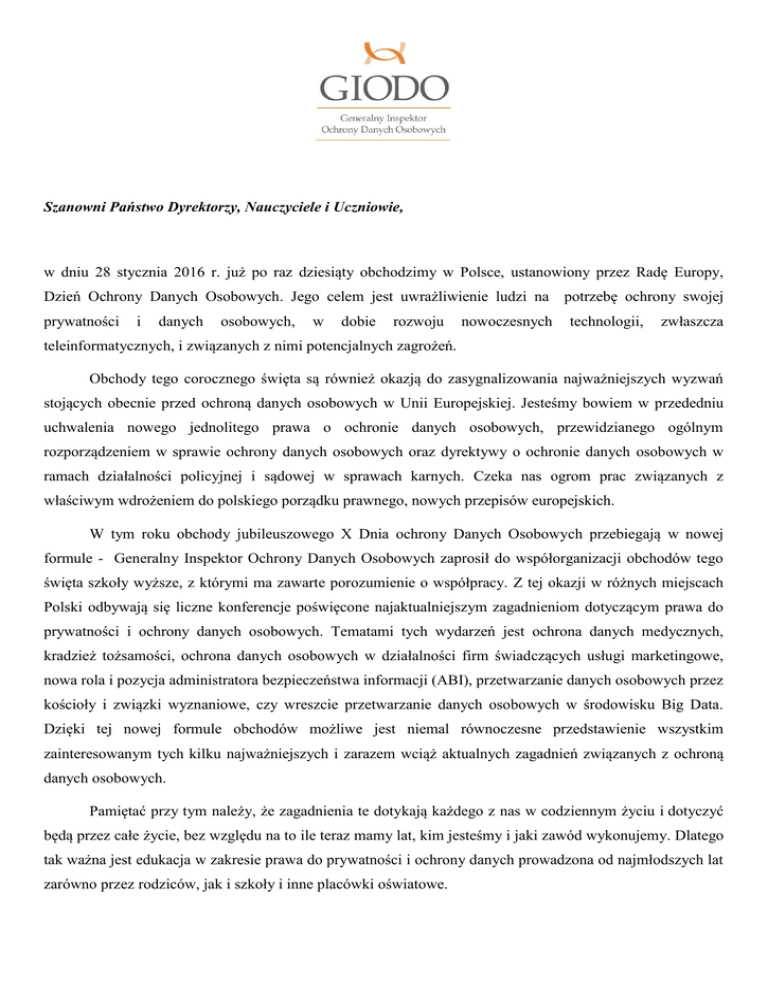 Szanowni Państwo Dyrektorzy, Nauczyciele i Uczniowie, w dniu 28 stycznia 2016 r. już po raz dziesiąty obchodzimy w Polsce, ustanowiony przez Radę Europy, Dzień Ochrony Danych Osobowych. Jego celem jest uwrażliwienie ludzi na potrzebę ochrony swojej prywatności i danych osobowych, w dobie rozwoju nowoczesnych technologii, zwłaszcza teleinformatycznych, i związanych z nimi potencjalnych zagrożeń. Obchody tego corocznego święta są również okazją do zasygnalizowania najważniejszych wyzwań stojących obecnie przed ochroną danych osobowych w Unii Europejskiej. Jesteśmy bowiem w przededniu uchwalenia nowego jednolitego prawa o ochronie danych osobowych, przewidzianego ogólnym rozporządzeniem w sprawie ochrony danych osobowych oraz dyrektywy o ochronie danych osobowych w ramach działalności policyjnej i sądowej w sprawach karnych. Czeka nas ogrom prac związanych z właściwym wdrożeniem do polskiego porządku prawnego, nowych przepisów europejskich. W tym roku obchody jubileuszowego X Dnia ochrony Danych Osobowych przebiegają w nowej formule - Generalny Inspektor Ochrony Danych Osobowych zaprosił do współorganizacji obchodów tego święta szkoły wyższe, z którymi ma zawarte porozumienie o współpracy. Z tej okazji w różnych miejscach Polski odbywają się liczne konferencje poświęcone najaktualniejszym zagadnieniom dotyczącym prawa do prywatności i ochrony danych osobowych. Tematami tych wydarzeń jest ochrona danych medycznych, kradzież tożsamości, ochrona danych osobowych w działalności firm świadczących usługi marketingowe, nowa rola i pozycja administratora bezpieczeństwa informacji (ABI), przetwarzanie danych osobowych przez kościoły i związki wyznaniowe, czy wreszcie przetwarzanie danych osobowych w środowisku Big Data. Dzięki tej nowej formule obchodów możliwe jest niemal równoczesne przedstawienie wszystkim zainteresowanym tych kilku najważniejszych i zarazem wciąż aktualnych zagadnień związanych z ochroną danych osobowych. Pamiętać przy tym należy, że zagadnienia te dotykają każdego z nas w codziennym życiu i dotyczyć będą przez całe życie, bez względu na to ile teraz mamy lat, kim jesteśmy i jaki zawód wykonujemy. Dlatego tak ważna jest edukacja w zakresie prawa do prywatności i ochrony danych prowadzona od najmłodszych lat zarówno przez rodziców, jak i szkoły i inne placówki oświatowe. Nadrzędnym celem działań edukacyjnych, wychowawczych oraz opiekuńczych szkół i placówek oświatowych, jest wszechstronny rozwój ucznia, wykształcenie w nim umiejętności wykorzystywania zdobytej wiedzy poprzez kreowanie potrzebnych doświadczeń i nawyków, a także uczenie odpowiedzialności za dokonywane przez siebie wybory. Zadaniem szkoły jest również wzmożenie poczucia odpowiedzialności rodziców za wychowanie pozostających pod Waszą opieką dzieci, między innymi poprzez wskazywanie na niebezpieczeństwa płynące z niekontrolowanego korzystania przez nich z sieci oraz innych zdobyczy nowoczesnych technologii. Wsparciem dla tego zadania szkoły jest z powodzeniem realizowany od kilku lat przez Generalnego Inspektora Ochrony Danych Osobowych ogólnopolski program edukacyjny „Twoje dane – twoja sprawa. Skuteczna ochrona danych osobowych. Inicjatywa edukacyjna skierowana do uczniów i nauczycieli”. Jego podstawowym celem jest podniesienie kompetencji pedagogów w obszarze kształtowania wśród uczniów, świadomości i wiedzy związanej z ochroną danych osobowych i prawem do prywatności. Program ten realizowany jest pod patronatem Ministra Edukacji Narodowej i Rzecznika Praw Dziecka, nieprzerwanie od 2009 roku. W takim dniu, jak Dzień Ochrony Danych Osobowych staramy się wszystkim przypominać, że skuteczna ochrony danych osobowych jest procesem dynamicznym, uwarunkowanym wieloma czynnikami zmiennymi w czasie i zależnym od przestrzeni społecznej zajmowanej przez każdego z nas. I dlatego właśnie wymaga ustawicznego kształcenia i ciągłego doskonalenia umiejętności rozpoznawania i radzenia sobie z zagrożeniami, jakie dla prawa do prywatności i ochrony danych osobowych niesie rozwój nowoczesnych technologii. To jest zadanie dla współczesnej nowoczesnej szkoły - otwartej na nowe oferty edukacyjne i programy, i która dzięki nim jest w stanie stworzyć optymalne warunki dla realizacji tych zamierzeń. Ogólnopolski program edukacyjny „Twoje dane – twoja sprawa. Skuteczna ochrona danych osobowych. Inicjatywa edukacyjna skierowana do uczniów i nauczycieli” idealnie wpisuje się w realizację tej idei. Co więcej, program ten był inspiracją dla uruchomionego w 2014 roku i koordynowanego przez Biuro Generalnego Inspektora Ochrony Danych Osobowych, projektu ARCADES, pod nazwą „Wprowadzenie kwestii związanych z ochroną danych oraz prywatności do szkół w Unii Europejskiej”, który dzięki środkom Komisji Europejskiej przeniósł ideę ogólnopolskiego programu „Twoje dane – twoja sprawa…” na grunt europejski. Coroczne święto Dnia Ochrony Danych Osobowych ma za zadanie uświadomić nam, jak nowoczesne technologie wpływają na nasze codzienne życie, jak cenna jest nasza prywatność i dlaczego warto jej strzec we współczesnym, szybko rozwijającym się świecie. Dzień Ochrony Danych Osobowych to również okazja do refleksji na temat tego, jak bezpiecznie korzystać z osiągnięć nowoczesnych technologii i świadomie unikać zagrożeń. Dziękując za Państwa zaangażowanie z realizację obecnej edycji Programu „Twoje dane – twoja sprawa”, życzę Państwu wielu inspirujących pomysłów na inicjatywy edukacyjne, które pobudzą dzieci i młodzież do tej właśnie refleksji. Z serdecznymi pozdrowieniami, Dr Edyta Bielak-Jomaa Generalny Inspektor Ochrony Danych Osobowych