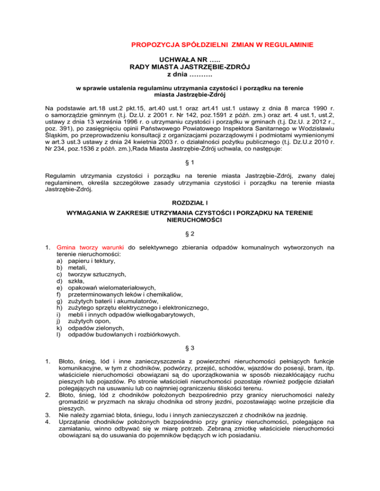 PROPOZYCJA SPÓŁDZIELNI ZMIAN W REGULAMINIE UCHWAŁA NR ….. RADY MIASTA JASTRZĘBIE-ZDRÓJ z dnia ………. w sprawie ustalenia regulaminu utrzymania czystości i porządku na terenie miasta Jastrzębie-Zdrój Na podstawie art.18 ust.2 pkt.15, art.40 ust.1 oraz art.41 ust.1 ustawy z dnia 8 marca 1990 r. o samorządzie gminnym (t.j. Dz.U. z 2001 r. Nr 142, poz.1591 z późń. zm.) oraz art. 4 ust.1, ust.2, ustawy z dnia 13 września 1996 r. o utrzymaniu czystości i porządku w gminach (t.j. Dz.U. z 2012 r., poz. 391), po zasięgnięciu opinii Państwowego Powiatowego Inspektora Sanitarnego w Wodzisławiu Śląskim, po przeprowadzeniu konsultacji z organizacjami pozarządowymi i podmiotami wymienionymi w art.3 ust.3 ustawy z dnia 24 kwietnia 2003 r. o działalności pożytku publicznego (t.j. Dz.U.z 2010 r. Nr 234, poz.1536 z późń. zm.),Rada Miasta Jastrzębie-Zdrój uchwala, co następuje: §1 Regulamin utrzymania czystości i porządku na terenie miasta Jastrzębie-Zdrój, zwany dalej regulaminem, określa szczegółowe zasady utrzymania czystości i porządku na terenie miasta Jastrzębie-Zdrój. ROZDZIAŁ l WYMAGANIA W ZAKRESIE UTRZYMANIA CZYSTOŚCI I PORZĄDKU NA TERENIE NIERUCHOMOŚCI §2 1. Gmina tworzy warunki do selektywnego zbierania odpadów komunalnych wytworzonych na terenie nieruchomości: a) papieru i tektury, b) metali, c) tworzyw sztucznych, d) szkła, e) opakowań wielomateriałowych, f) przeterminowanych leków i chemikaliów, g) zużytych baterii i akumulatorów, h) zużytego sprzętu elektrycznego i elektronicznego, i) mebli i innych odpadów wielkogabarytowych, j) zużytych opon, k) odpadów zielonych, l) odpadów budowlanych i rozbiórkowych. §3 1. 2. 3. 4. Błoto, śnieg, lód i inne zanieczyszczenia z powierzchni nieruchomości pełniących funkcje komunikacyjne, w tym z chodników, podwórzy, przejść, schodów, wjazdów do posesji, bram, itp. właściciele nieruchomości obowiązani są do uporządkowania w sposób niezakłócający ruchu pieszych lub pojazdów. Po stronie właścicieli nieruchomości pozostaje również podjęcie działań polegających na usuwaniu lub co najmniej ograniczeniu śliskości terenu. Błoto, śnieg, lód z chodników położonych bezpośrednio przy granicy nieruchomości należy gromadzić w pryzmach na skraju chodnika od strony jezdni, pozostawiając wolne przejście dla pieszych. Nie należy zgarniać błota, śniegu, lodu i innych zanieczyszczeń z chodników na jezdnię. Uprzątanie chodników położonych bezpośrednio przy granicy nieruchomości, polegające na zamiataniu, winno odbywać się w miarę potrzeb. Zebraną zmiotkę właściciele nieruchomości obowiązani są do usuwania do pojemników będących w ich posiadaniu. 5. Uprzątanie innych zanieczyszczeń z terenu nieruchomości, w tym zalegających odpadów, jak również inne prace porządkowe, w tym usuwanie chwastów, koszenie trawy, winno być prowadzone przez właścicieli nieruchomości na bieżąco. §4 1. Mycie pojazdów mechanicznych poza myjniami dozwolone jest wyłącznie na terenie nieruchomości niesłużącym do użytku publicznego pod warunkiem, że wykonywane jest to na utwardzonej ich części, a powstające ścieki odprowadzane są do kanalizacji sanitarnej lub gromadzone w szczelnych zbiornikach bezodpływowych. 2. Naprawa pojazdów mechanicznych związana z ich bieżącą eksploatacją dozwolona jest na terenie nieruchomości pod warunkiem, że nie spowoduje to zanieczyszczenia środowiska oraz uciążliwości dla właścicieli sąsiednich nieruchomości a powstałe odpady zostaną zagospodarowane zgodnie z przepisami prawa. ROZDZIAŁ II RODZAJE I MINIMALNA POJEMNOŚĆ POJEMNIKÓW PRZEZNACZONYCH DO ZBIERANIA ODPADÓW KOMUNALNYCH, WARUNKI ICH ROZMIESZCZENIA ORAZ UTRZYMANIA W ODPOWIEDNIM STANIE SANITARNYM, PORZĄDKOWYM I TECHNICZNYM §5 1. Gmina na zasadach określonych w odrębnej uchwale zapewnia wyposażenie nieruchomości, na których zamieszkują mieszkańcy w pojemniki służące do gromadzenia odpadów komunalnych o pojemności uwzględniającej częstotliwość i sposób pozbywania się odpadów z nieruchomości z uwzględnieniem wymienionych poniżej zasad oraz utrzymywanie tych pojemników w odpowiednim stanie sanitarnym porządkowym i technicznym. Uzasadnienie Art. 3.2. pkt 1 Ustawy o utrzymaniu czystości i porządku w gminach stanowi, że gminy tworzą warunki do wykonywania prac związanych z utrzymaniem czystości i porządku. Artykuł 6r ust. 3 Ustawy stanowi, że rada gminy określi w drodze uchwały stanowiącej akt prawa miejscowego, szczegółowy sposób i zakres świadczenia usług w zakresie odbierania odpadów komunalnych od właścicieli nieruchomości zagospodarowania tych odpadów, w zamian za uiszczoną opłatę. Również art. 6r ust. 4 tej ustawy stanowi, że rada gminy może określić w drodze uchwały stanowiącej akt prawa miejscowego, rodzaje dodatkowych usług świadczonych przez gminę oraz wysokość cen za te usługi. Podjęcie uchwały w tym zakresie ma na celu wyposażenie nieruchomości w jednolite pojemniki. Taki zapis pozwoli również zapewnić komplet dobrych pojemników w przypadku oddania do naprawy zepsutego pojemnika lub oddania ich do dezynfekcji oraz minimalizację opłat w wyniku przetargu zorganizowanego przez gminę. Nad tym najlepiej zapanuje firma wyłoniona w drodze przetargu ogłoszonego przez Gminę. W związku powyższym należy tak ustalić opłatę , aby zawierała również wyposażenie nieruchomości w pojemniki wraz z ich obsługą techniczną i eksploatacyjną. Opłata ta może być częścią opłaty za wywóz odpadów lub występować jako oddzielna pozycja o opłatach miesięcznych. Dzięki temu każdy właściciel, w tym właściciel nieruchomości jednorodzinnej może , ale nie musi skorzystać z dodatkowej usługi dostawy i utrzymania pojemników. 2.Pojemniki służące do zbierania odpadów komunalnych na terenie gminy: a) kosze uliczne o pojemności od 20 l do 60 l, 