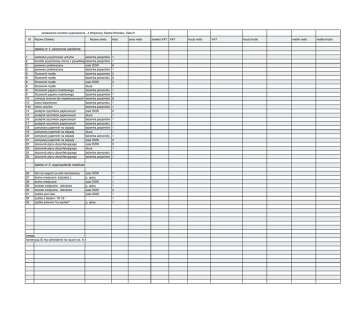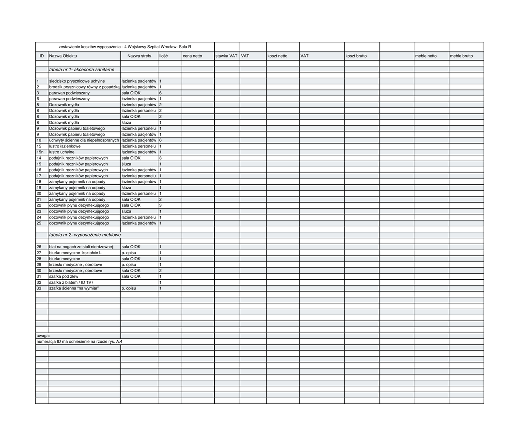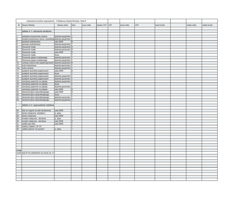 zestawienie kosztów wyposażenia - 4 Wojskowy Szpital Wrocław- Sala R ID Nazwa Obiektu Nazwa strefy Ilość tabela nr 1- akcesoria sanitarne 1 2 3 6 8 8 8 8 9 9 10 15 15n 14 15 16 17 18 19 20 21 22 23 24 25 siedzisko prysznicowe uchylne brodzik prysznicowy równy z posadzką parawan podwieszany parawan podwieszany Dozownik mydła Dozownik mydła Dozownik mydła Dozownik mydła Dozownik papieru toaletowego Dozownik papieru toaletowego uchwyty ścienne dla niepełnospranych lustro łazienkowe lustro uchylne podajnik ręczników papierowych podajnik ręczników papierowych podajnik ręczników papierowych podajnik ręczników papierowych zamykany pojemnik na odpady zamykany pojemnik na odpady zamykany pojemnik na odpady zamykany pojemnik na odpady dozownik płynu dezynfekującego dozownik płynu dezynfekującego dozownik płynu dezynfekującego dozownik płynu dezynfekującego łazienka pacjentów łazienka pacjentów sala OIOK łazienka pacjentów łazienka pacjentów łazienka personelu sala OIOK śluza łazienka personelu łazienka pacjentów łazienka pacjentów łazienka personelu łazienka pacjentów sala OIOK śluza łazienka pacjentów łazienka personelu łazienka pacjentów śluza łazienka personelu sala OIOK sala OIOK śluza łazienka personelu łazienka pacjentów 1 1 6 1 2 2 2 1 1 1 6 1 1 3 1 1 1 1 1 1 2 3 1 1 1 sala OIOK p. opisu sala OIOK p. opisu sala OIOK sala OIOK 1 1 1 1 2 1 1 1 tabela nr 2- wyposażenie meblowe 26 27 28 29 30 31 32 33 blat na nogach ze stali nierdzewnej biurko medyczne kształcie L biurko medyczne krzesło medyczne , obrotowe krzesło medyczne , obrotowe szafka pod zlew szafka z blatem / ID 19 / szafka ścienna “na wymiar” p. opisu uwaga: numeracja ID ma odniesienie na rzucie rys. A.4 cena netto stawka VAT VAT koszt netto VAT koszt brutto meble netto meble brutto