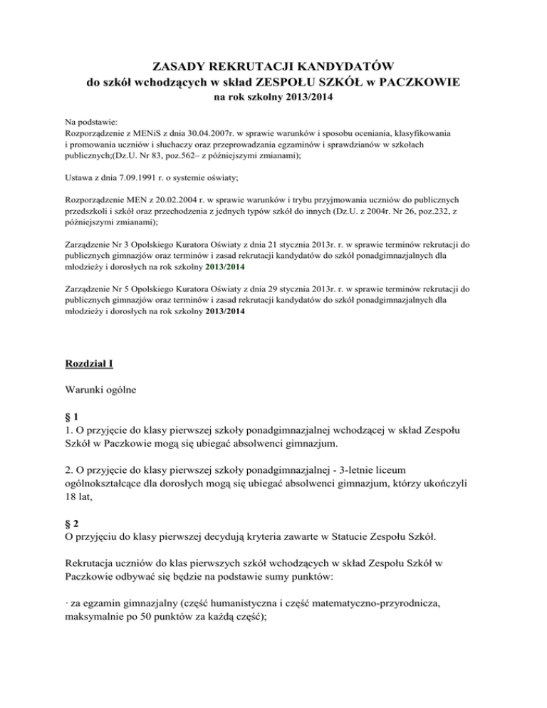 ZASADY REKRUTACJI KANDYDATÓW do szkół wchodzących w skład ZESPOŁU SZKÓŁ w PACZKOWIE na rok szkolny 2013/2014 Na podstawie: Rozporządzenie z MENiS z dnia 30.04.2007r. w sprawie warunków i sposobu oceniania, klasyfikowania i promowania uczniów i słuchaczy oraz przeprowadzania egzaminów i sprawdzianów w szkołach publicznych;(Dz.U. Nr 83, poz.562– z późniejszymi zmianami); Ustawa z dnia 7.09.1991 r. o systemie oświaty; Rozporządzenie MEN z 20.02.2004 r. w sprawie warunków i trybu przyjmowania uczniów do publicznych przedszkoli i szkół oraz przechodzenia z jednych typów szkół do innych (Dz.U. z 2004r. Nr 26, poz.232, z późniejszymi zmianami); Zarządzenie Nr 3 Opolskiego Kuratora Oświaty z dnia 21 stycznia 2013r. r. w sprawie terminów rekrutacji do publicznych gimnazjów oraz terminów i zasad rekrutacji kandydatów do szkół ponadgimnazjalnych dla młodzieży i dorosłych na rok szkolny 2013/2014 Zarządzenie Nr 5 Opolskiego Kuratora Oświaty z dnia 29 stycznia 2013r. r. w sprawie terminów rekrutacji do publicznych gimnazjów oraz terminów i zasad rekrutacji kandydatów do szkół ponadgimnazjalnych dla młodzieży i dorosłych na rok szkolny 2013/2014 Rozdział I Warunki ogólne §1 1. O przyjęcie do klasy pierwszej szkoły ponadgimnazjalnej wchodzącej w skład Zespołu Szkół w Paczkowie mogą się ubiegać absolwenci gimnazjum. 2. O przyjęcie do klasy pierwszej szkoły ponadgimnazjalnej - 3-letnie liceum ogólnokształcące dla dorosłych mogą się ubiegać absolwenci gimnazjum, którzy ukończyli 18 lat, §2 O przyjęciu do klasy pierwszej decydują kryteria zawarte w Statucie Zespołu Szkół. Rekrutacja uczniów do klas pierwszych szkół wchodzących w skład Zespołu Szkół w Paczkowie odbywać się będzie na podstawie sumy punktów: · za egzamin gimnazjalny (część humanistyczna i część matematyczno-przyrodnicza, maksymalnie po 50 punktów za każdą część); · punktów uzyskanych za oceny z języka polskiego i trzech wybranych obowiązkowych zajęć edukacyjnych; Sposób przeliczania na punkty ocen z języka polskiego i 3 wybranych przez szkołę obowiązkowych zajęć edukacyjnych: 1. język polski ocena celujący: 21 pkt. bardzo dobry 18 pkt. dobry 14 pkt. dostateczny 10 pkt. dopuszczający 4 pkt. 2. każdy z trzech wybranych przedmiotów: ocena celujący: 18 pkt. bardzo dobry 16 pkt. dobry 12 pkt. dostateczny 8 pkt. dopuszczający 2 pkt. · Punktów uzyskanych za inne osiągnięcia umieszczone na świadectwie gimnazjalnym kandydat może uzyskać maksymalnie 25 pkt podzielonych według następujących zasad: a) inne osiągnięcia umieszczone na świadectwie gimnazjalnym kandydat może uzyskać maksymalnie 25 pkt podzielonych według następujących zasad: 1) ukończenie gimnazjum z wyróżnieniem 6 pkt. 2) udział w konkursach wymienionych w Rozdz. II, § 5, · na szczeblu wojewódzkim 3 pkt., · na szczeblu ponadwojewódzkim 5 pkt. 3) laureaci i finaliści ogólnopolskich olimpiad przedmiotowych oraz laureaci konkursów o zasięgu wojewódzkim i ponadwojewódzkim, których program obejmuje w całości lub poszerza treści podstawy programowej co najmniej jednego przedmiotu przyjmowani są do wybranej szkoły ponadgimnazjalnej niezależnie od kryteriów zawartych w statucie szkoły. 4) osiągnięcia sportowe lub artystyczne: · na szczeblu powiatowym (miejsca od I do III) 1 pkt., · na szczeblu wojewódzkim (miejsca od I do III) 2 pkt., · na szczeblu ponadwojewódzkim (miejsca od I do VI) 3 pkt. 5) dodatkowe osiągnięcia takie jak: · wzorowa ocena zachowania 1 pkt., · udział w zajęciach kulturalno – artystycznych 1 pkt., · uznana praca w samorządzie szkolnym 1 pkt., · stała udokumentowana działalność na rzecz innych ludzi, zwłaszcza w formie wolontariatu – aktywna współpraca z domem dziecka, hospicjum, schroniskiem dla zwierząt, organizacjami charytatywnymi itp. – 2 pkt. Uczniowie gimnazjum, którzy w roku 3. Przyjmuje się maksymalną liczbę punktów, za wyniki egzaminu w ostatniej klasie gimnazjum, ustaloną przez Okręgową Komisję Egzaminacyjną. 4.Maksymalna liczba punktów za egzamin może wynieść 100 tj. po 50 pkt maksymalnie za każdą z części tego egzaminu. 5. Maksymalna liczba punktów za oceny na świadectwa oraz inne osiągnięcia to 100 pkt. Rozdział II Kwalifikowanie kandydatów do szkół działających w Zespole Szkół w Paczkowie §1 1. O przyjęciu kandydata do klasy pierwszej szkoły ponadgimnazjalnej dla młodzieży, kończącej się egzaminem maturalnym decyduje suma punktów, o których mowa w rozdz. I, par. 2. 2. Rekrutacyjna wysokość progu punktowego wynosi: dla kandydatów do liceum ogólnokształcącego - 80 punktów; dla kandydatów do technikum - 80 punktów; dla kandydatów do szkoły zasadniczej - bez limitu punktów. 3. Ostateczną wysokość progu punktowego ustala Komisja Rekrutacyjna po zapoznaniu się z liczbą kandydatów w stosunku do liczby wolnych miejsc. §2 1. O przyjęciu kandydata do klasy pierwszej trzyletniego Liceum Ogólnokształcącego dla Dorosłych, decyduje pozytywny wynik rozmowy kwalifikacyjnej. 2. Dyrektor szkoły, o których mowa w ust.1. może odstąpić od przeprowadzenia egzaminu wstępnego lub rozmowy kwalifikacyjnej, jeżeli liczba kandydatów jest mniejsza lub równa liczbie wolnych miejsc, którymi dysponuje szkoła. §3 O przyjęciu kandydata do klasy pierwszej Zasadniczej Szkoły Zawodowej decyduje przedłożenie świadectwa ukończenia gimnazjum oraz zaświadczenia z zakładu pracy o przyjęciu na praktyczną naukę zawodu. §4 Kandydaci ubiegający się o przyjęcie do klasy pierwszej szkoły zawodowej oraz technikum powinni posiadać zaświadczenie lekarskie o braku przeciwwskazań zdrowotnych do kształcenia w określonym zawodzie, wydane na podstawie odrębnych przepisów u pracodawcy. Szczegółowe zasady organizacji i finansowania zajęć praktycznych w zakładach pracy, a także przysługujące uczniom z tytułu świadczonej 