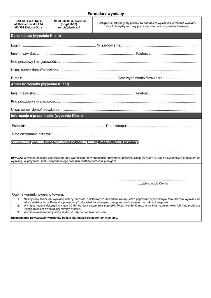 Formularz wymiany Bolf Sp. z o.o. Sp.k. ul. Kożuchowska 20A 65-364 Zielona Góra Tel: 68 888 03 33 (wew. 3) (pn-pt, 8-16) [email protected] Uwaga! Nie przyjmujemy paczek za pobraniem wysłanych w ramach wymiany. Zwrot pieniędzy możliwy jest wyłącznie poprzez przelew bankowy Dane klienta (wypełnia Klient) Login: …........................................................................ Nr zamówienia: …........................................................................ Imię i nazwisko: …................................................................................................ Telefon: …............................................ Kod pocztowy i miejscowość: …......................................................................................................................................... Ulica, numer domu/mieszkania: …..................................................................................................................................... E-mail: …............................................................................................ Data wypełnienia formularza: …............................. Adres do wysyłki (wypełnia Klient) Imię i nazwisko: …................................................................................................ Telefon: …............................................ Kod pocztowy i miejscowość: …......................................................................................................................................... Ulica, numer domu/mieszkania: …..................................................................................................................................... Informacje o przedmiocie (wypełnia Klient) Produkt: …........................................................................... Data zakupu: …............................................................... Data otrzymania przesyłki: ….............................................. Zamawiany produkt chcę wymienić na (podaj markę, model, kolor, rozmiar): …....................................................................................................................................................................................... UWAGA! Wymiana zostanie zrealizowana pod warunkiem, że w momencie otrzymania przesyłki sklep DENLEY.PL będzie dysponował produktem na wymianę. W przypadku braku odpowiedniego produktu zostaną zwrócone pieniądze. ….........................…...................................... czytelny podpis Klienta Ogólne warunki wymiany towaru: 1. 2. 3. Nieużywany towar na wymianę należy przesłać z dołączonym dowodem zakupu oraz poprawnie wypełnionym formularzem wymiany na adres siedziby firmy. Przesyłka powinna być odpowiednio zabezpieczona przed uszkodzeniem w trakcie transportu. Wymiany można dokonać w ciągu 30 dni od daty otrzymania przesyłki. Towar wymienić można na inny rozmiar, kolor lub inny produkt z uwzględnieniem ewentualnej różnicy w cenie. Wymiana realizowana jest do 14 dni od daty otrzymania przesyłki. Niespełnienie powyższych warunków będzie skutkować odrzuceniem wymiany.