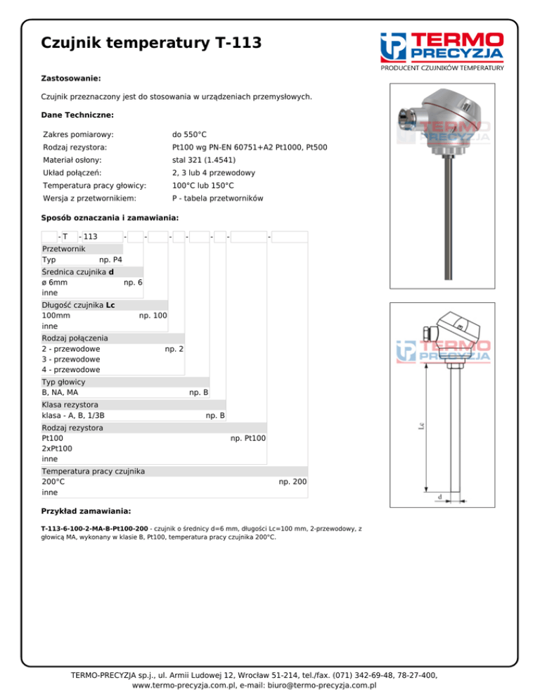 Czujnik temperatury T-113 Zastosowanie: Czujnik przeznaczony jest do stosowania w urządzeniach przemysłowych. Dane Techniczne: Zakres pomiarowy: do 550°C Rodzaj rezystora: Pt100 wg PN-EN 60751+A2 Pt1000, Pt500 Materiał osłony: stal 321 (1.4541) Układ połączeń: 2, 3 lub 4 przewodowy Temperatura pracy głowicy: 100°C lub 150°C Wersja z przetwornikiem: P - tabela przetworników Sposób oznaczania i zamawiania: -T - 113 Przetwornik Typ - - - - - - - np. P4 Średnica czujnika d ø 6mm inne np. 6 Długość czujnika Lc 100mm inne np. 100 Rodzaj połączenia 2 - przewodowe 3 - przewodowe 4 - przewodowe Typ głowicy B, NA, MA Klasa rezystora klasa - A, B, 1/3B Rodzaj rezystora Pt100 2xPt100 inne Temperatura pracy czujnika 200°C inne np. 2 np. B np. B np. Pt100 np. 200 Przykład zamawiania: T-113-6-100-2-MA-B-Pt100-200 - czujnik o średnicy d=6 mm, długości Lc=100 mm, 2-przewodowy, z głowicą MA, wykonany w klasie B, Pt100, temperatura pracy czujnika 200°C. TERMO-PRECYZJA sp.j., ul. Armii Ludowej 12, Wrocław 51-214, tel./fax. (071) 342-69-48, 78-27-400, www.termo-precyzja.com.pl, e-mail: [email protected]